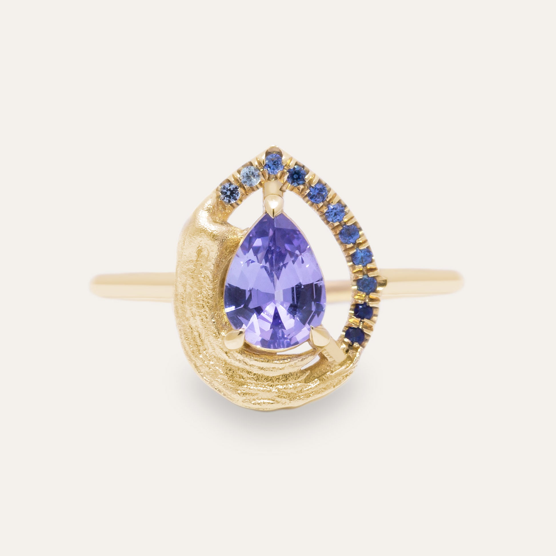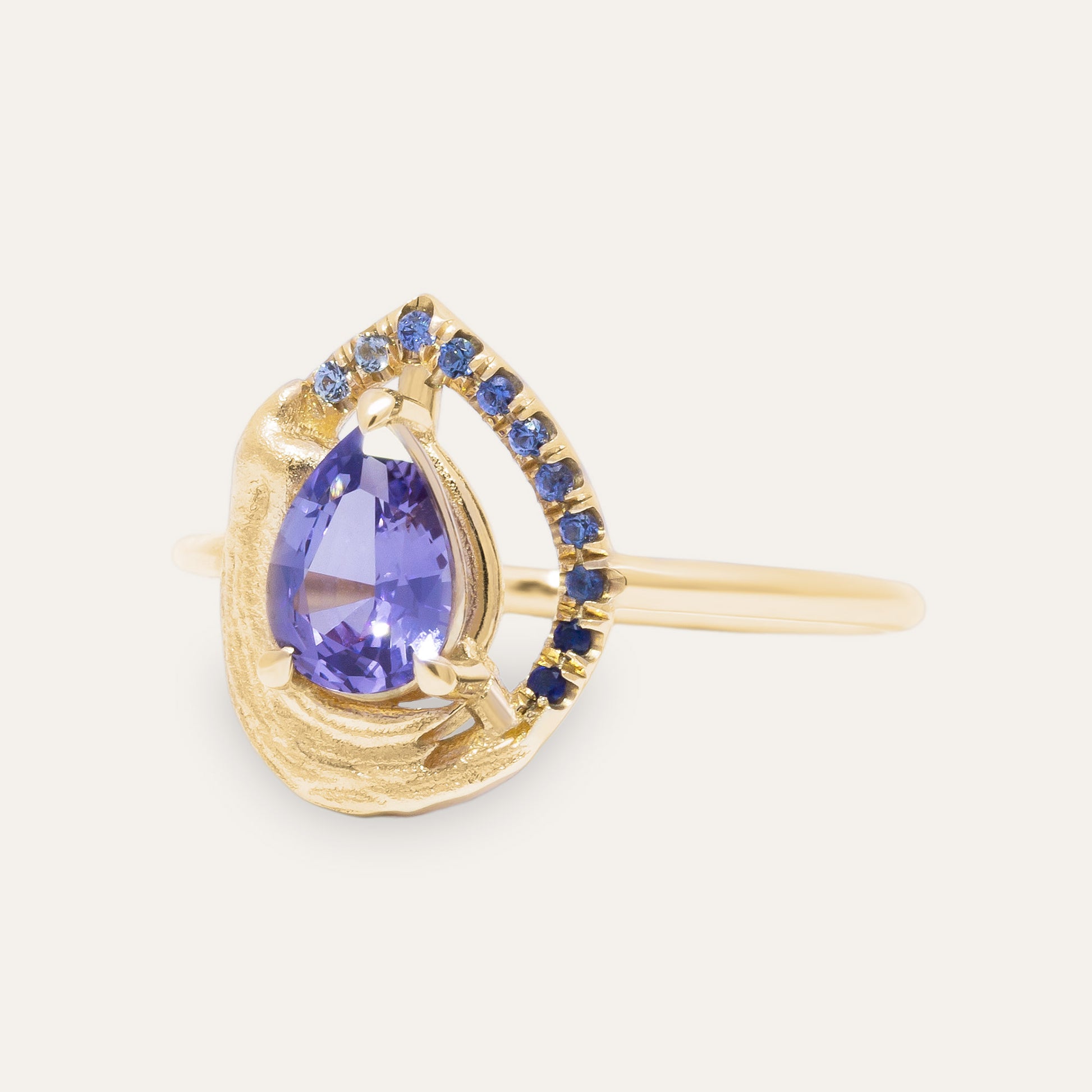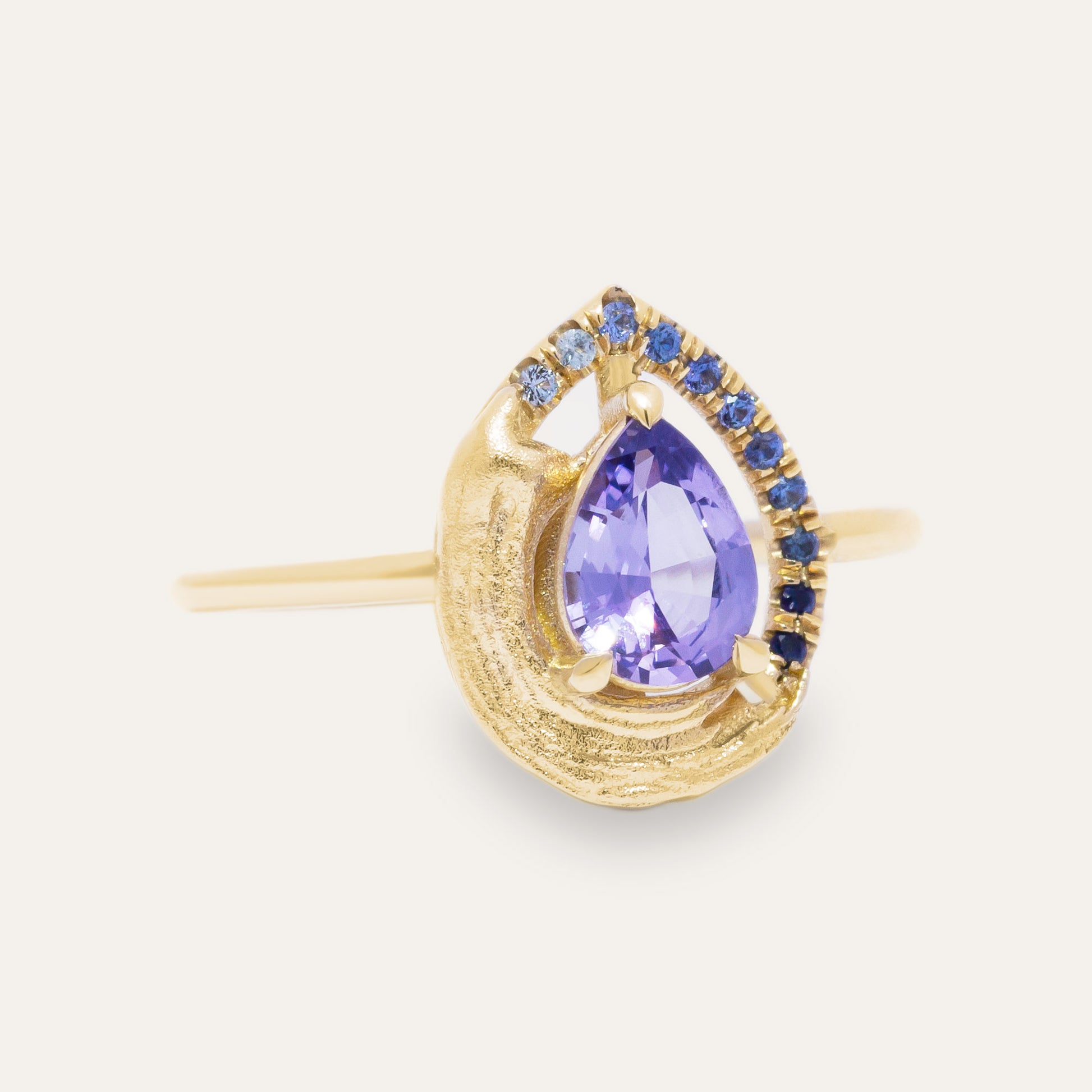 Anthraquinone is a singular masterpiece, representing artistic expression. Its bold, single-brushstroke texture echoes the deliberate strokes of a painter’s hand, while a gradient of blue sapphires elegantly frames the centerpiece – a purple, brilliant-cut pear-shaped sapphire. This unconventional halo serves as a vivid testament to individuality and beauty beyond tradition, celebrating the artistry of the extraordinary.