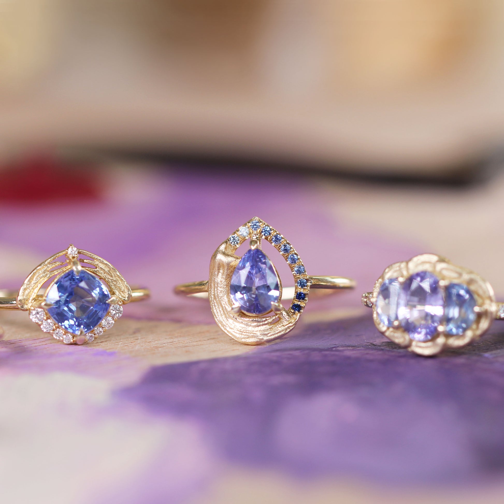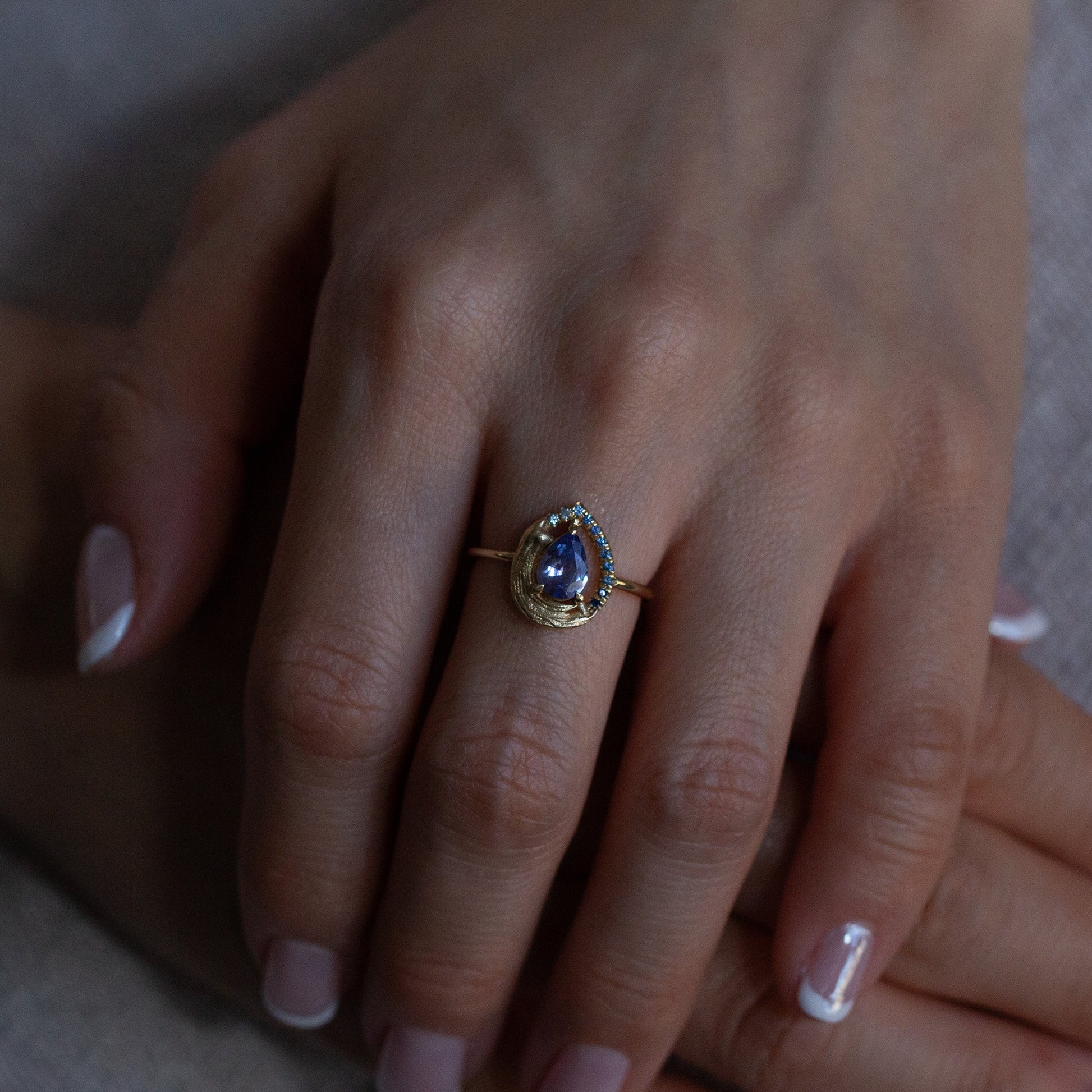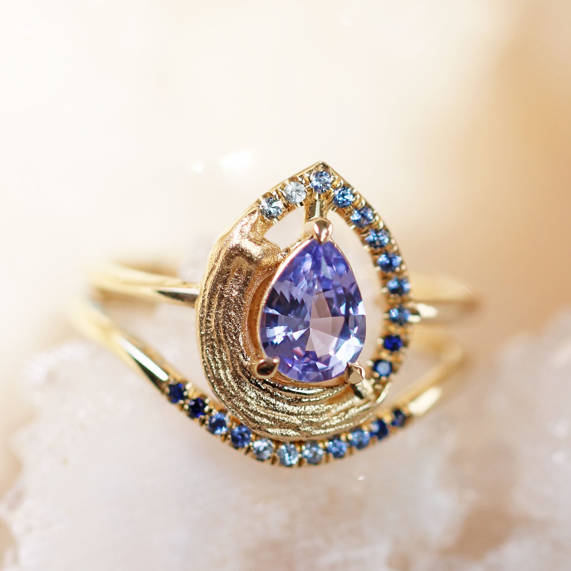 Anthraquinone is a singular masterpiece, representing artistic expression. Its bold, single-brushstroke texture echoes the deliberate strokes of a painter’s hand, while a gradient of blue sapphires elegantly frames the centerpiece – a purple, brilliant-cut pear-shaped sapphire. This unconventional halo serves as a vivid testament to individuality and beauty beyond tradition, celebrating the artistry of the extraordinary.