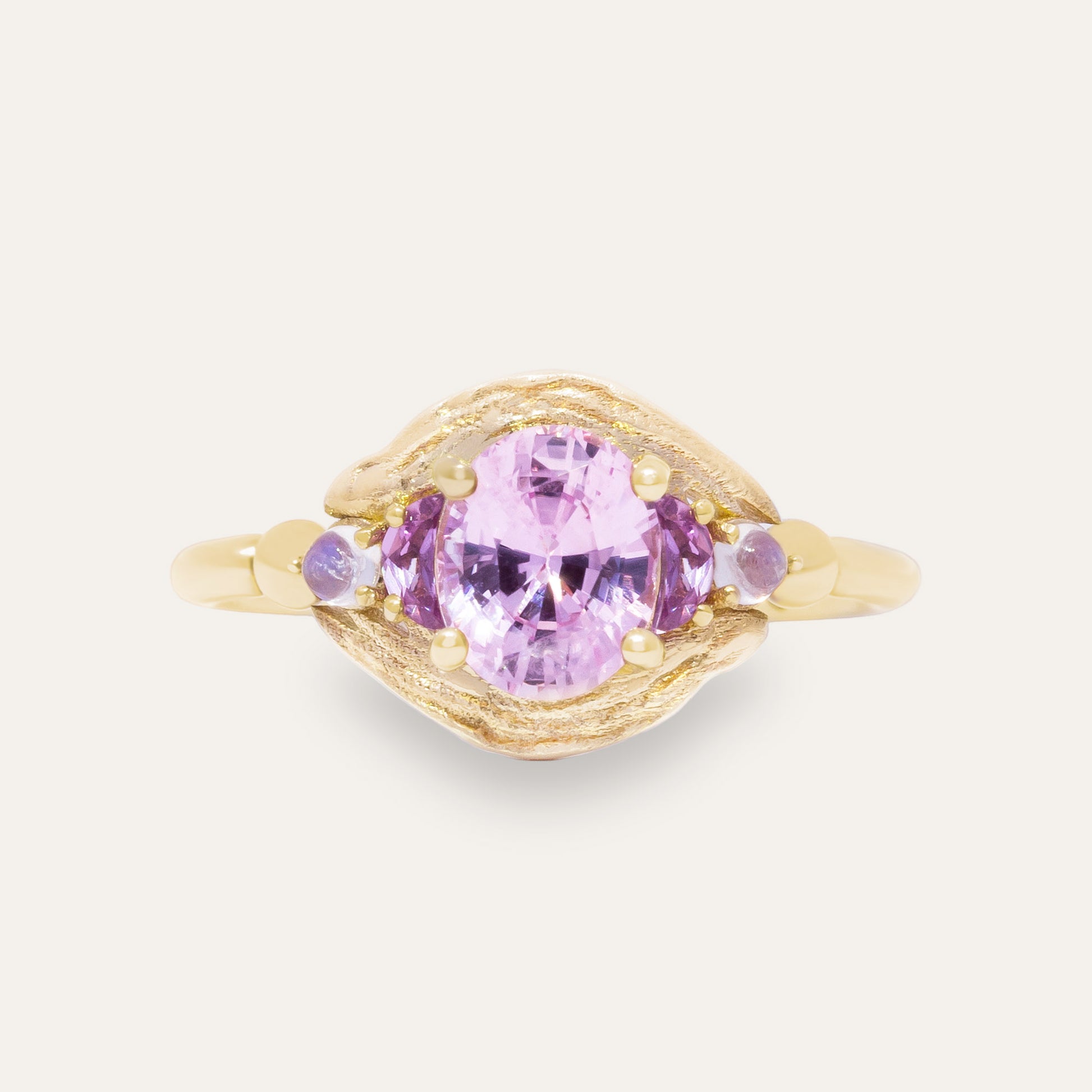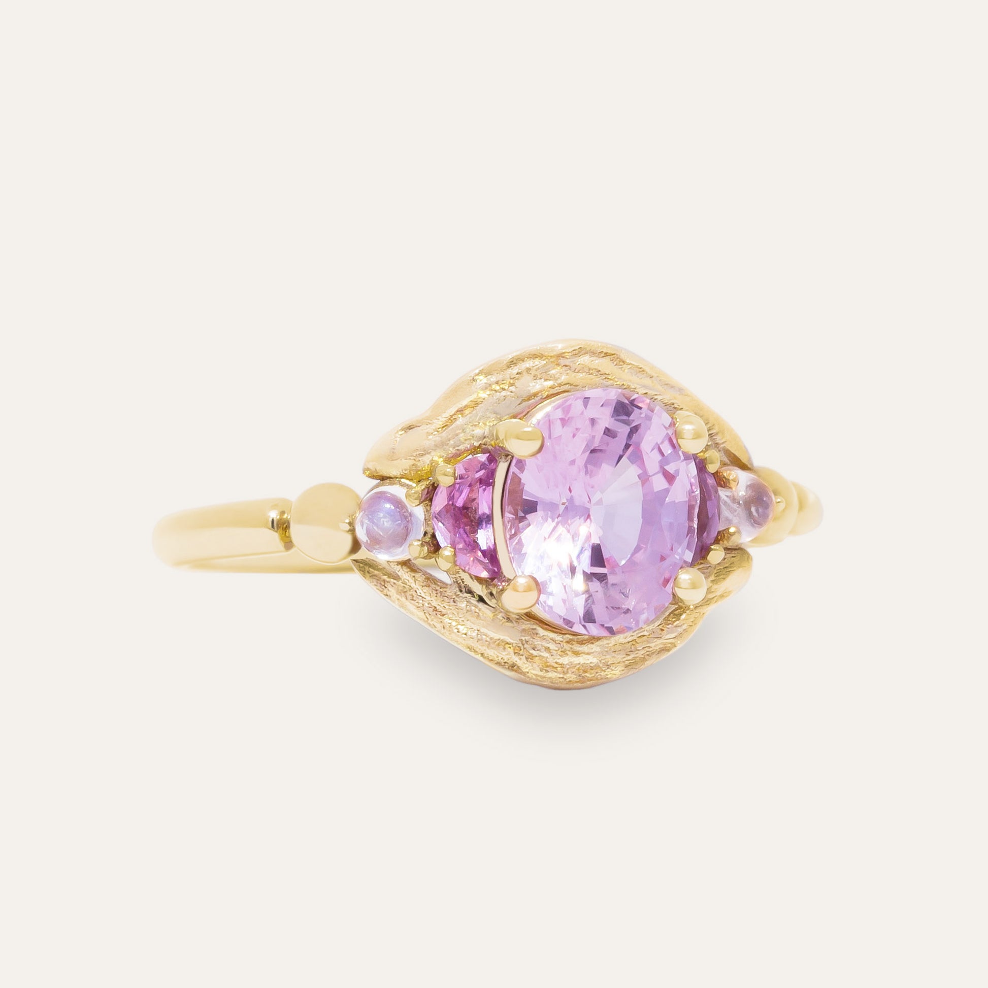Drops of gold, the moon, and two bold brushstrokes unite to form a radiant composition. Like the delicate beauty of a pink iceberg rose in full bloom, this enchanting piece is designed to celebrate your feminine creativity with luminous elegance.