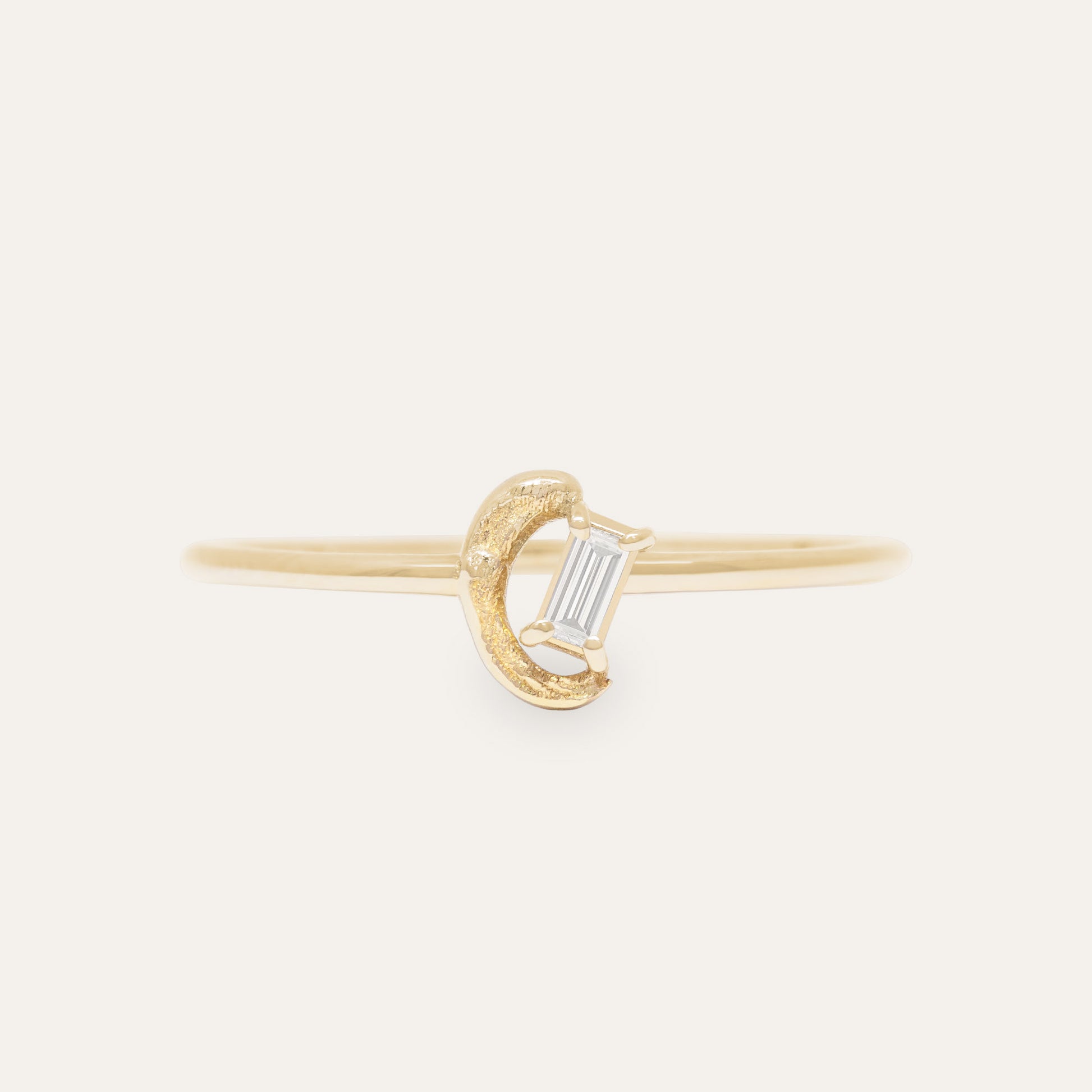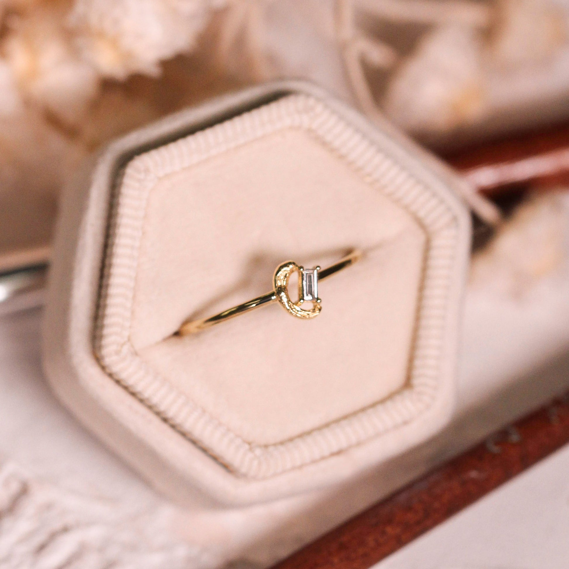 Inspired by the fleeting beauty captured in Impressionist brushstrokes, this design cradles a glimmering white baguette diamond within two delicate golden strokes. This dainty ring is a timeless treasure, perfect for cherishing every day.