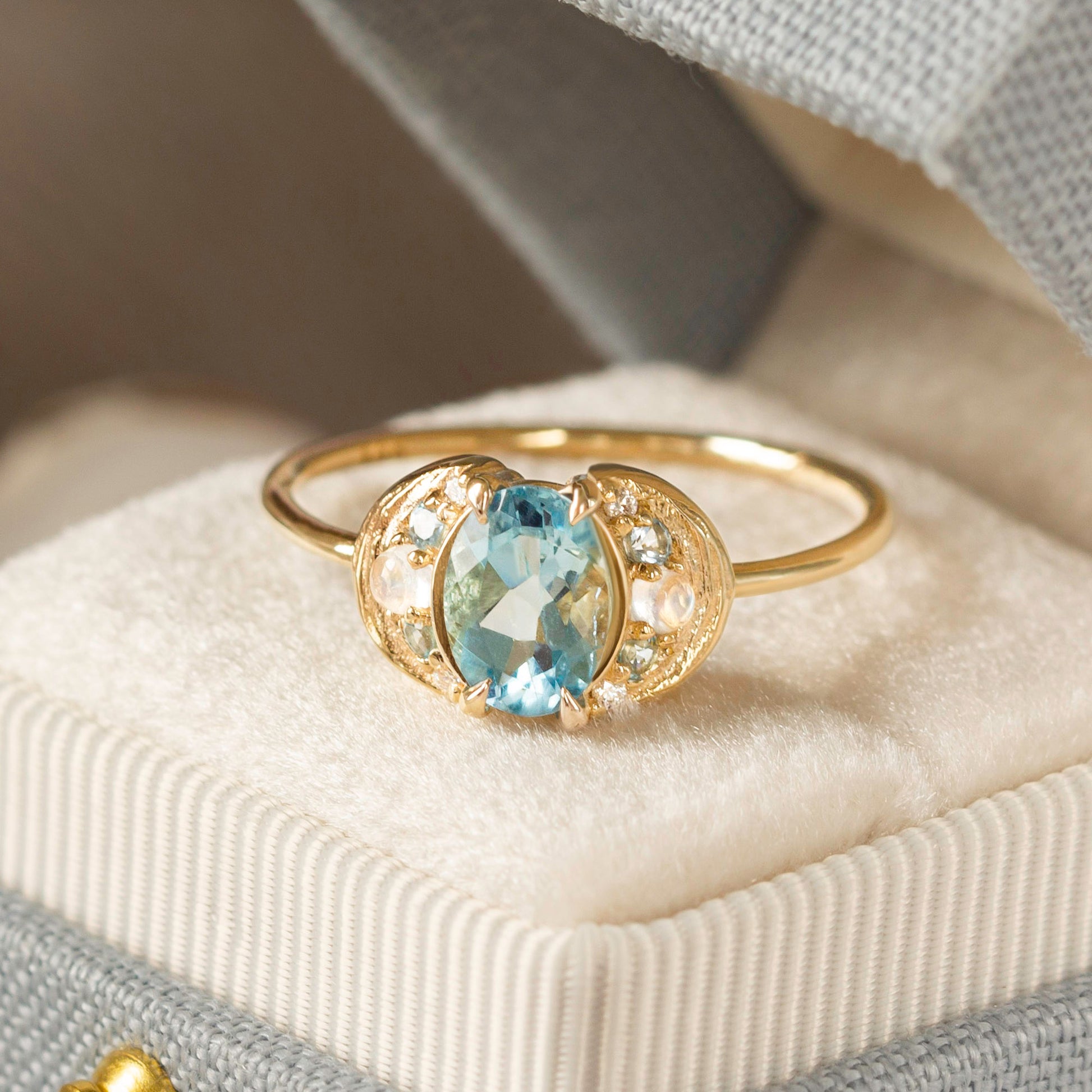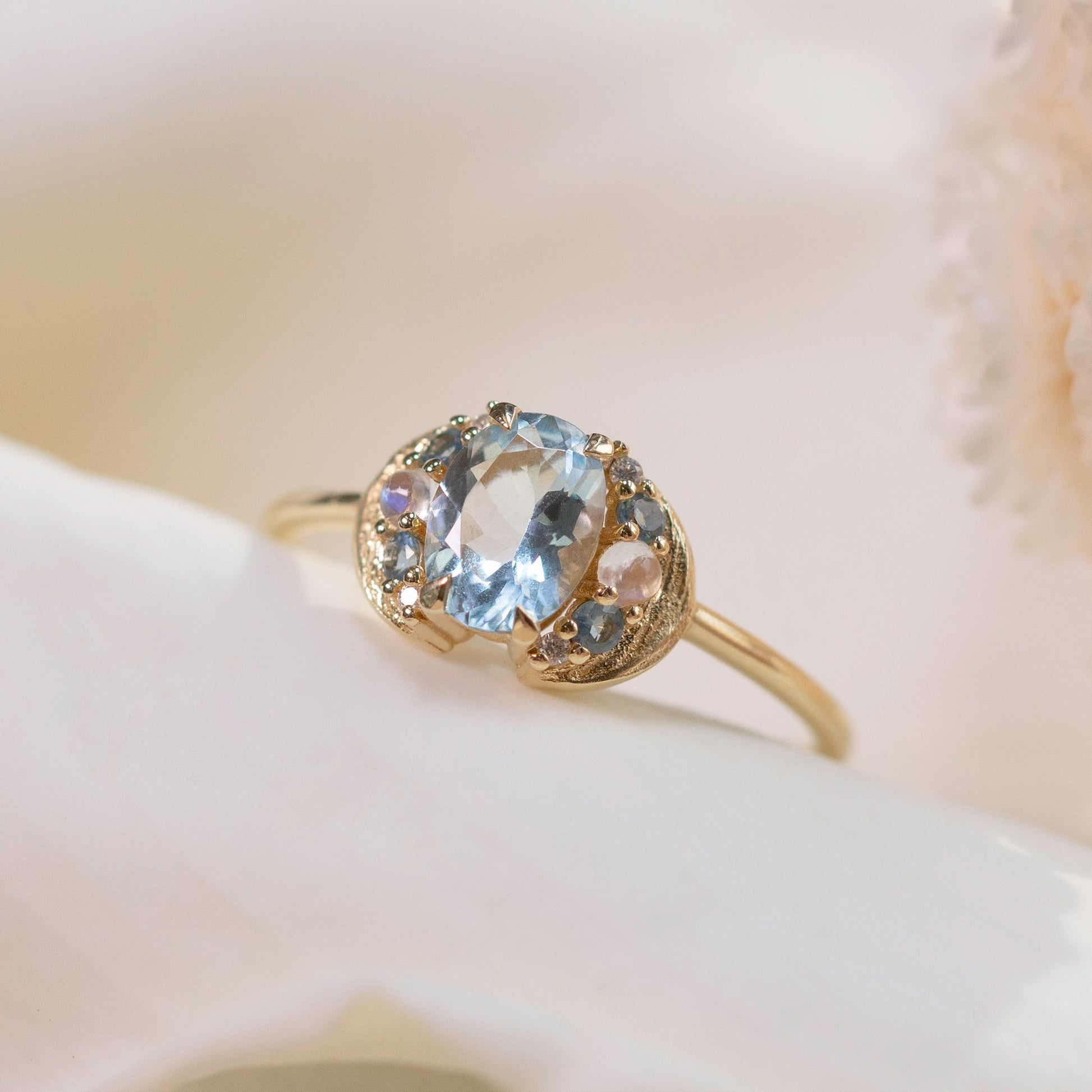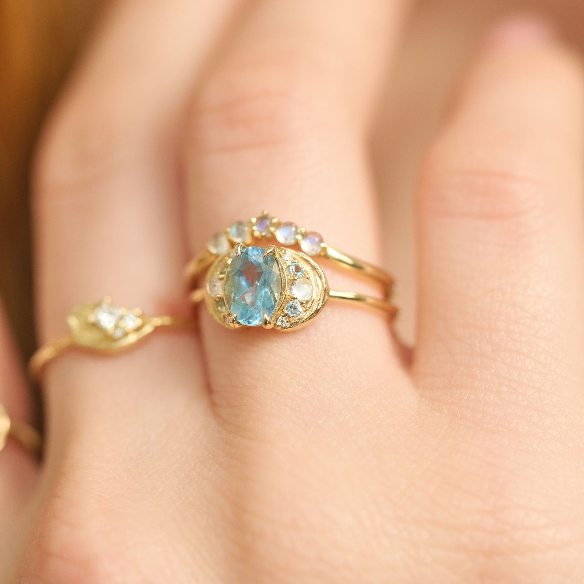 If a pigment of light, airy blue could bloom, this would be it. The Carolina Blue features a feathery baby-blue aquamarine, fused with pacific-blue topaz, iridescent moonstones, and sparkling white diamonds. All are delicately bound together with velvety brushstrokes of gold, creating the pinnacle of blue hues.