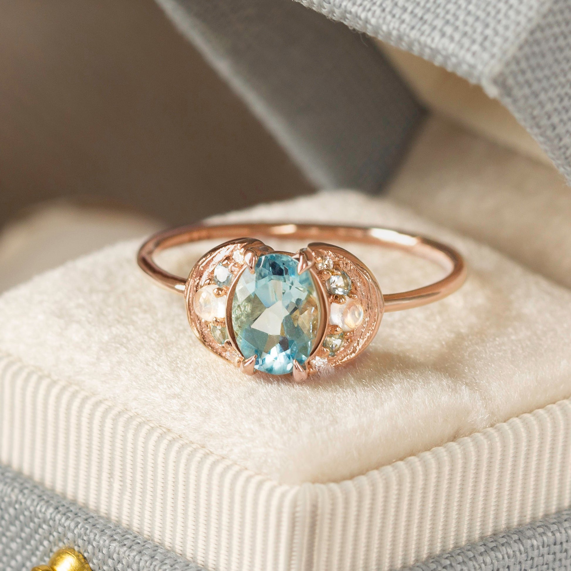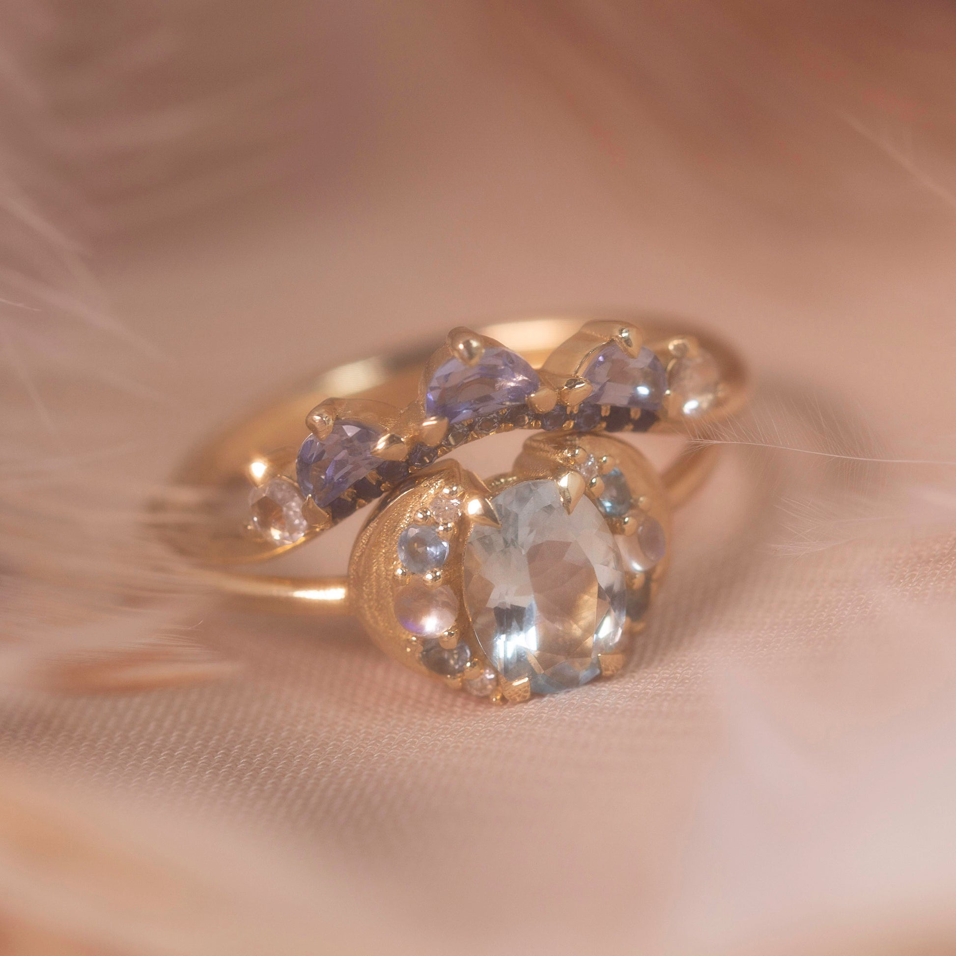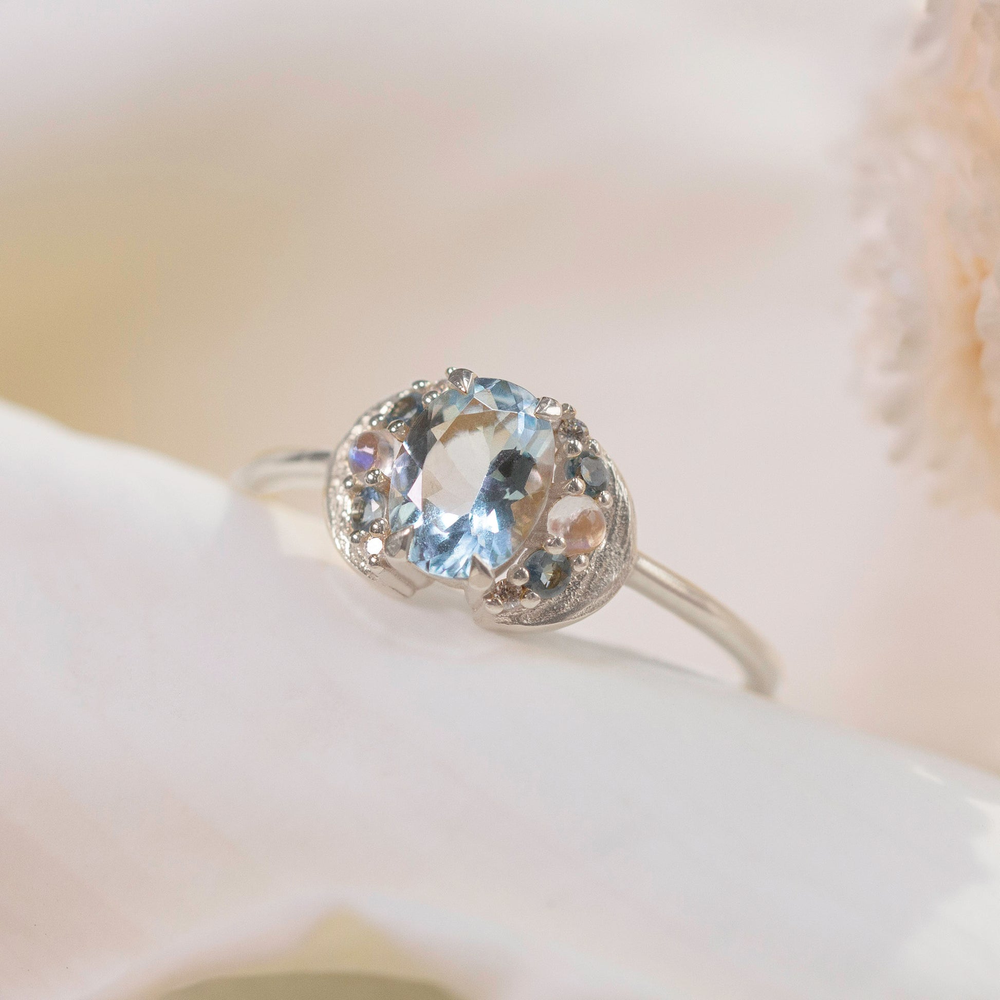 If a pigment of light, airy blue could bloom, this would be it. The Carolina Blue features a feathery baby-blue aquamarine, fused with pacific-blue topaz, iridescent moonstones, and sparkling white diamonds. All are delicately bound together with velvety brushstrokes of gold, creating the pinnacle of blue hues.