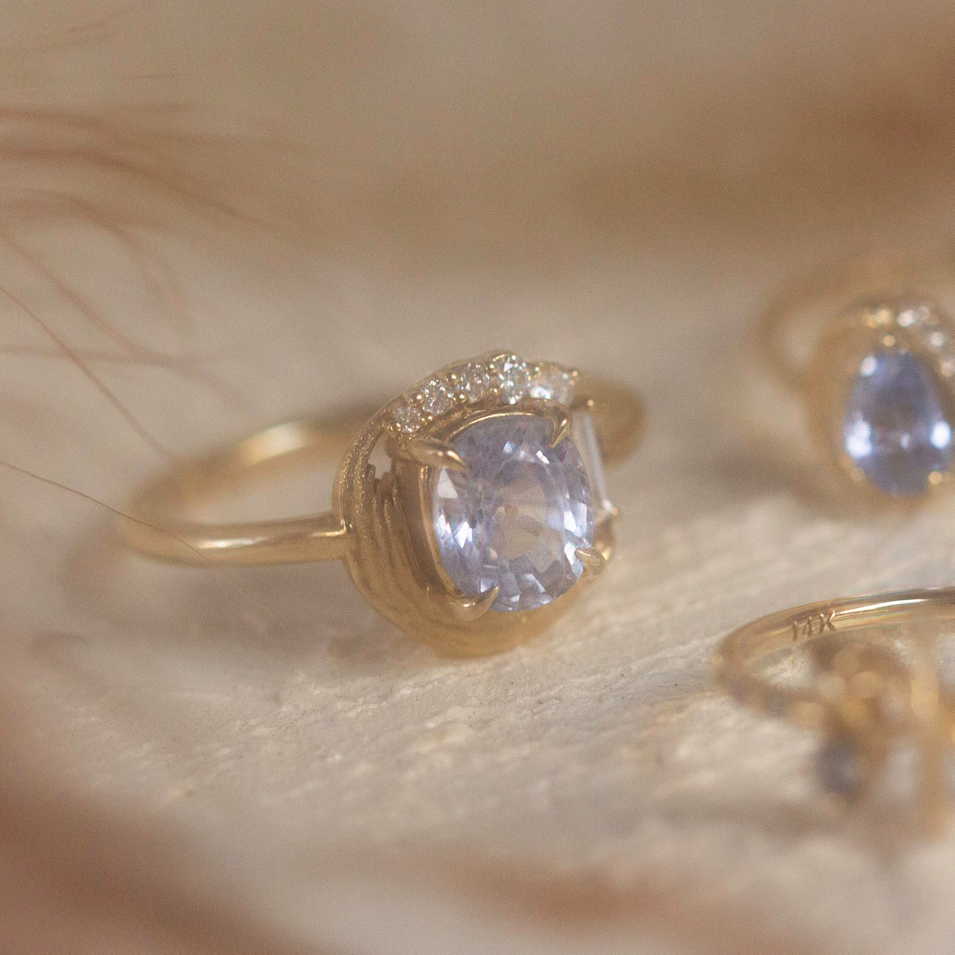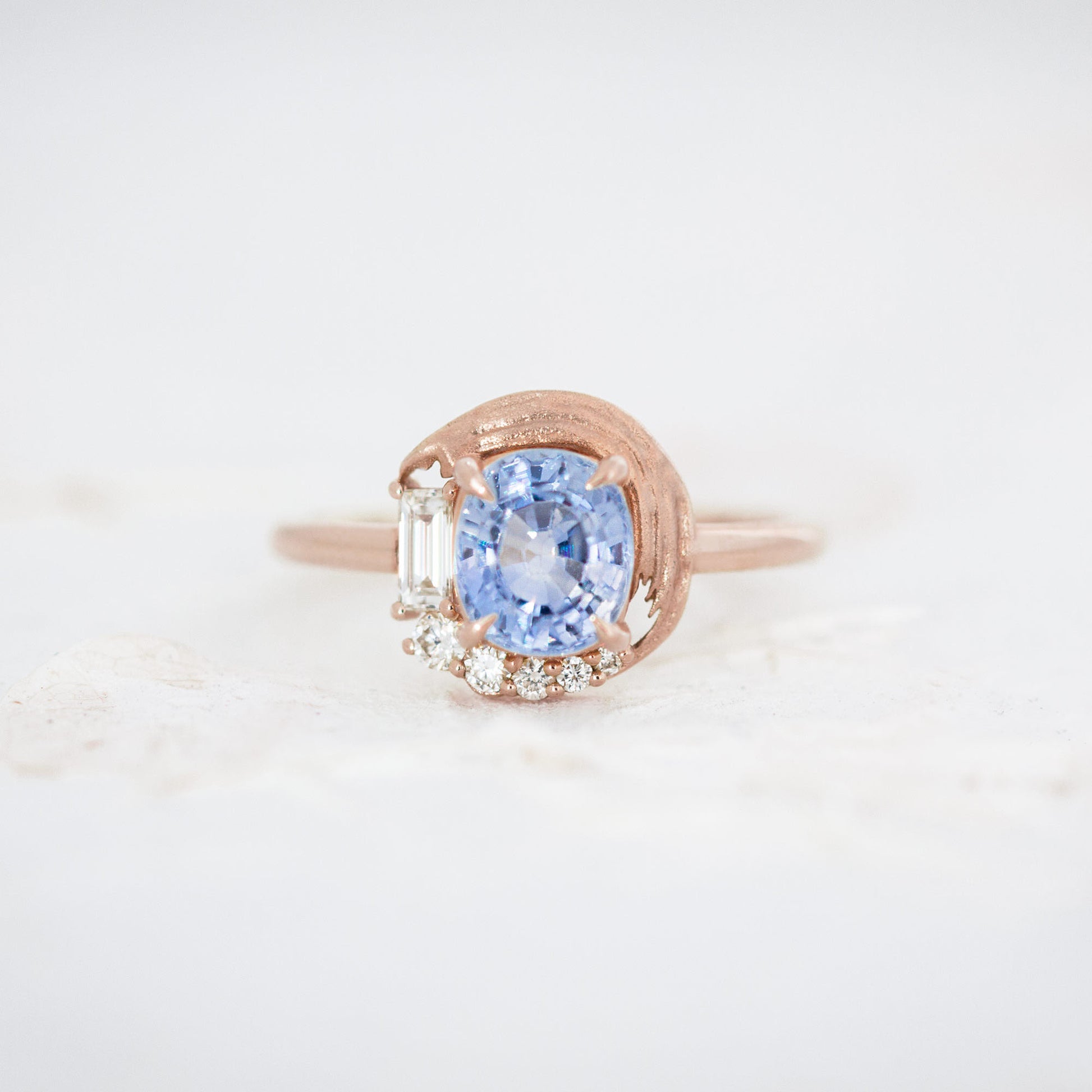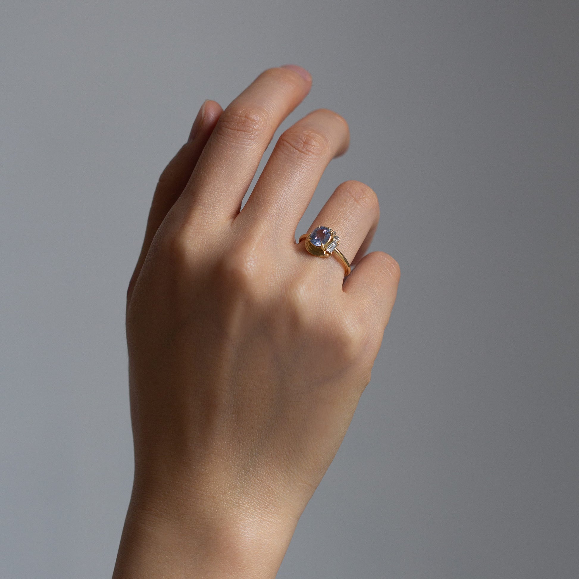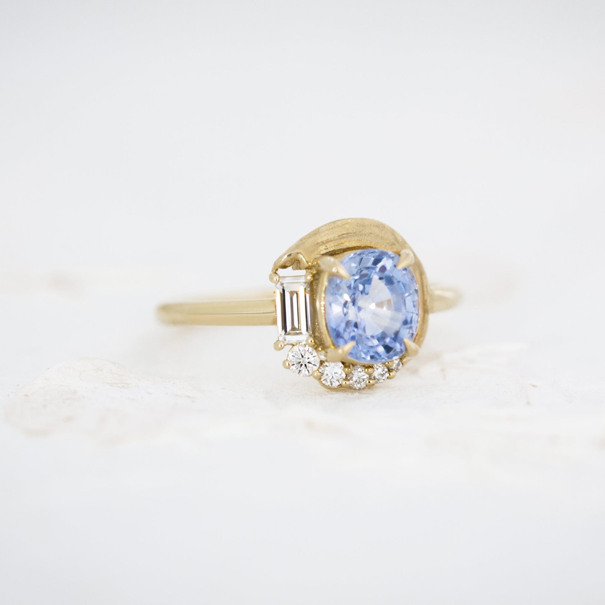 This piece reflects the journey of life – a path adorned with traces and sparkling specks of diamonds left behind. At its heart lies a chunky, brilliant-cut sapphire in a luminous, translucent blue, its beauty truly brought to life when worn by you.