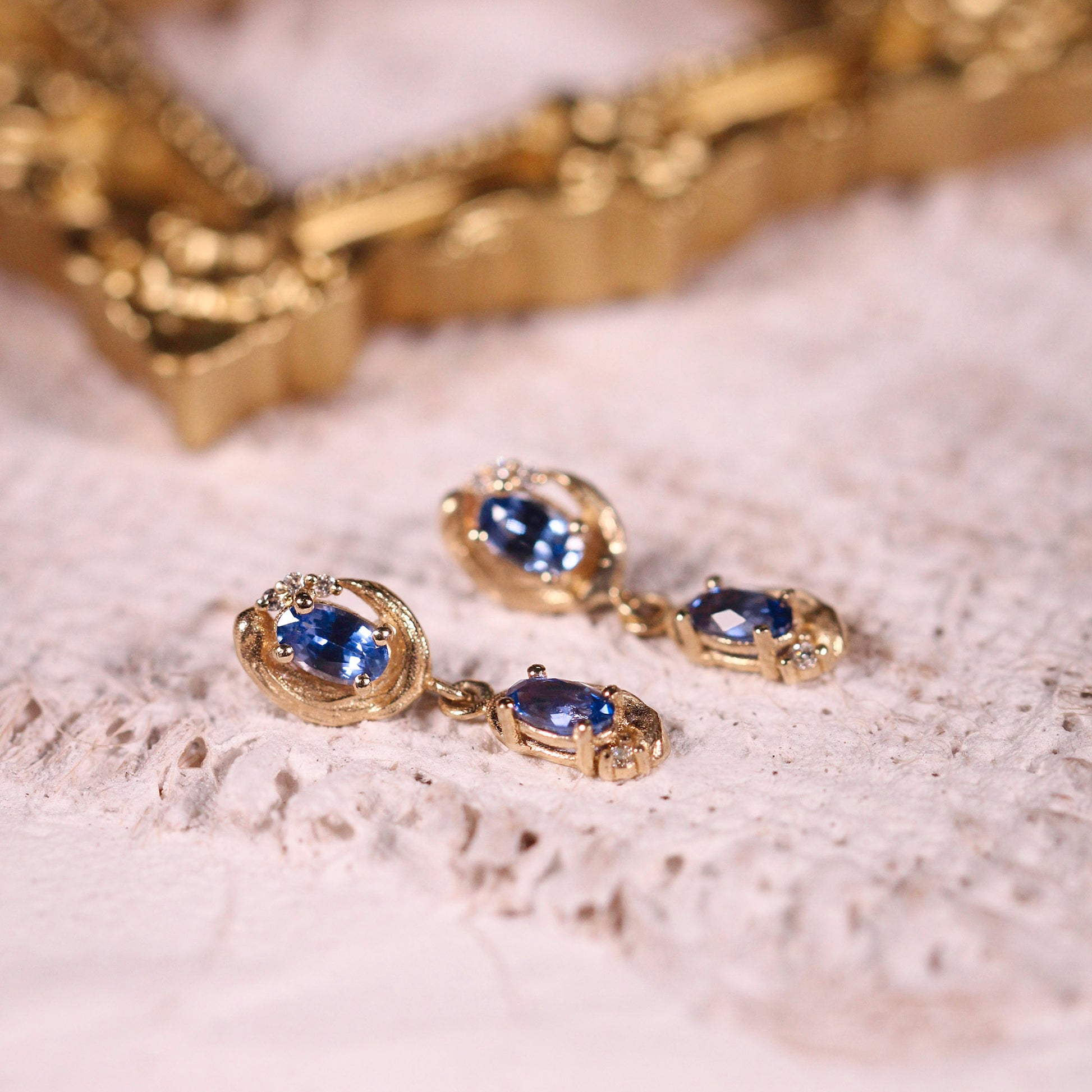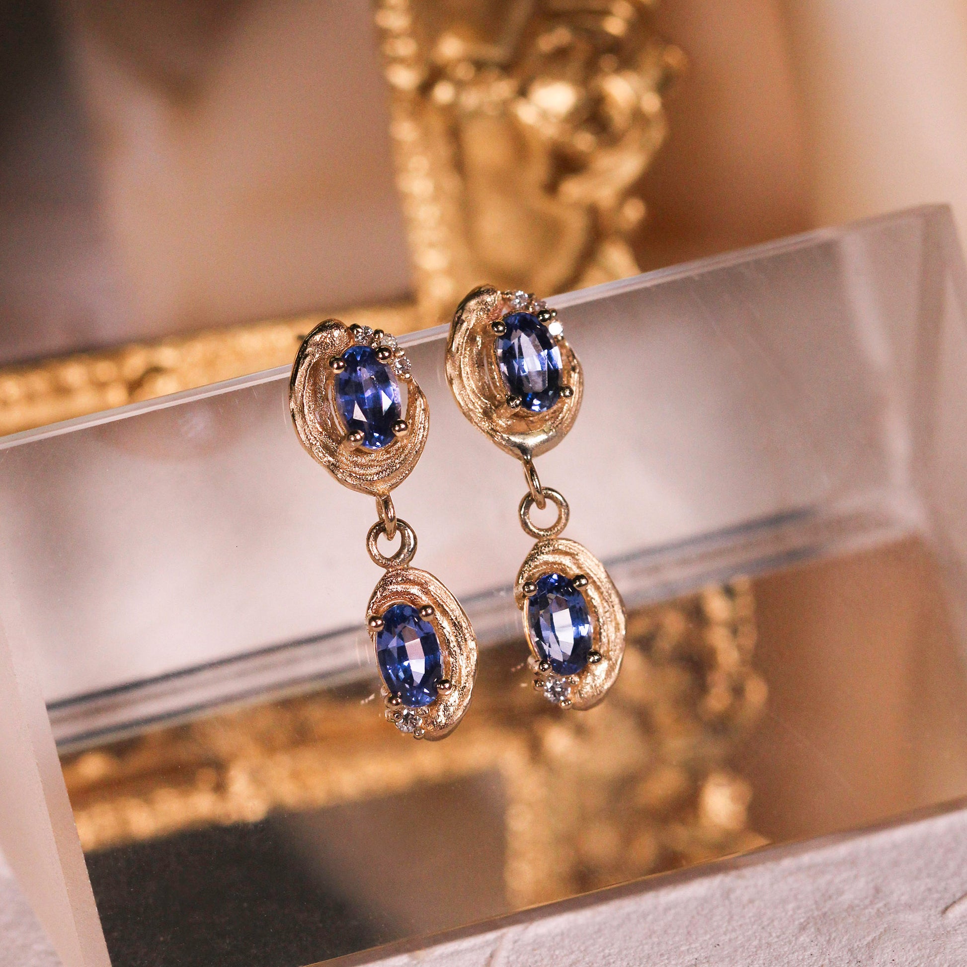 Muted elegance meets playful sophistication in this dangling design. Adorned with royal-blue sapphires cradled in creamy golden brushstrokes, this piece pairs beautifully with the Cotton Candy (Pendant) and makes a charming, distinctive touch to your collection.