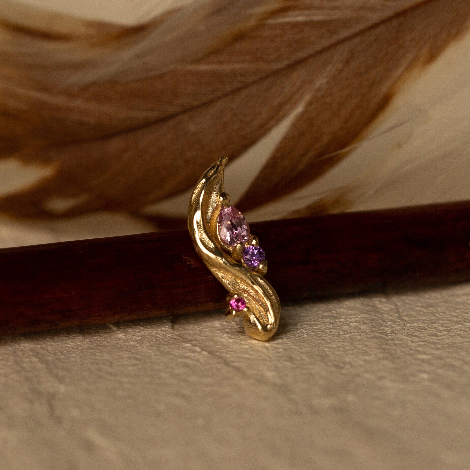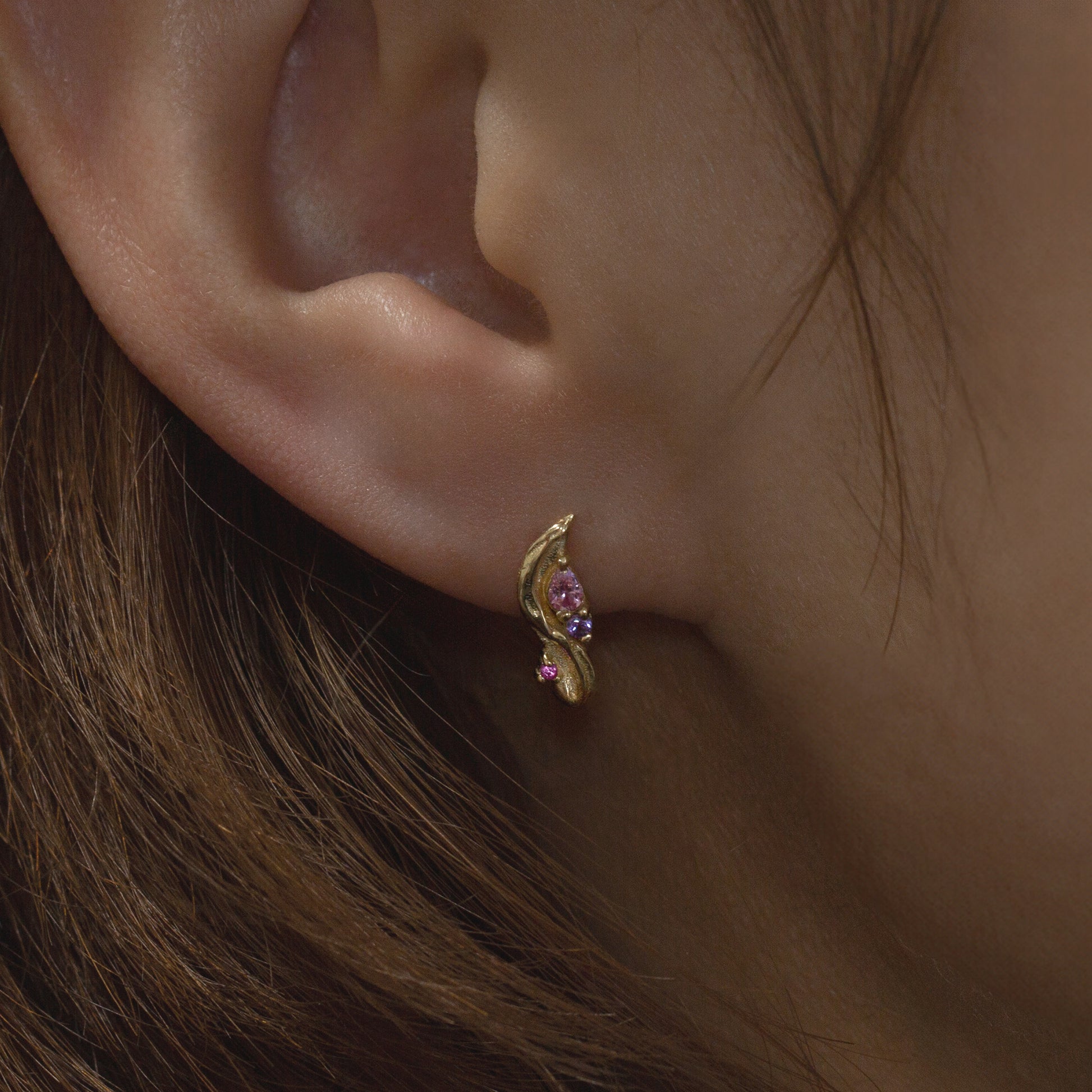 With a wavy, velvety brushstroke adorned with pink and purple sapphires, the Dreamy Pink Earring exudes a dreamy allure. Its soft curves and vibrant hues evoke the enchanting playfulness of an artist’s imagination.