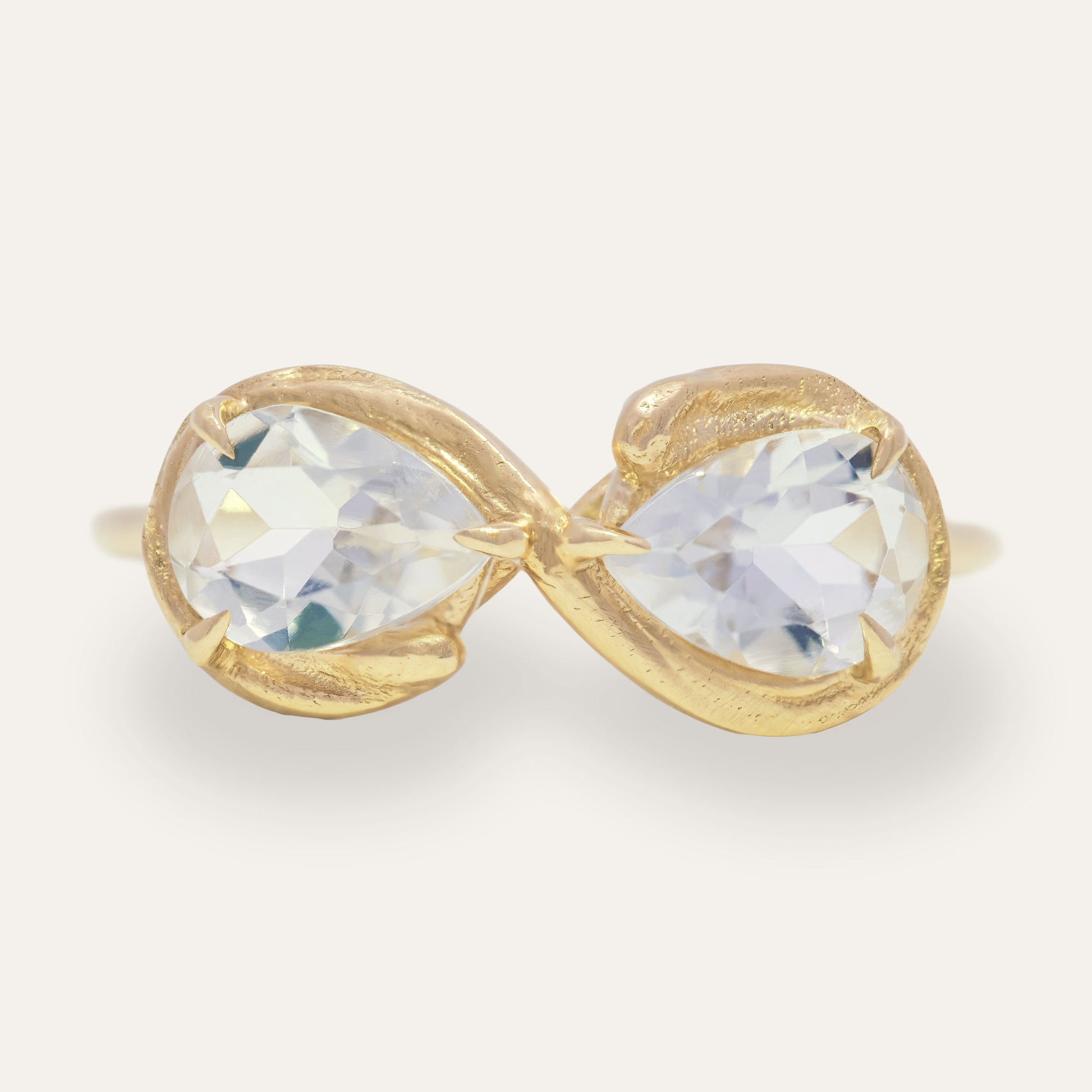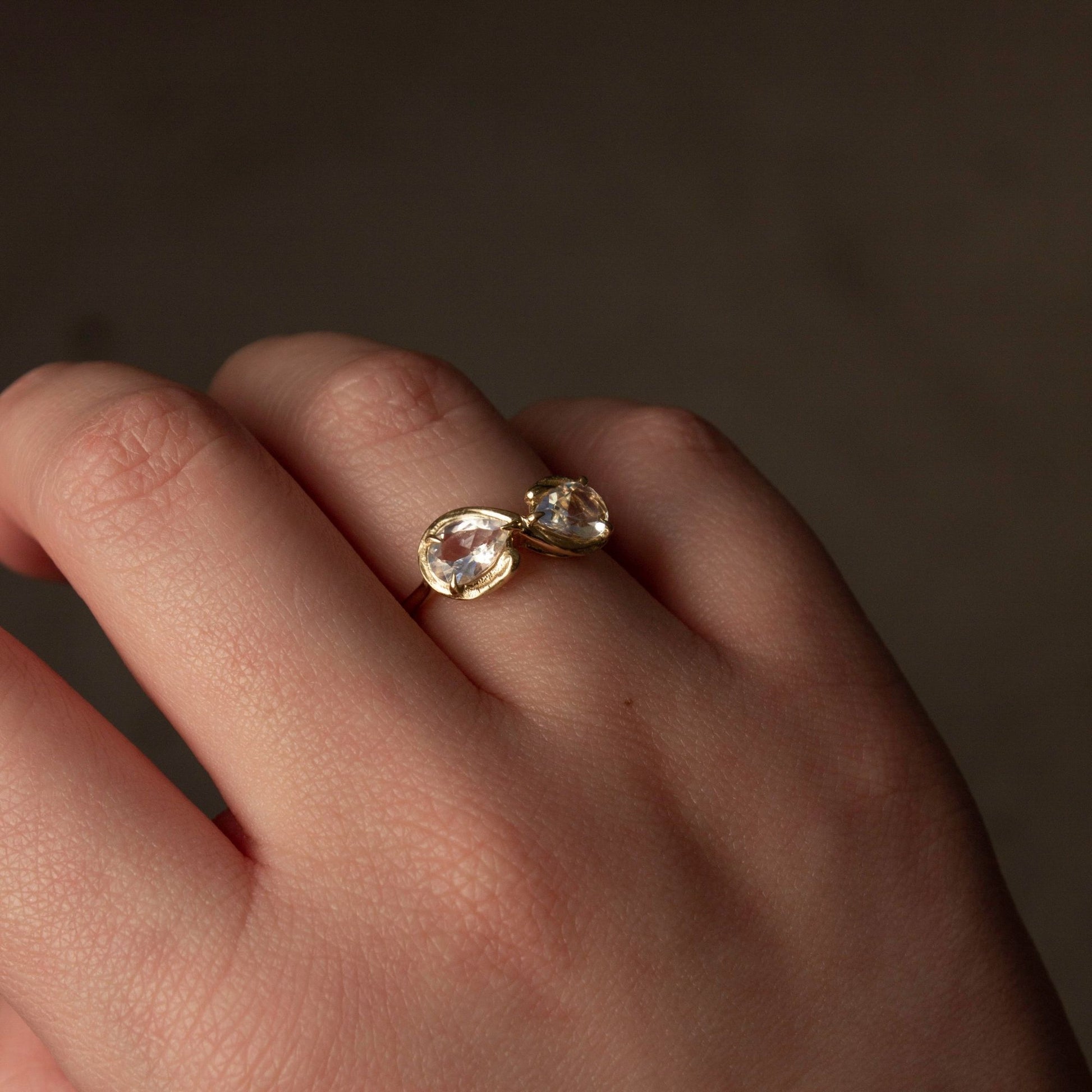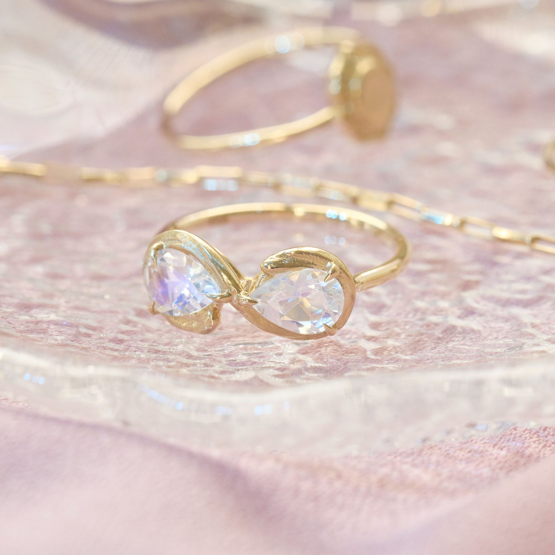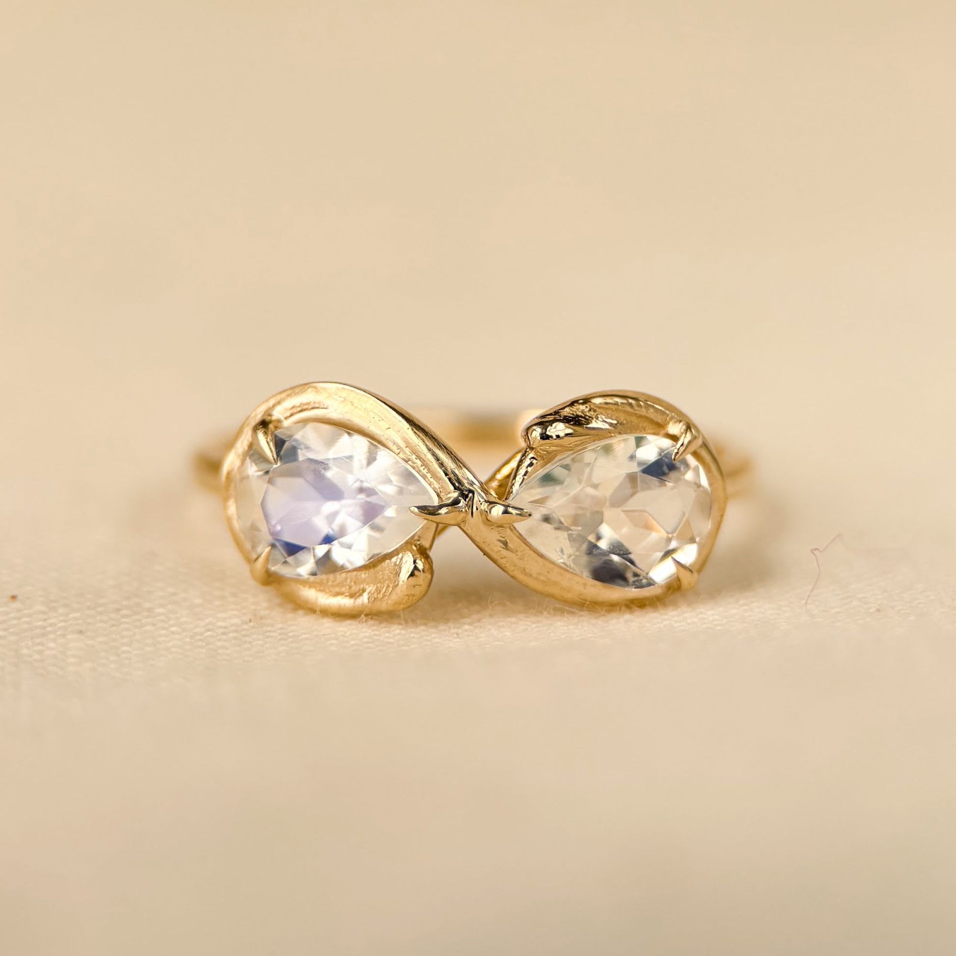 Like the stillness of a moonlit winter night, the Eternal Moonfrost ring captures the quiet beauty of balance and reflection. Two moonstones face each other in graceful symmetry, their soft, silvery glow shifting like frost beneath gentle light. Set in gold, this piece is a poetic tribute to duality, serenity, and timeless connection.