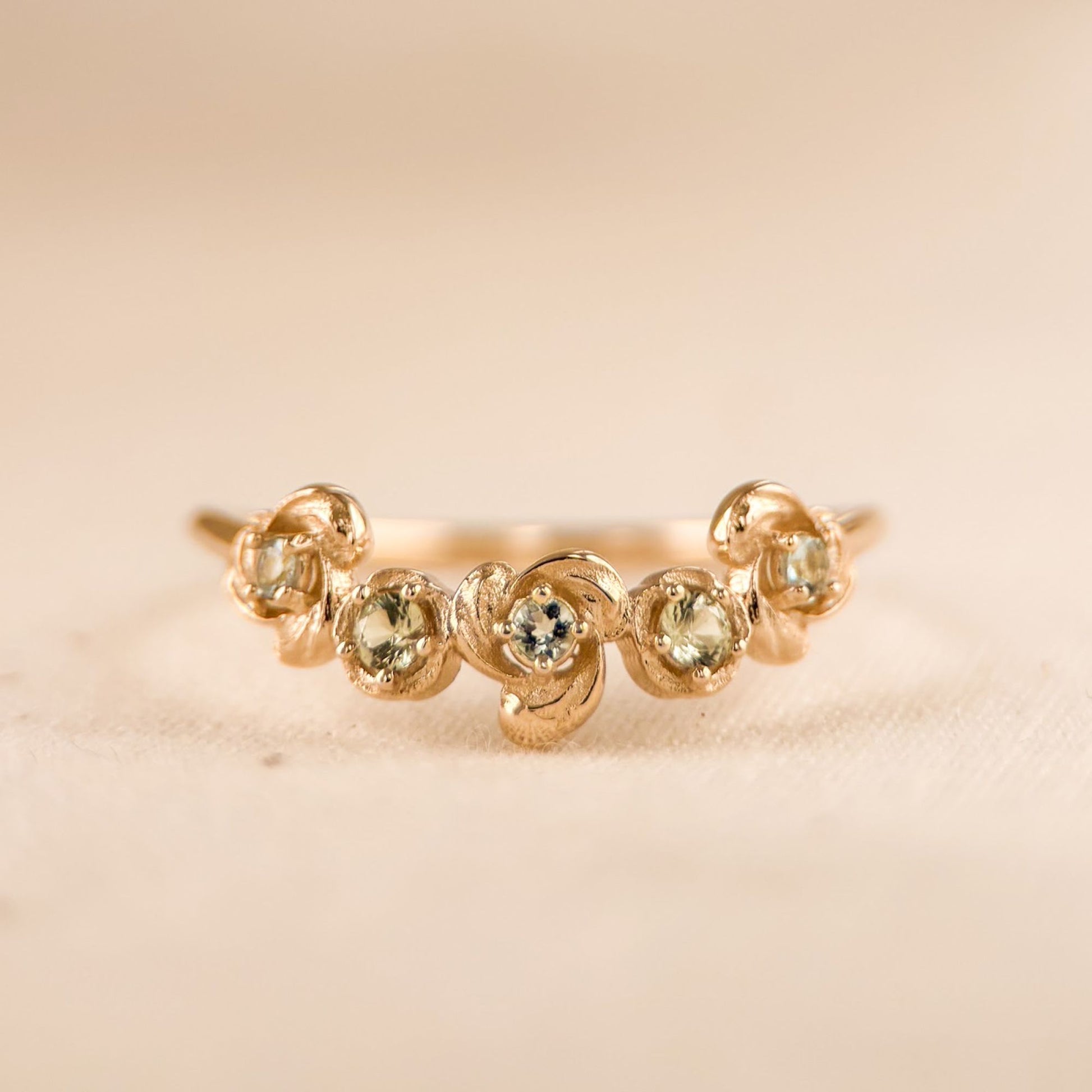 The Forest Halo ring is a luminous tribute to nature’s quiet majesty. Five round sapphires—three soft blue, two pale green—glow like dew-laced leaves touched by morning light. Set in gold, each stone nestles within sculpted, swirling curves, creating a gentle arc that echoes the rhythm of forest branches at dawn. With its graceful movement and painterly detail, this piece captures the serene poetry of light meeting leaf.