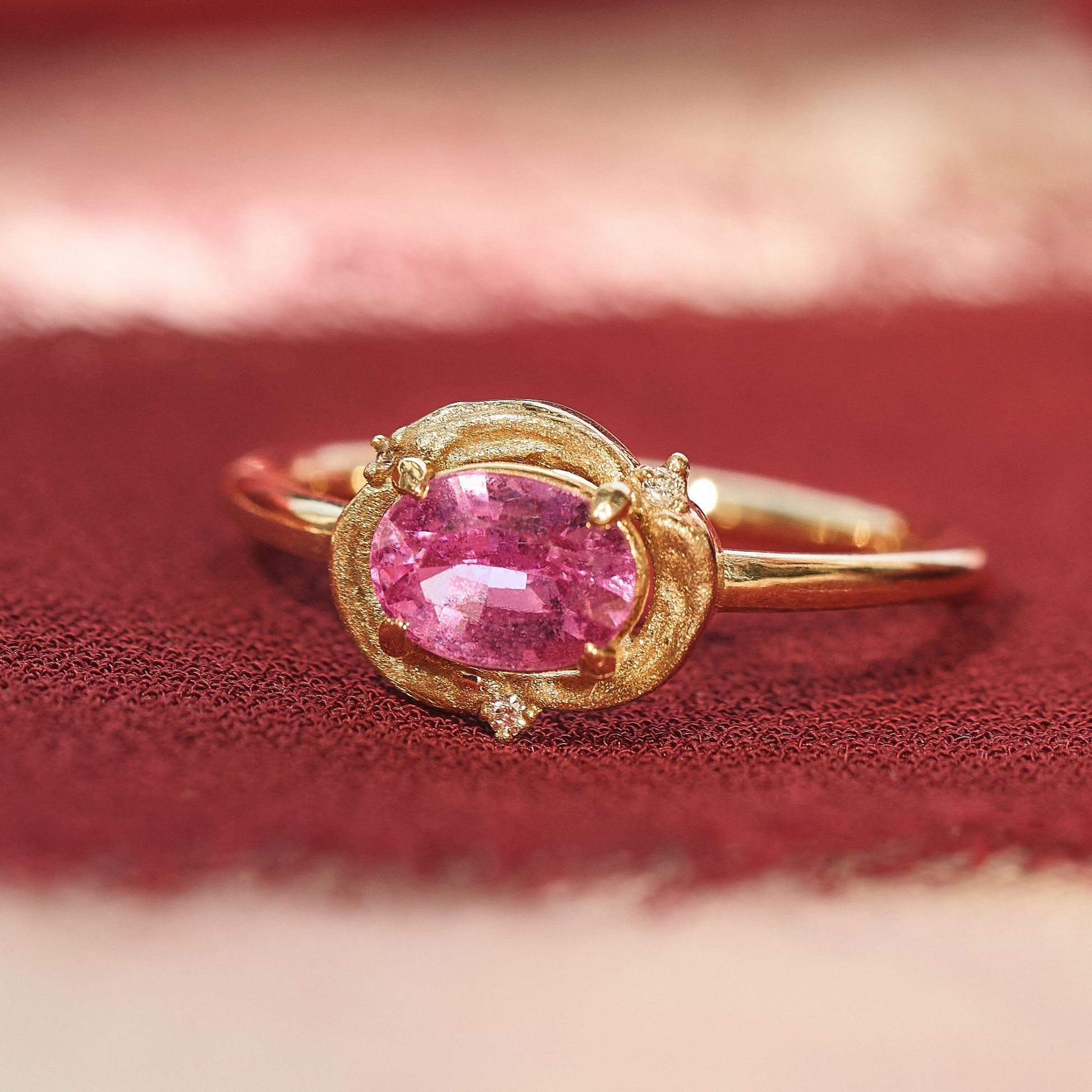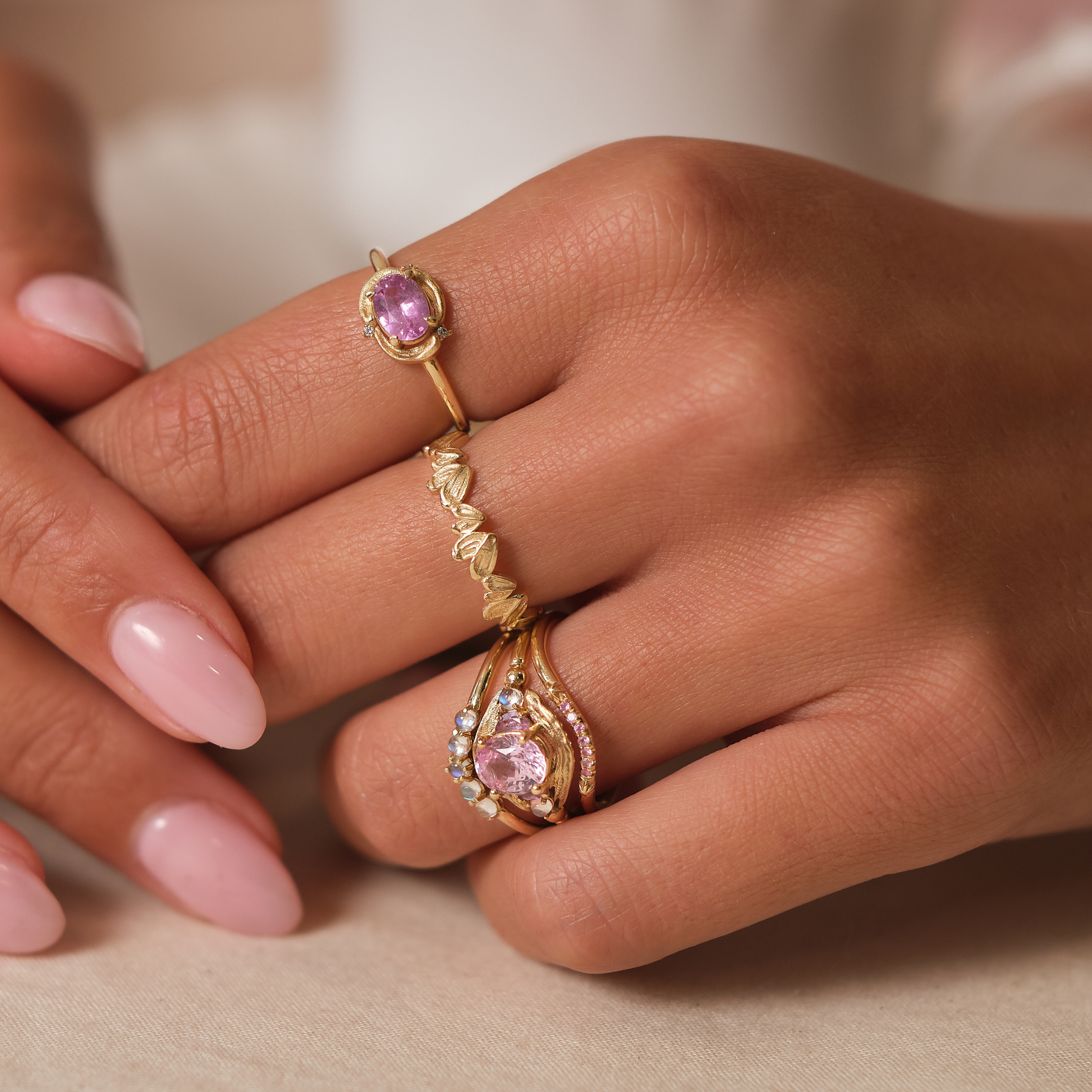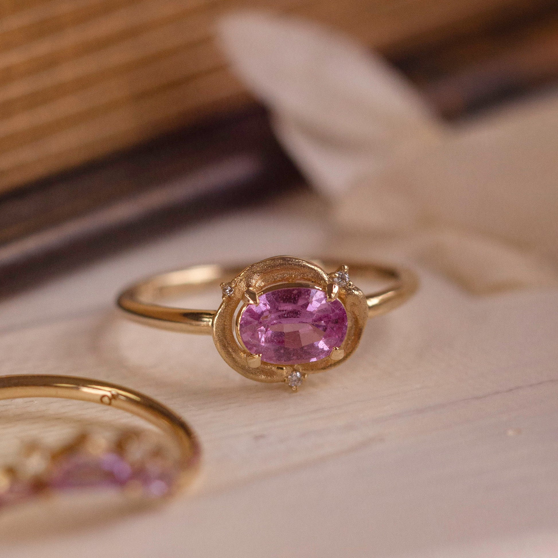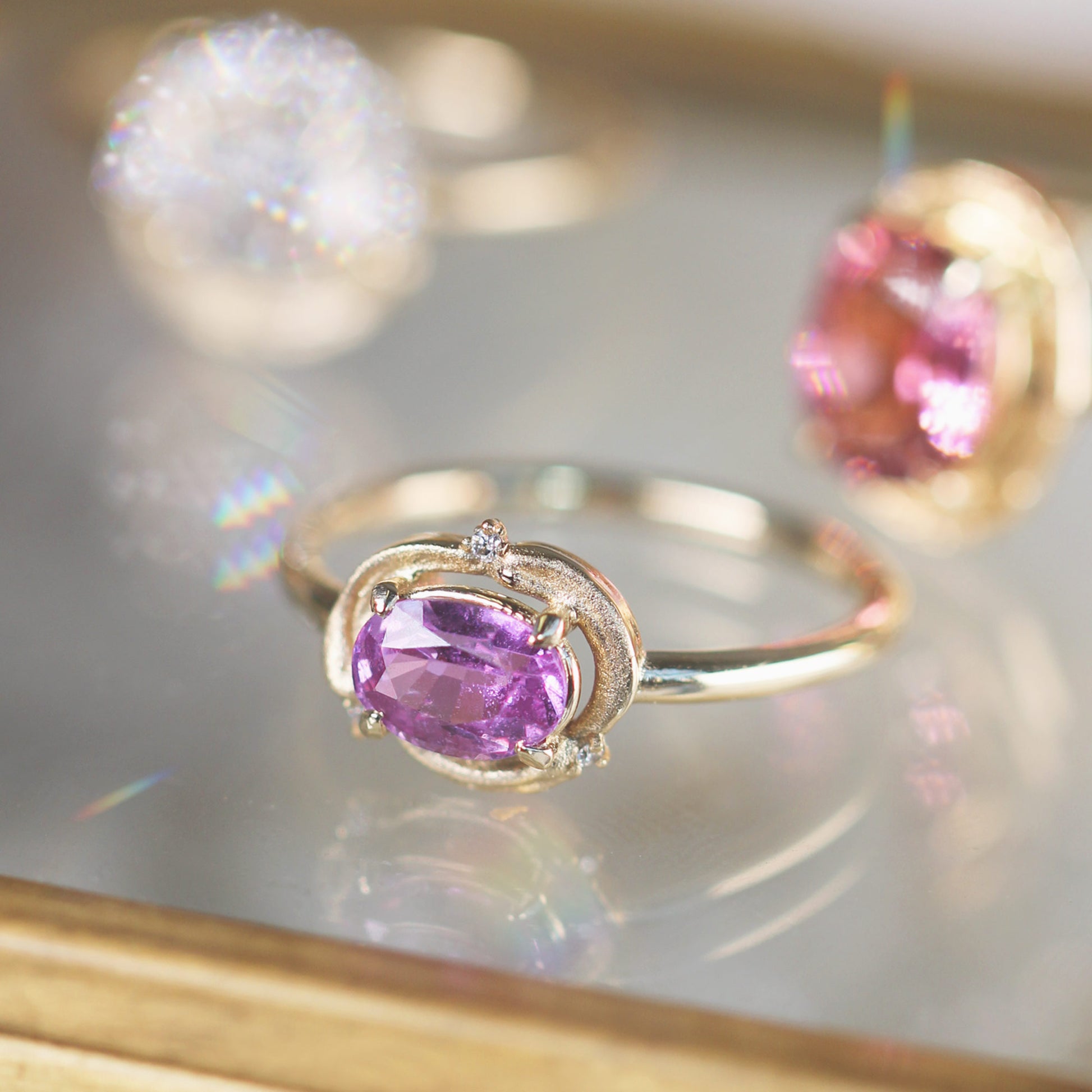 All your golden moments woven into a single statement ring. Three enchanting brushstrokes converge around three round diamonds, with a brilliant-cut fuchsia-pink sapphire at the center, glowing brightly to tell your one-of-a-kind tale.