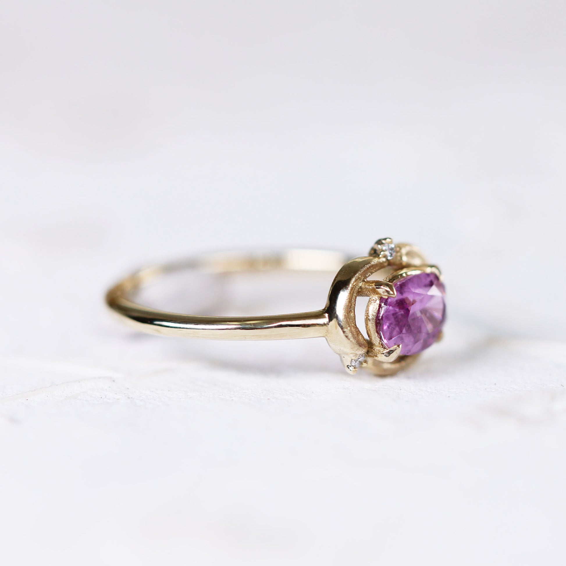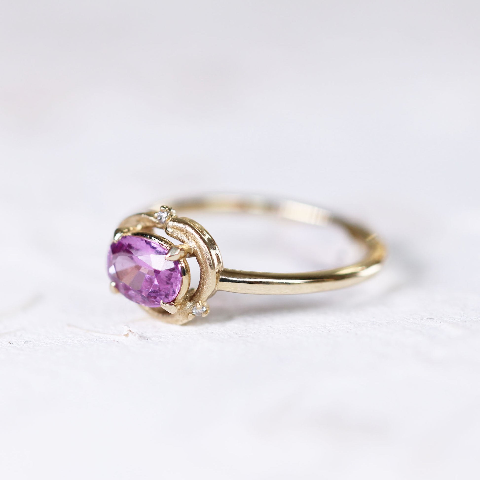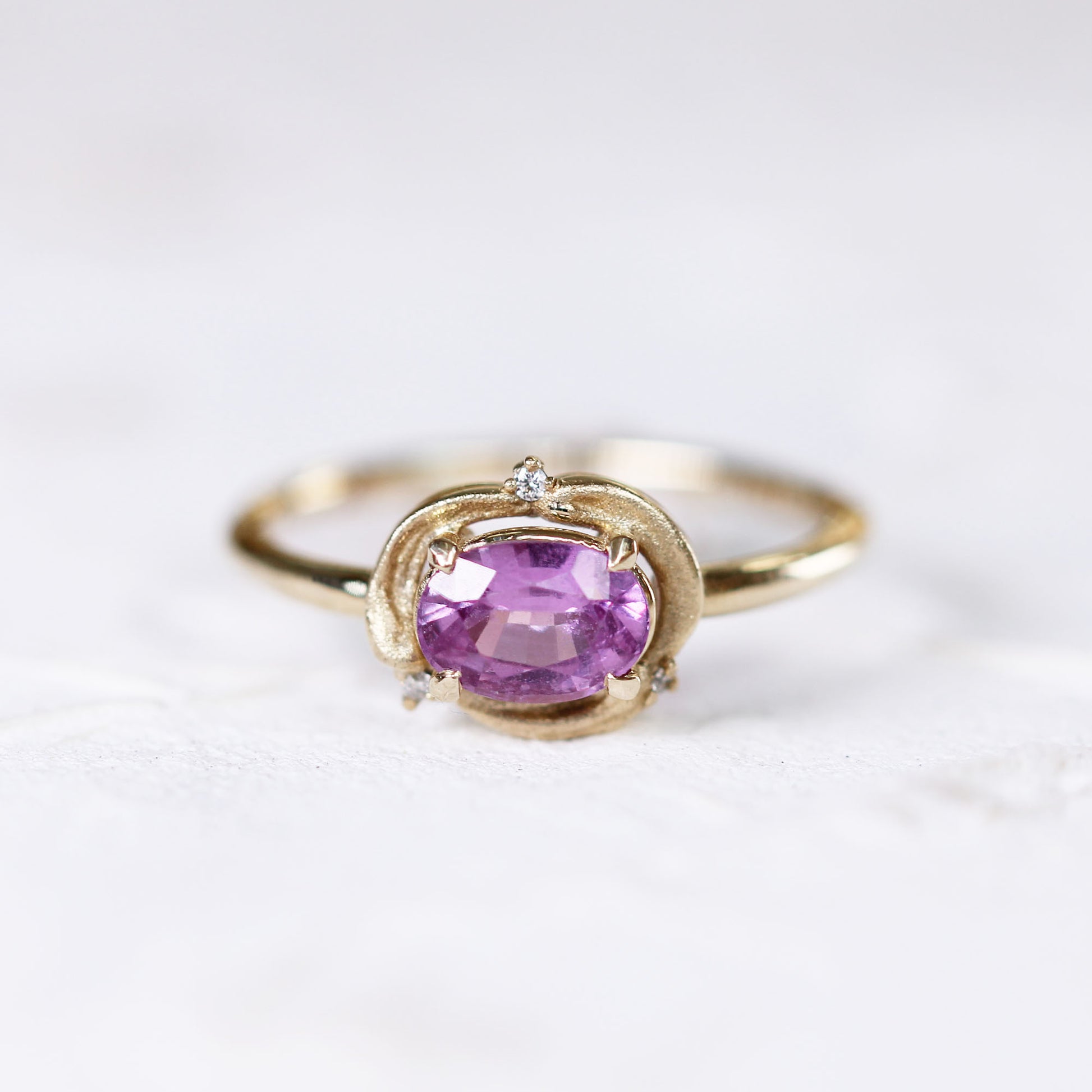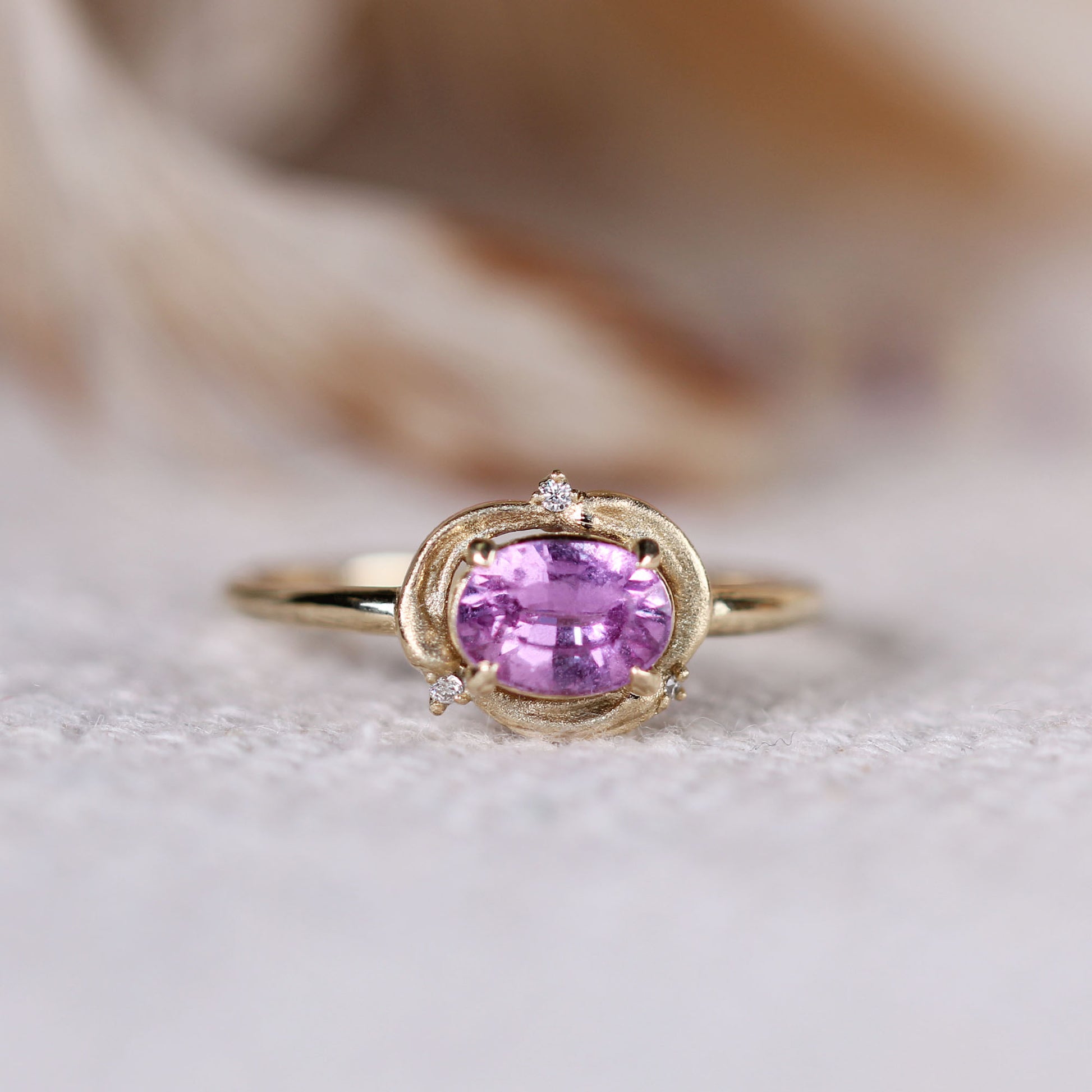 All your golden moments woven into a single statement ring. Three enchanting brushstrokes converge around three round diamonds, with a brilliant-cut fuchsia-pink sapphire at the center, glowing brightly to tell your one-of-a-kind tale.