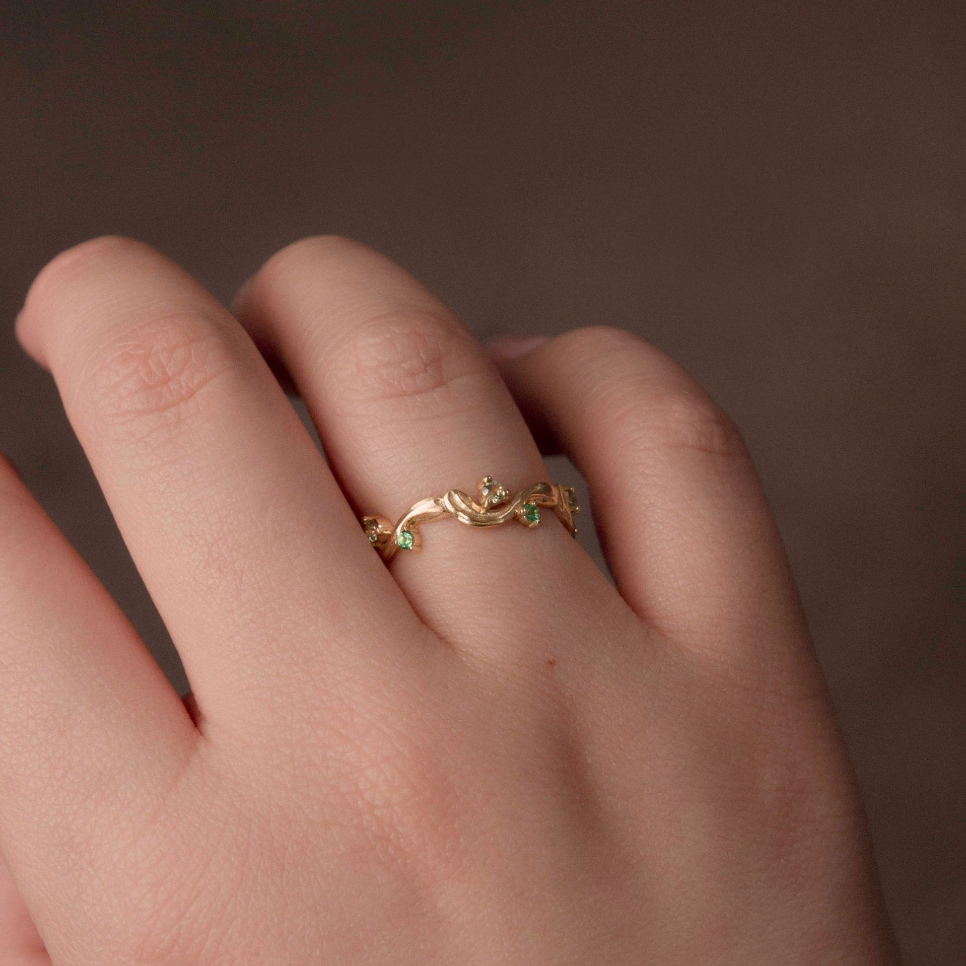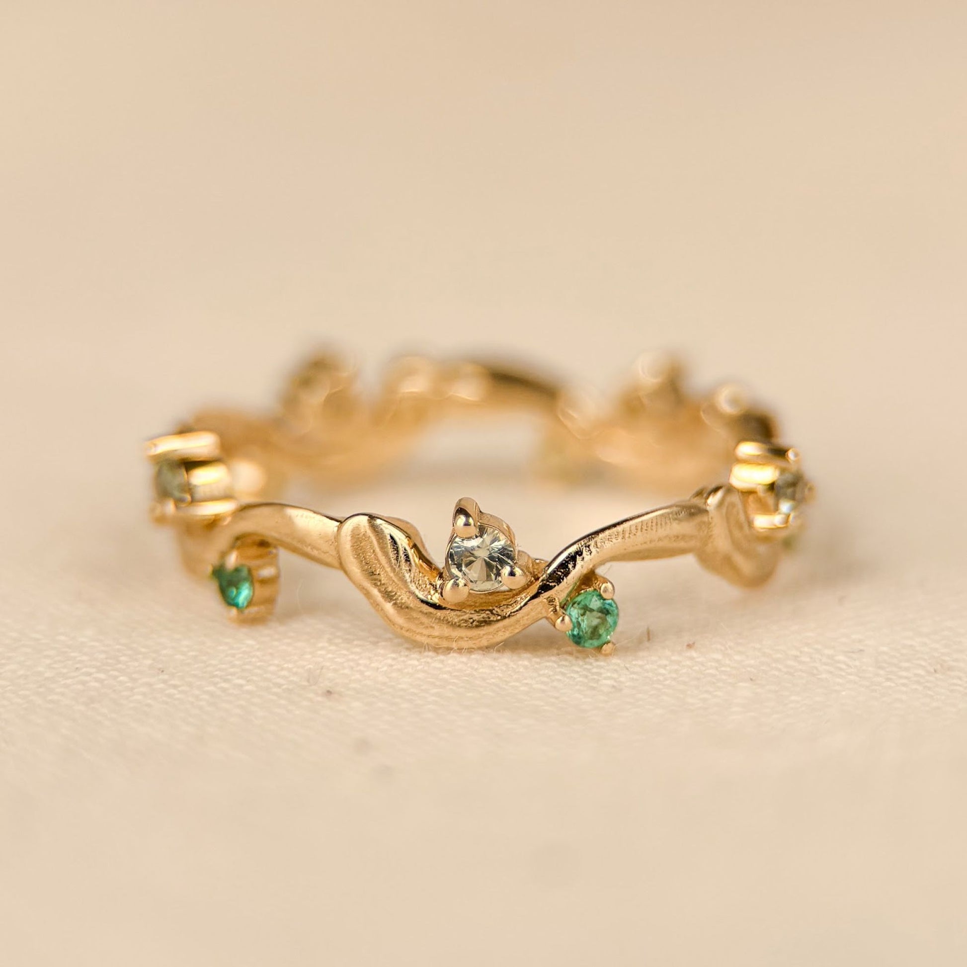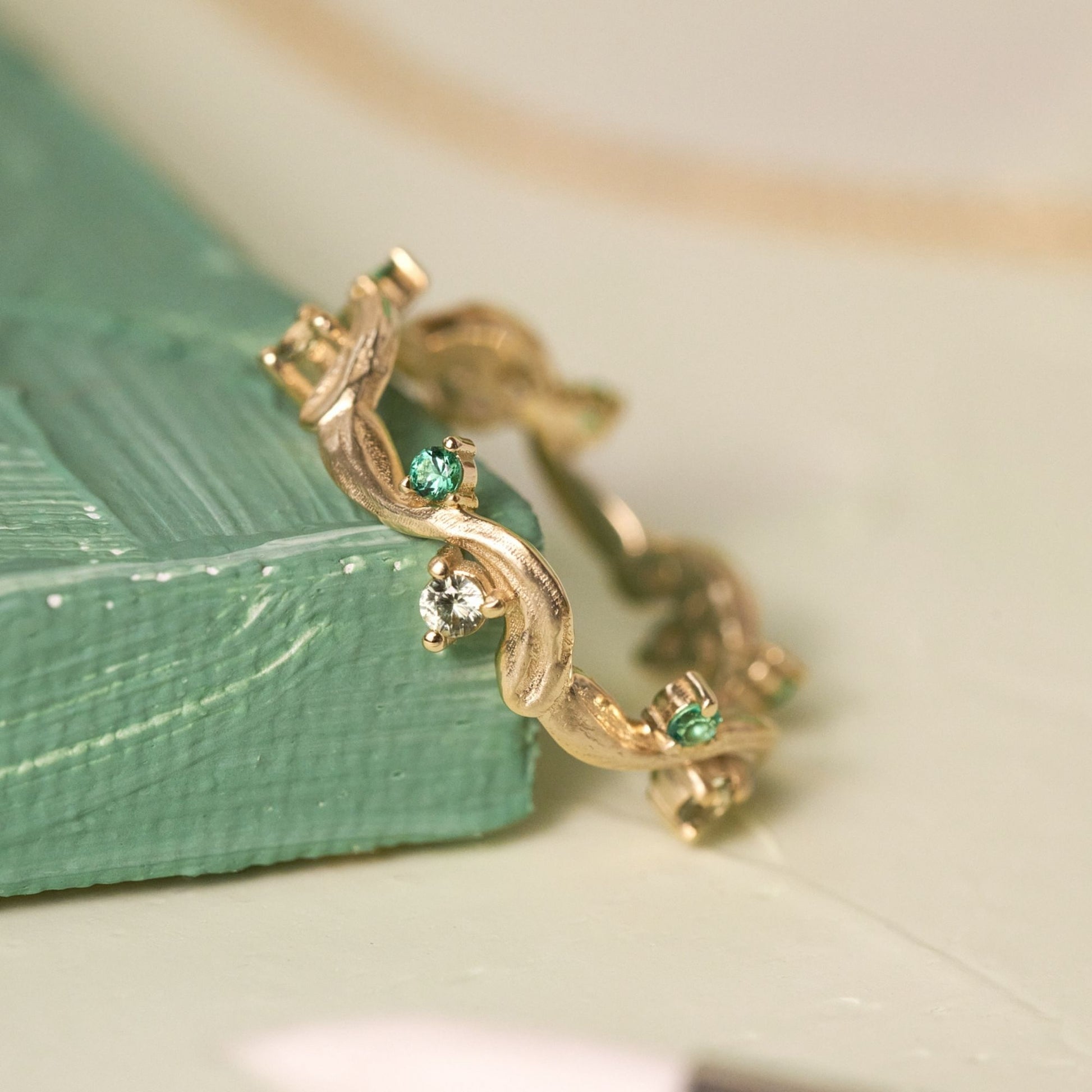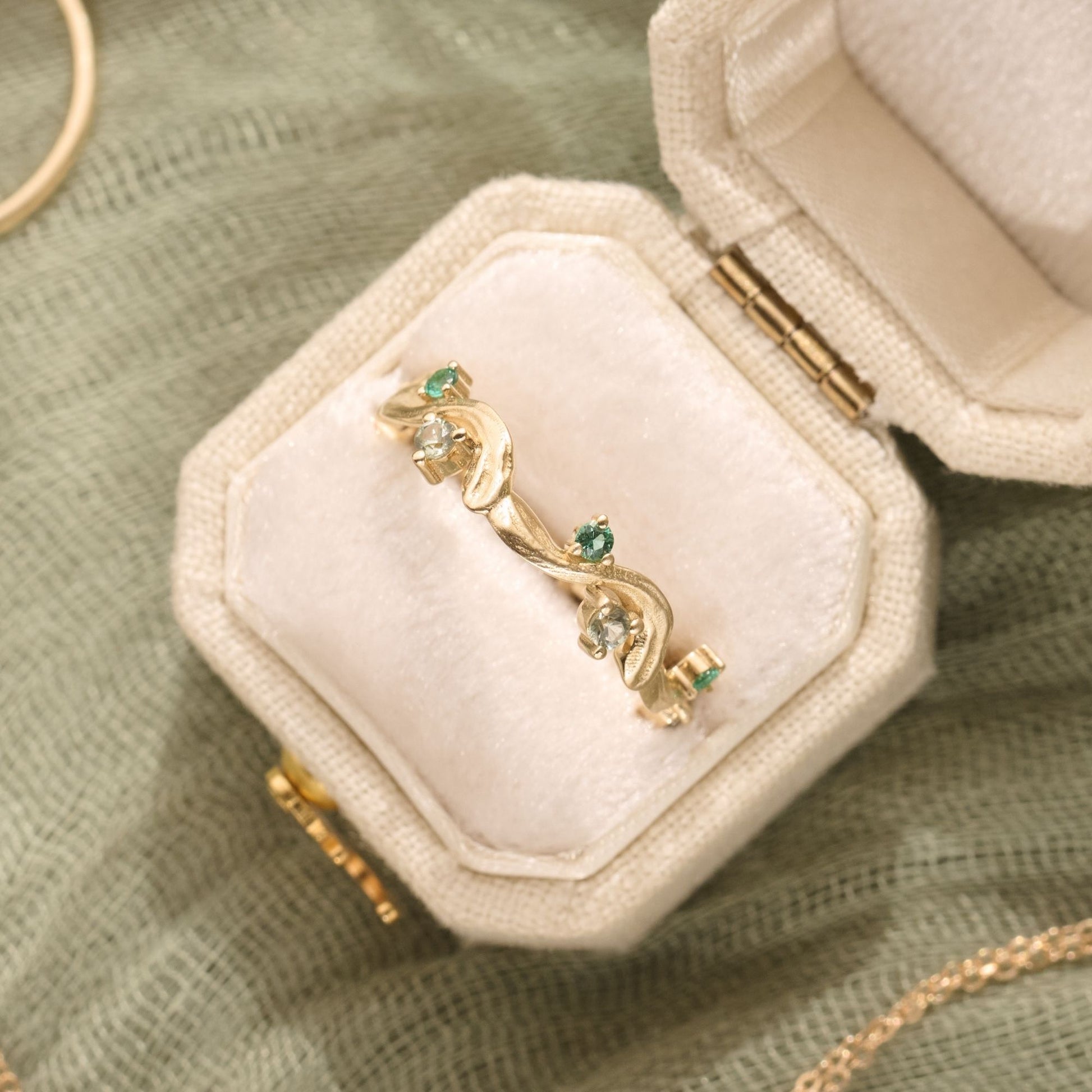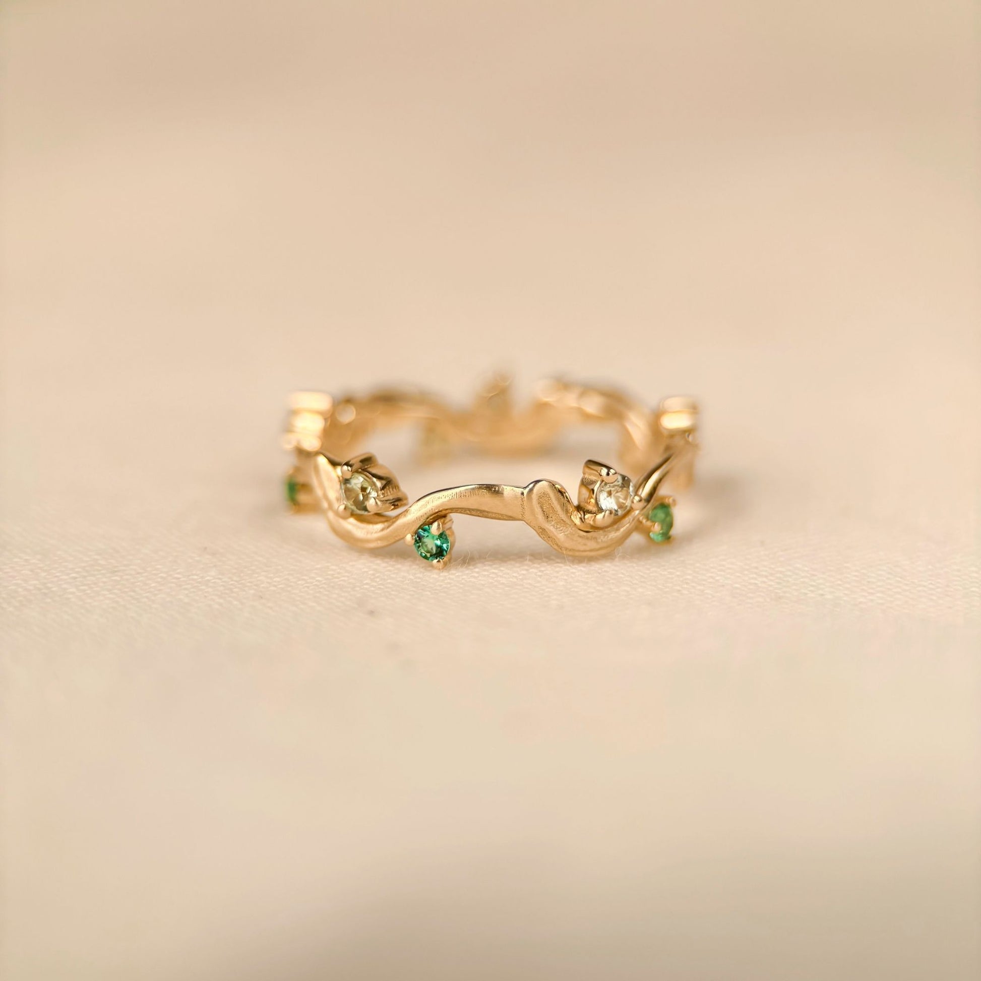 A quiet bloom of green and gold, the Impression Renewal band evokes the gentle awakening of nature. Emeralds glimmer along a softly waved form, their verdant hue flowing like leaves caught in motion. Golden brushstrokes ripple around them, shaping curves reminiscent of petals and new growth. With every shimmer, the band speaks of transformation, resilience, and the grace of beginnings.