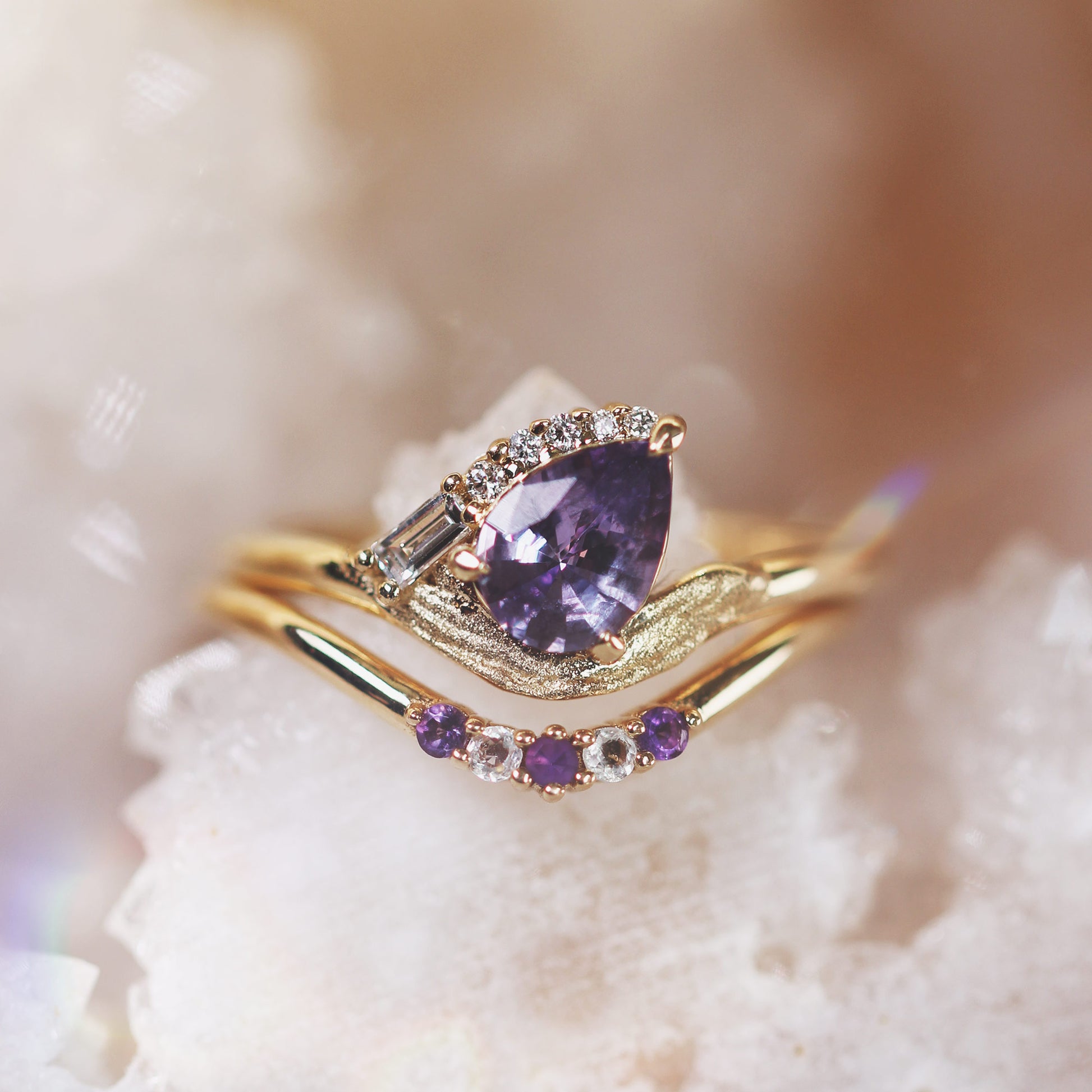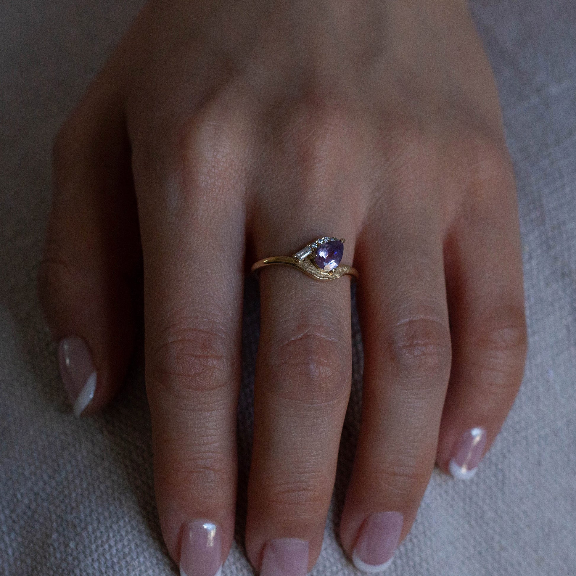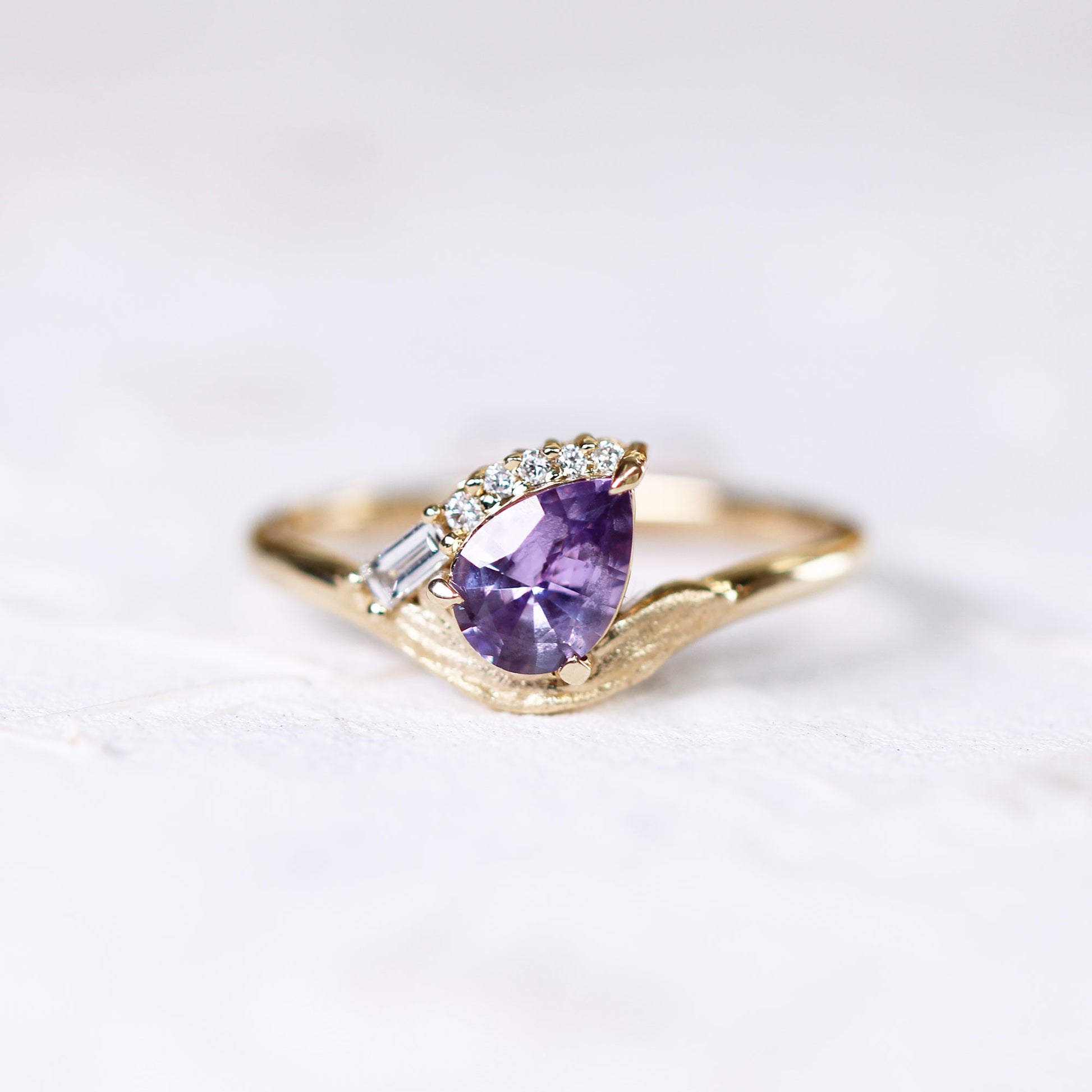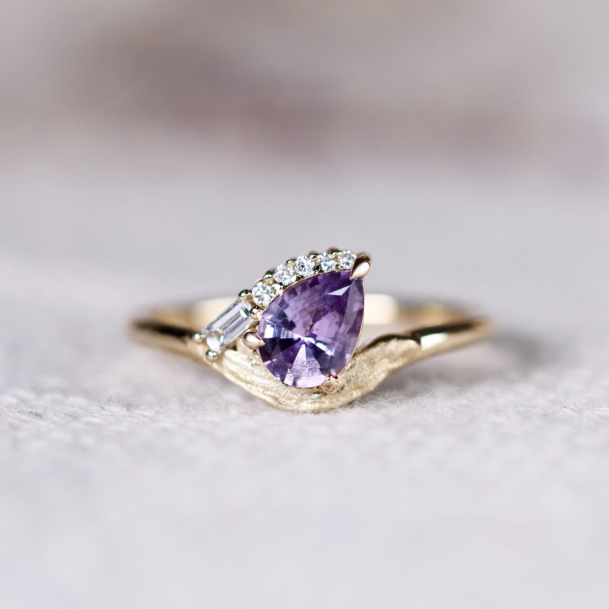 The Iris Purple is an ode to asymmetry, a canvas of deliberate artistry. At its center, a pear-shaped sapphire gleams in romantic purple, its vibrant hue softened by the creamy flow of a single brushstroke. A baguette diamond and five luminous white diamonds line its unique form, like stars illuminating an artist’s midnight reverie.