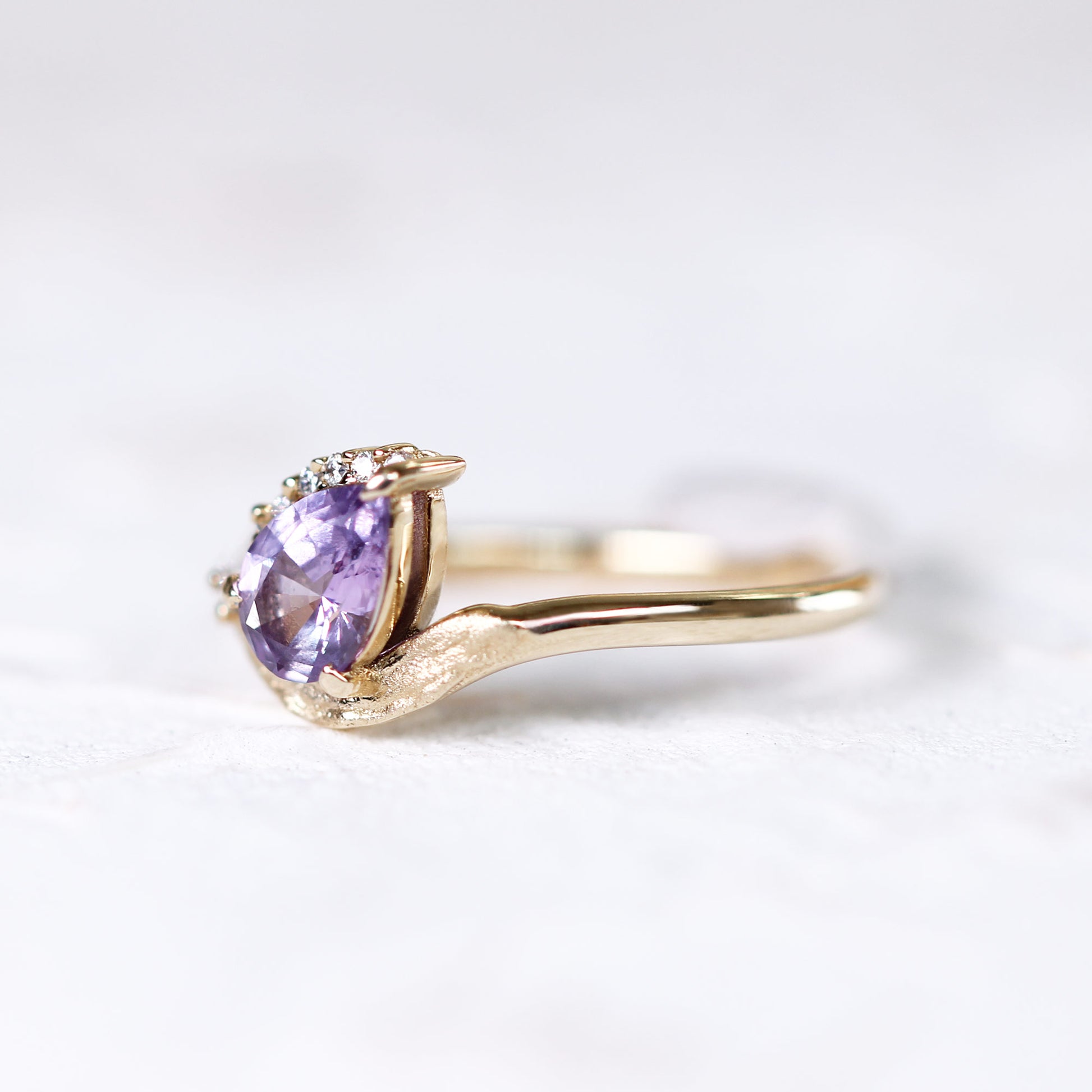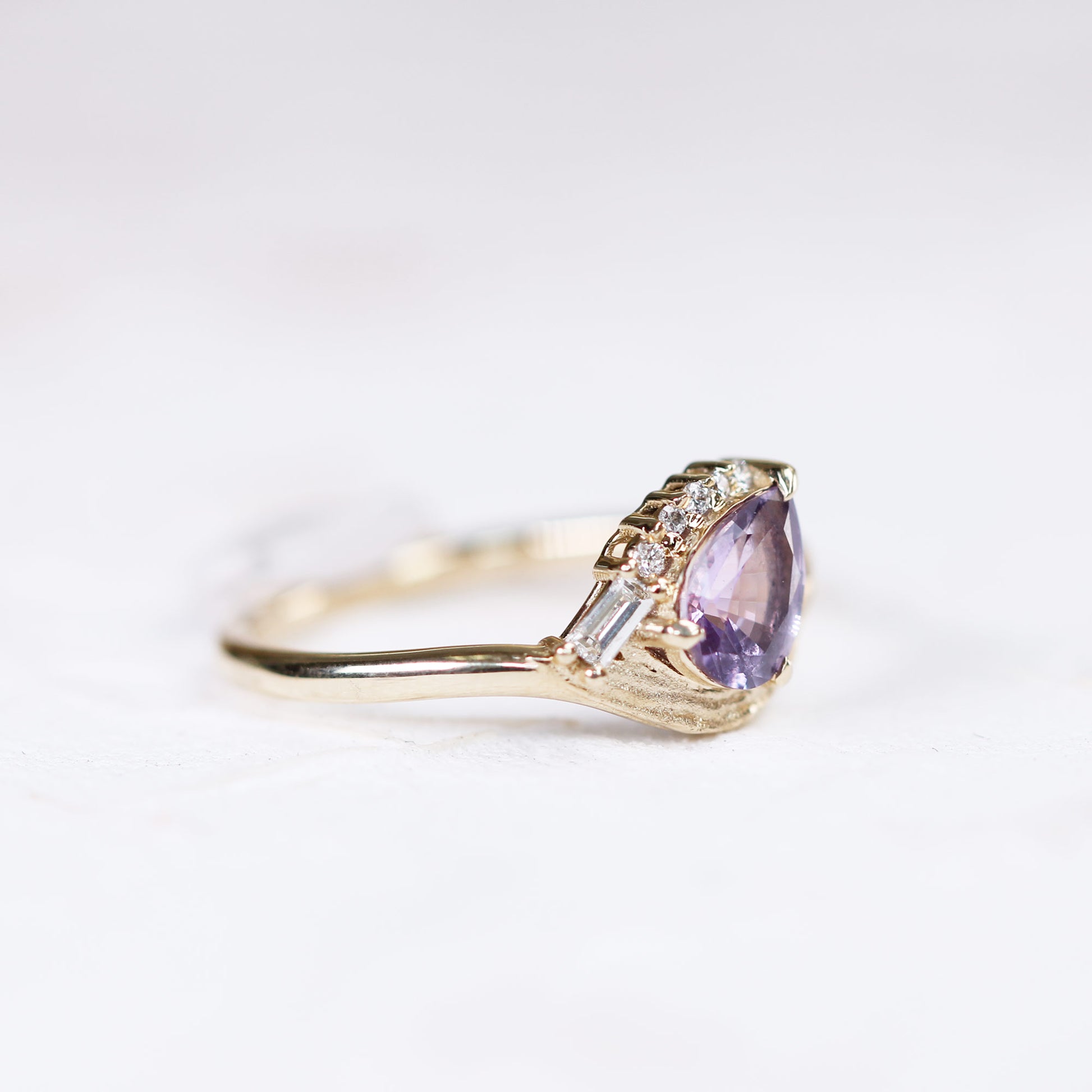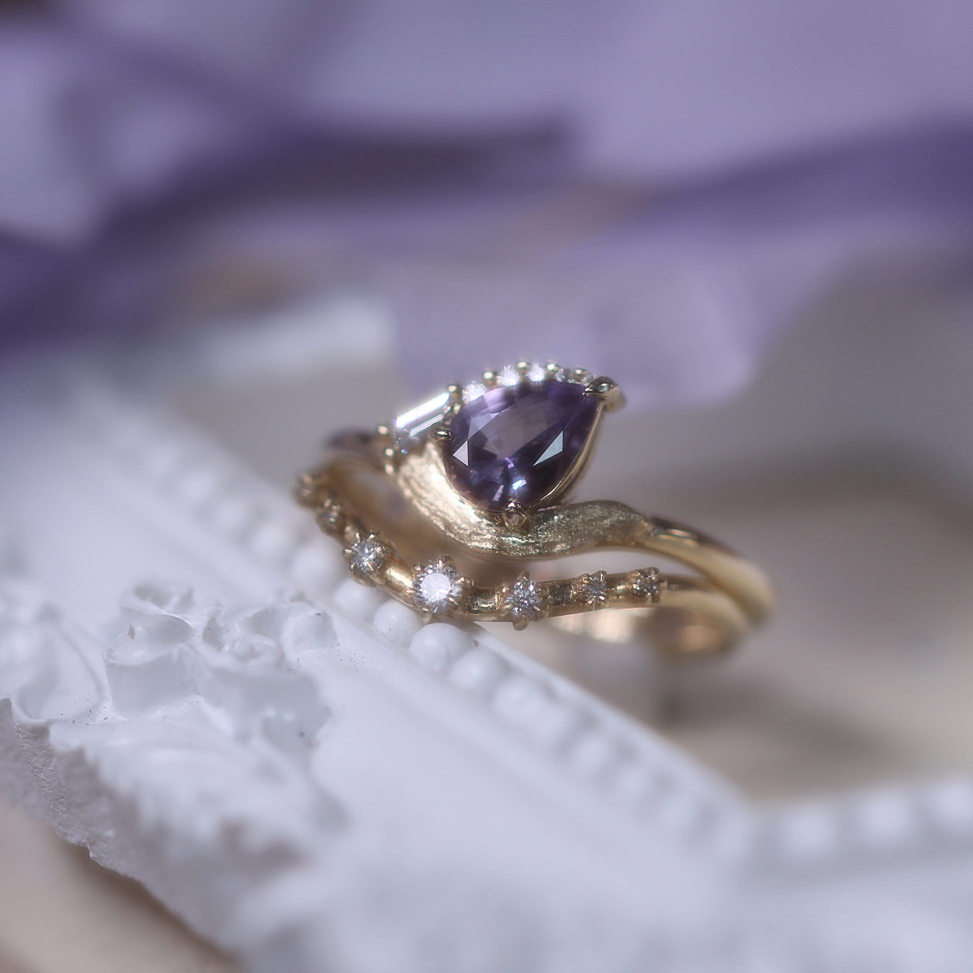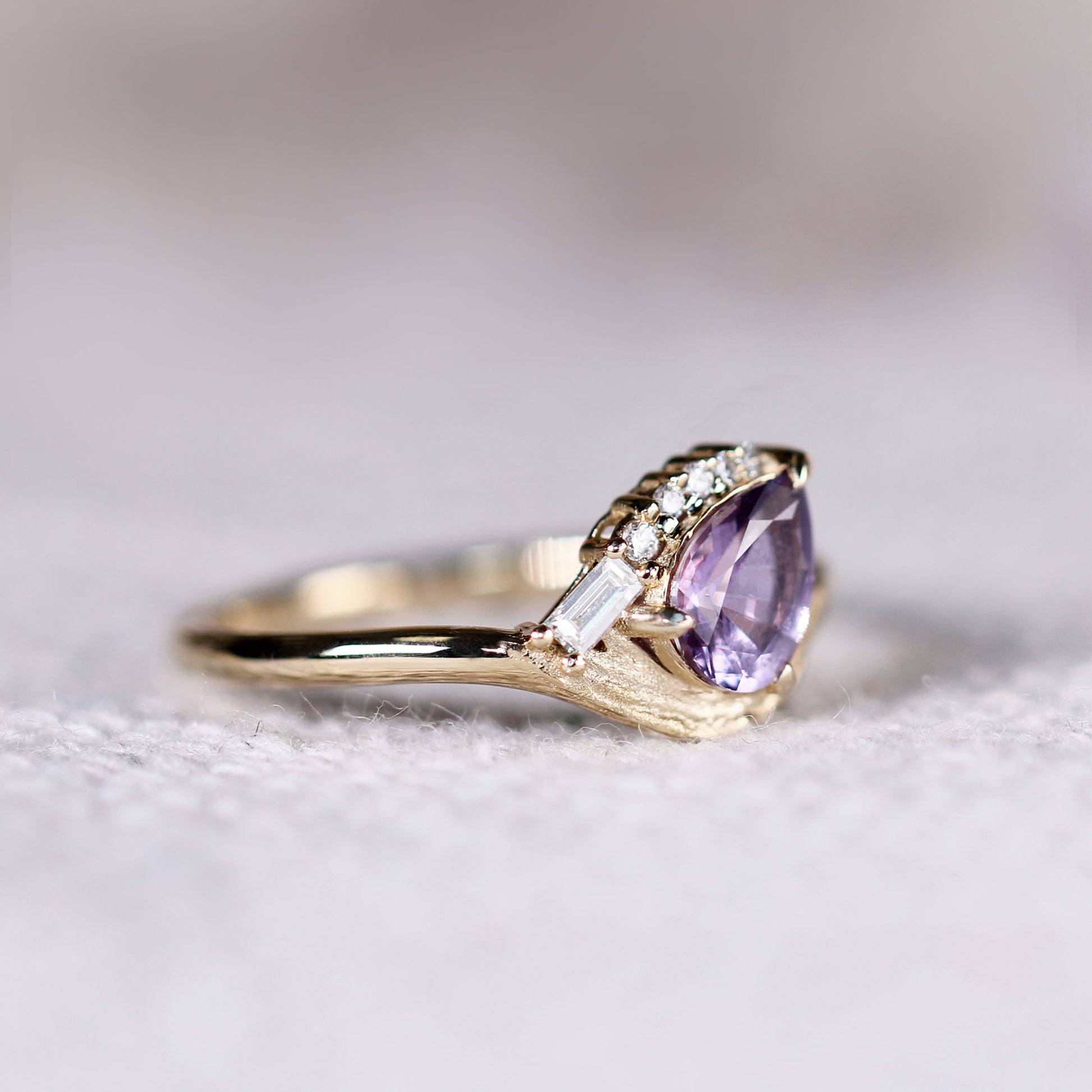 The Iris Purple is an ode to asymmetry, a canvas of deliberate artistry. At its center, a pear-shaped sapphire gleams in romantic purple, its vibrant hue softened by the creamy flow of a single brushstroke. A baguette diamond and five luminous white diamonds line its unique form, like stars illuminating an artist’s midnight reverie.