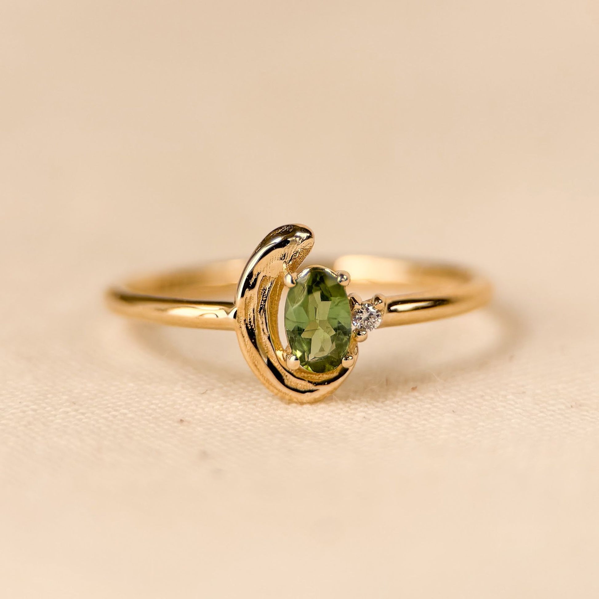 - Center Stone: Green Oval Tourmaline 6x3mm; weight estimation: 0.26 cts.