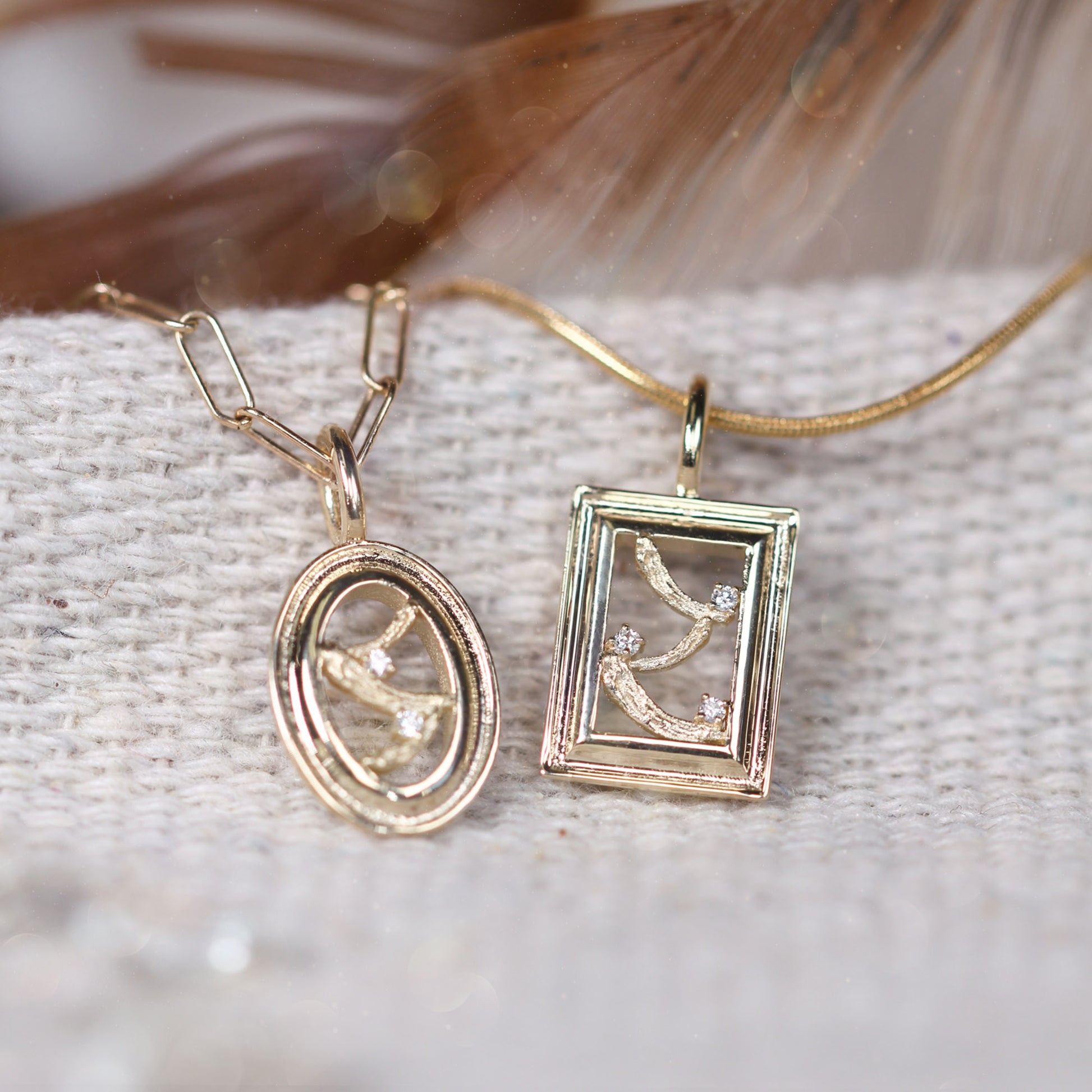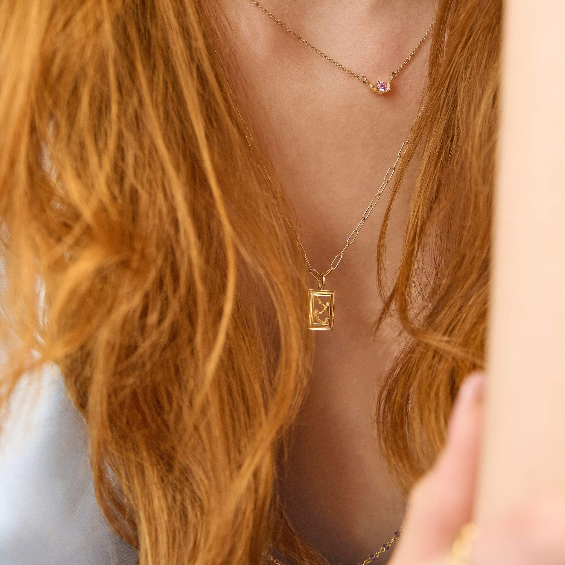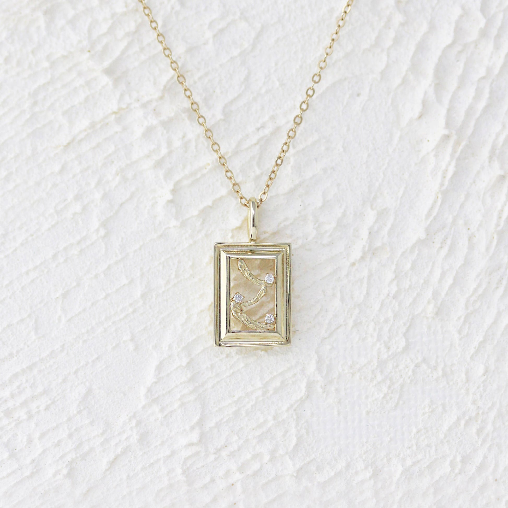 The La Peinture No. 2 Pendant reimagines the painter’s canvas in a rectangular form, where gold frames a delicate interplay of texture and light. Two white diamonds shimmer amidst intricate brushstroke patterns, evoking the enduring romance of vintage artistry with a distinctly modern flair.