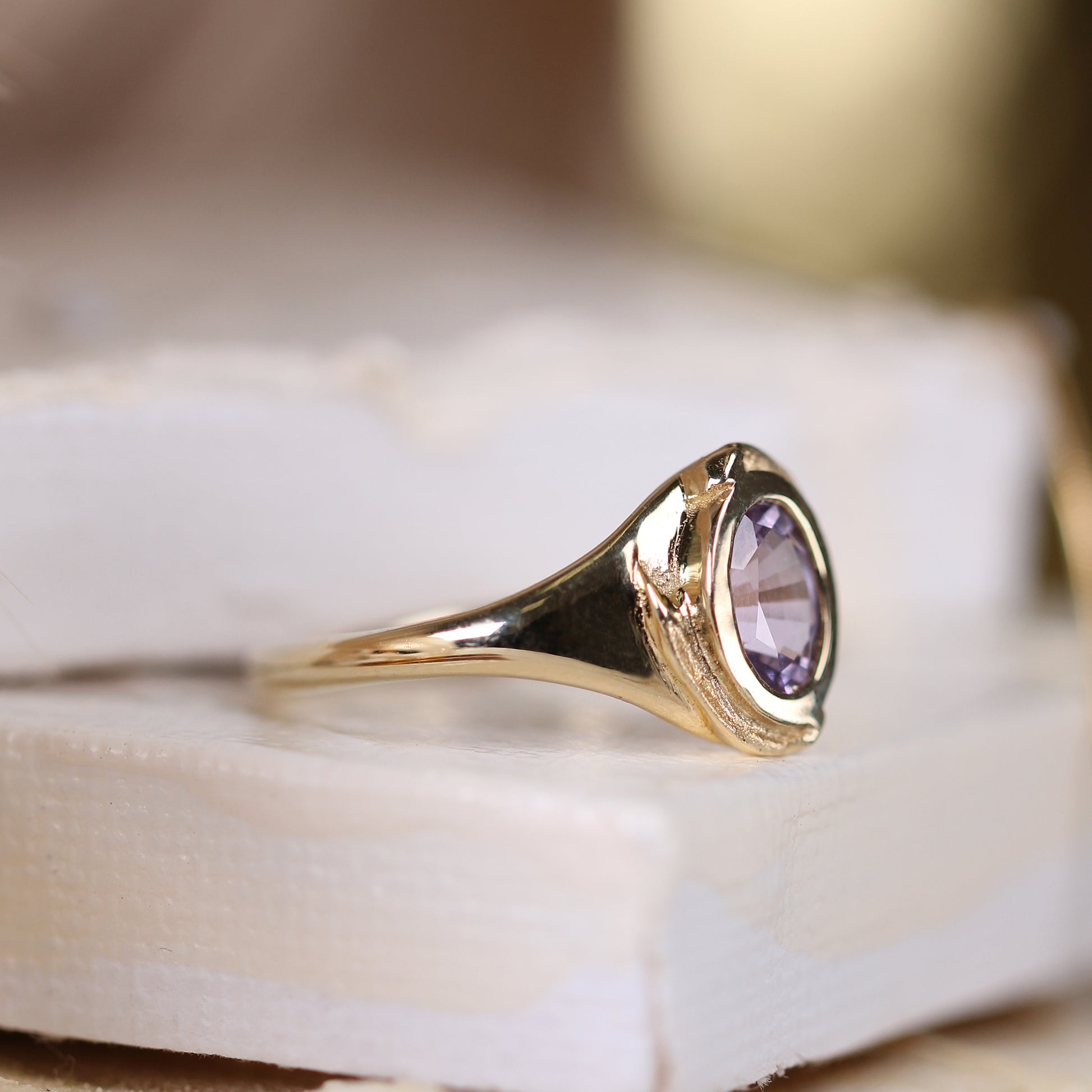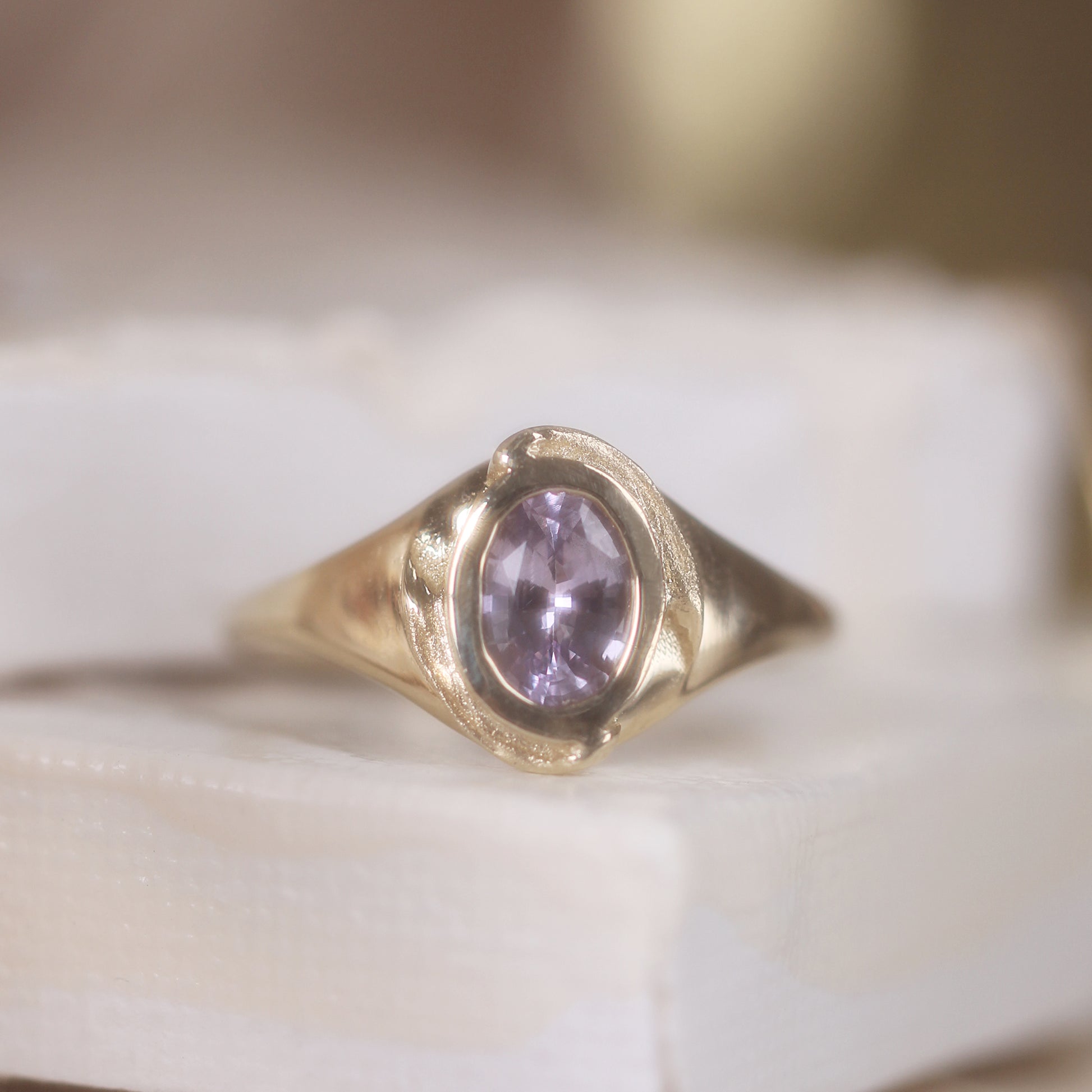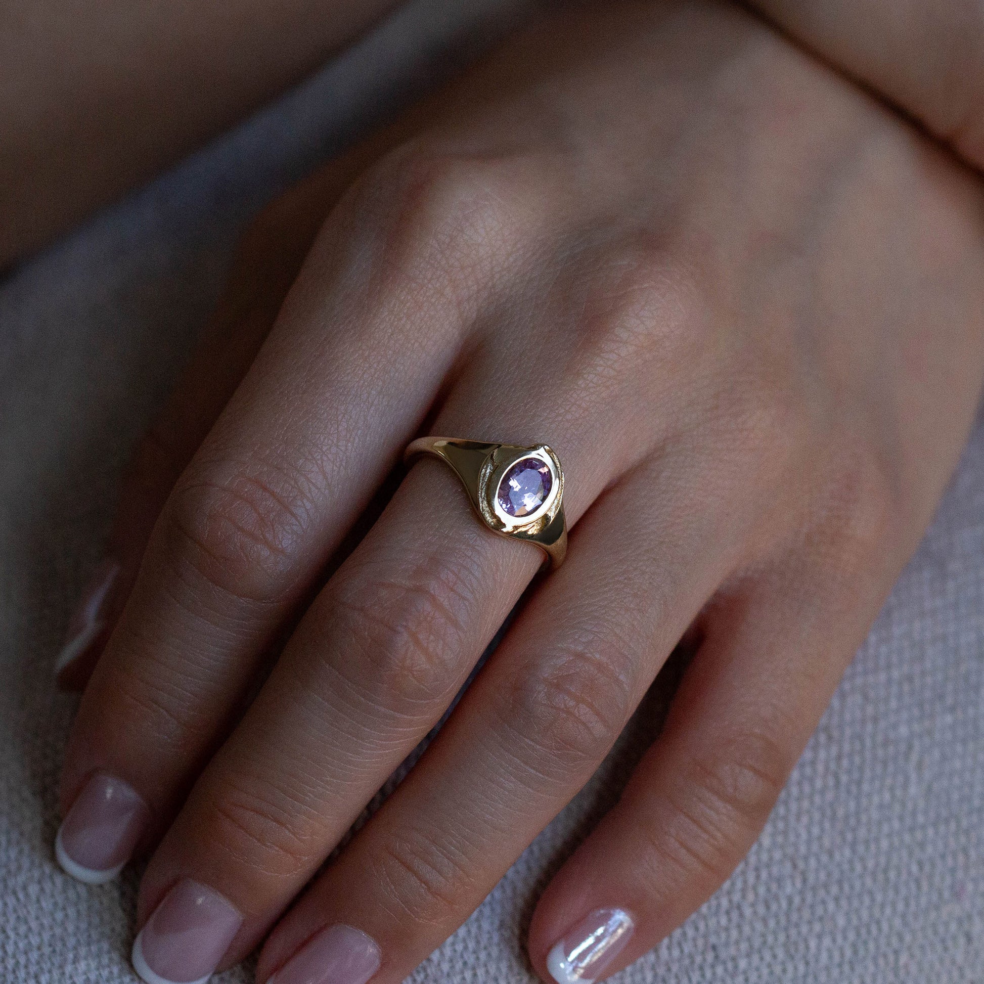 The Lavender is a tribute to prosperity in every facet of your artistic journey. At its heart, a glowing purple sapphire is embraced by delicate yet buttery gold brushstrokes. With its smooth design promising unparalleled comfort, this piece becomes a wearable celebration of creativity, sophistication and success.