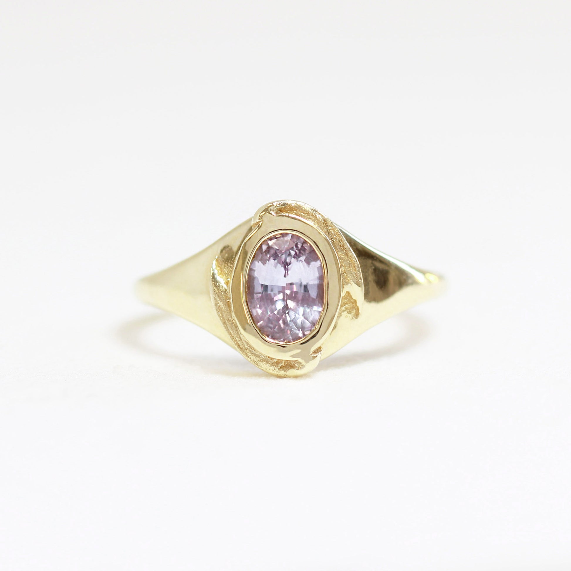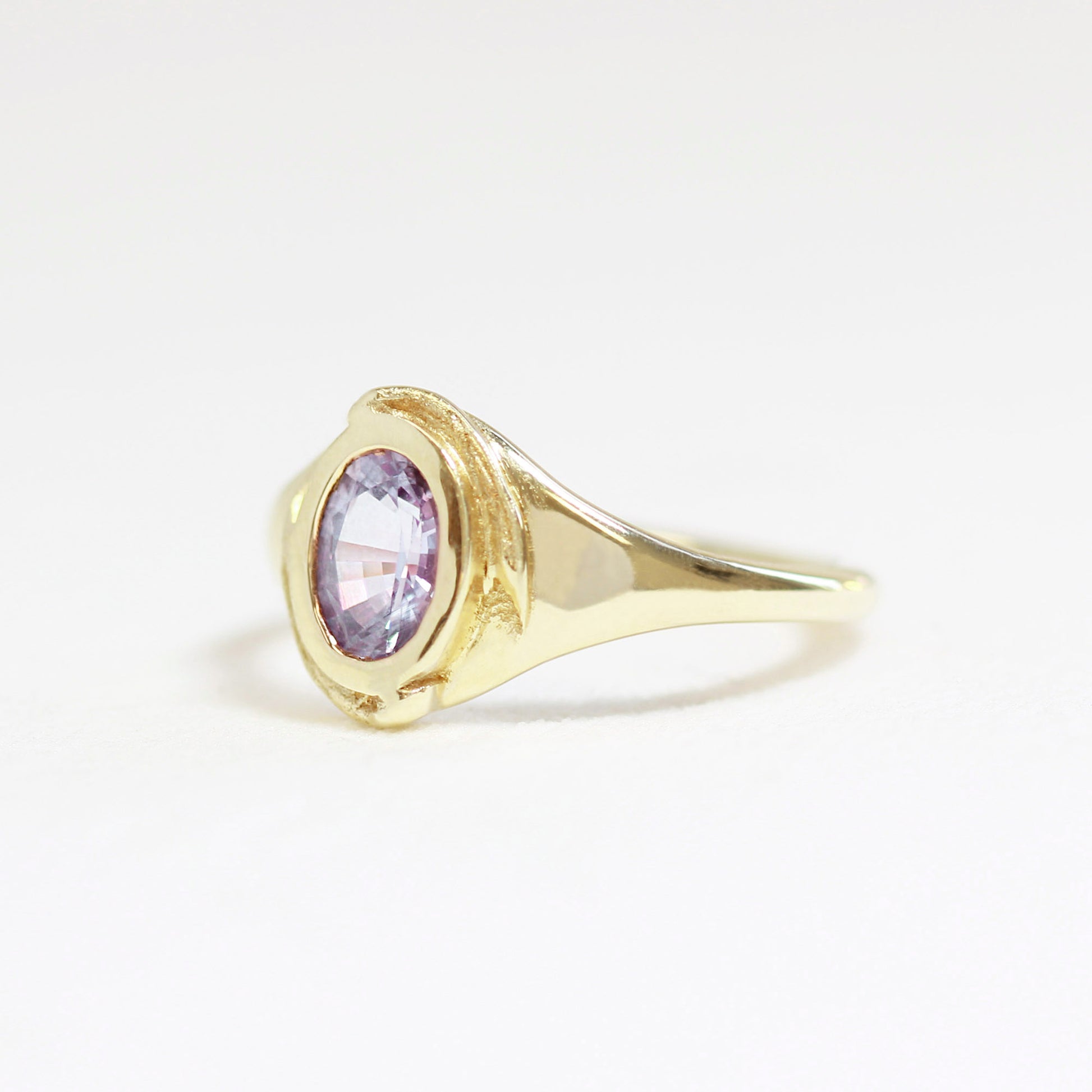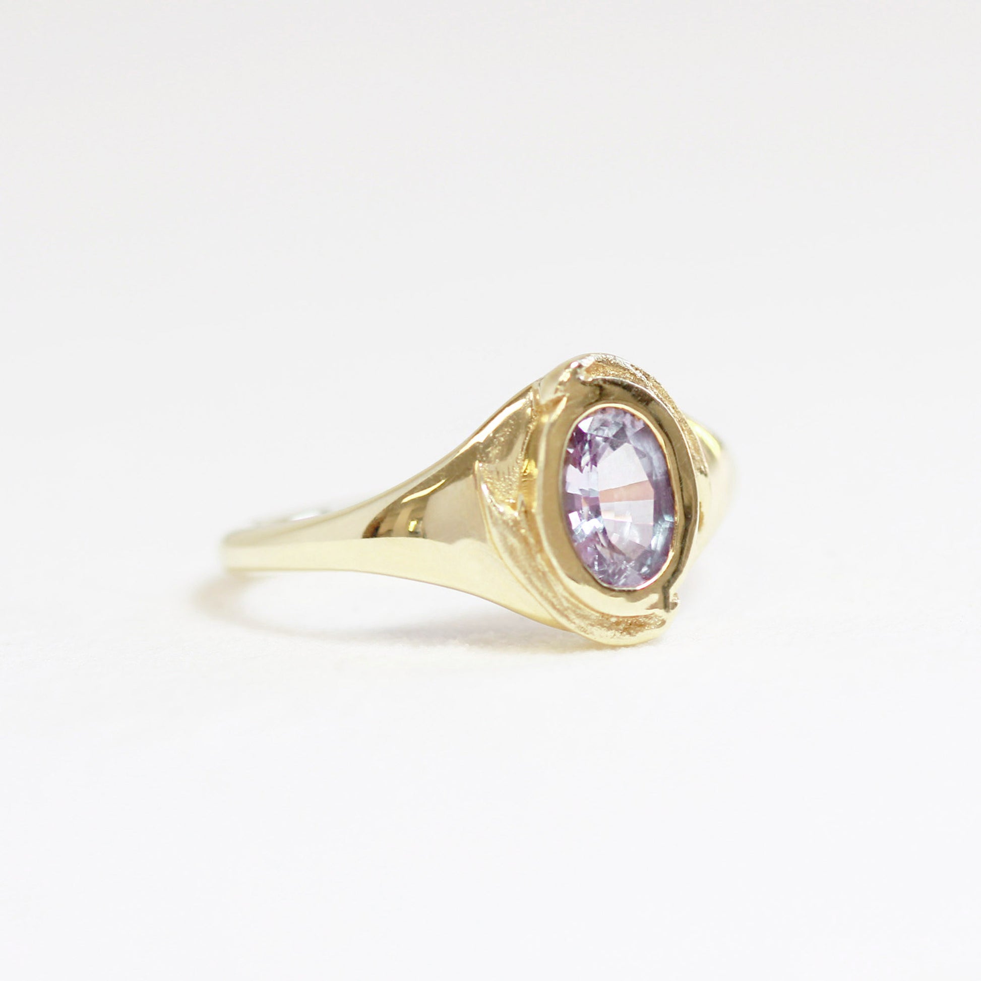 The Lavender is a tribute to prosperity in every facet of your artistic journey. At its heart, a glowing purple sapphire is embraced by delicate yet buttery gold brushstrokes. With its smooth design promising unparalleled comfort, this piece becomes a wearable celebration of creativity, sophistication and success.