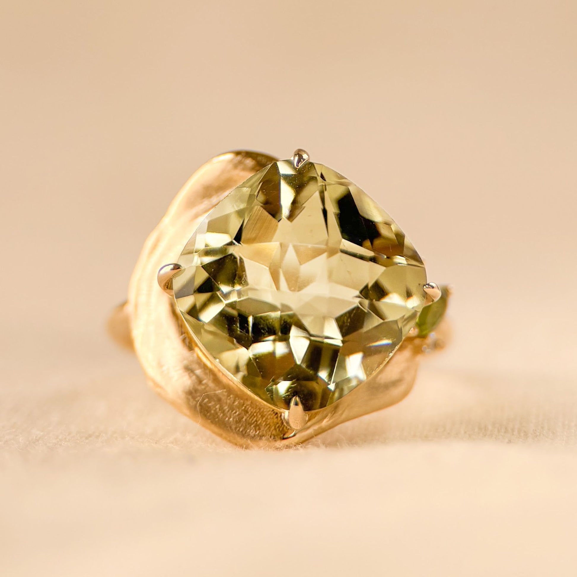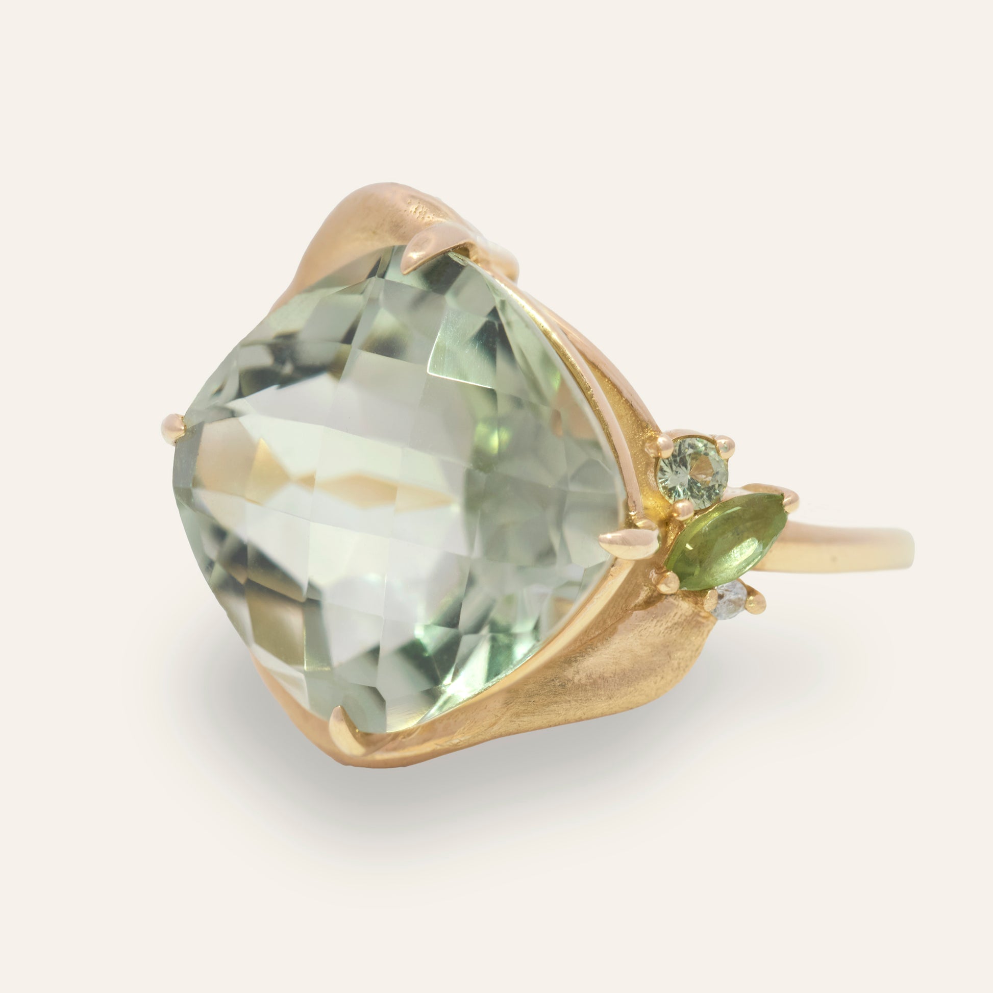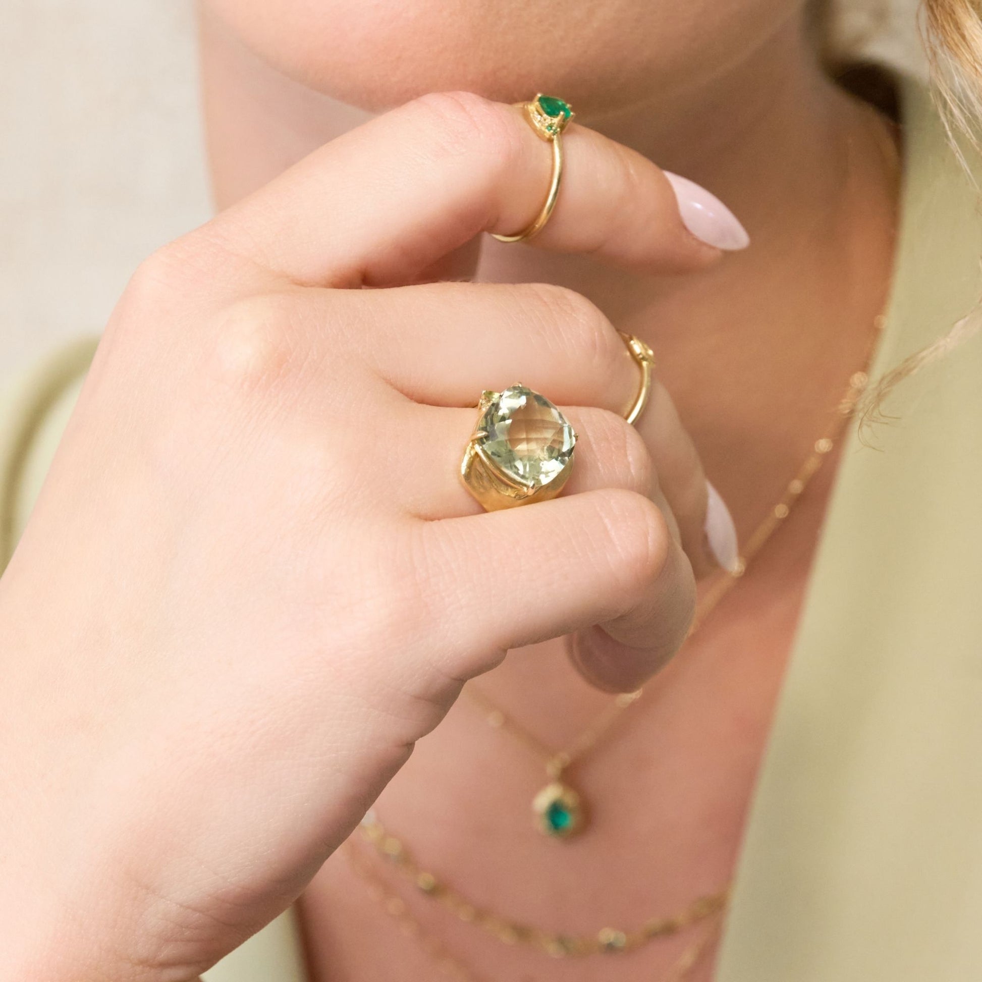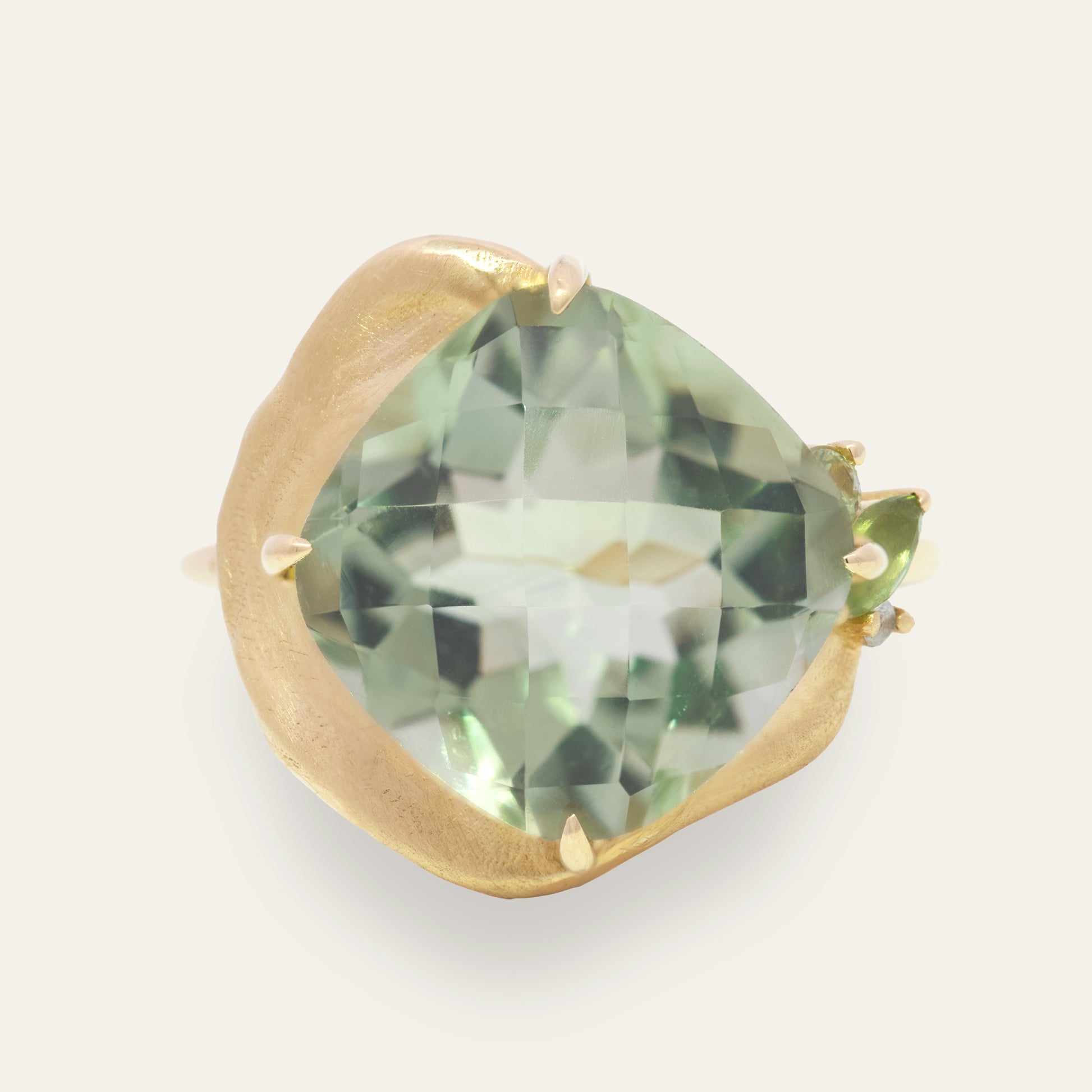 A green amethyst anchors the Lime Riffle ring, glowing with soft vibrance and sculptural clarity. Nestled at the base of the setting, a marquise green sapphire, a round sapphire, and a single diamond offer quiet sparkle—like spring’s first light filtering through tender leaves. The sweeping gold form evokes the gesture of an oil painting brushstroke, a graceful tribute to nature’s renewal and the artistry of subtle detail.