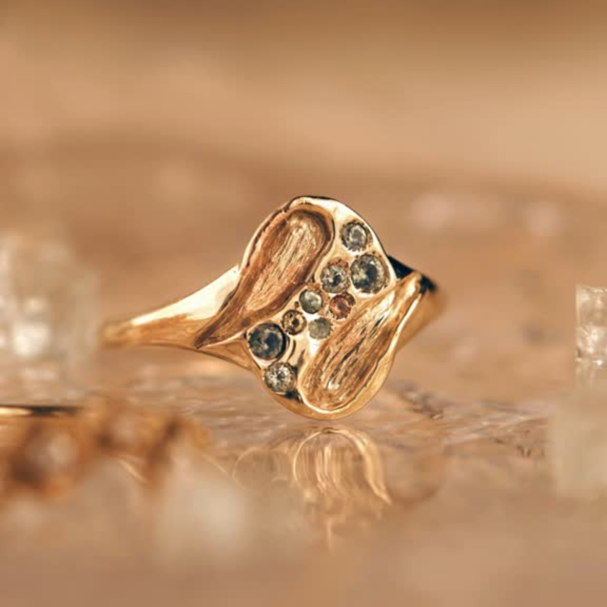 Reimagining Monet’s iconic poppy fields under the luminous midday sun, the Meadow Serenade (Midday) features round brilliant-cut sapphires that exude a subtle, glowing light with every movement. This smooth signet design flaunts pressed brushstroke textures that flow gracefully onto the ring’s shoulders, creating an elegant and sophisticated allure.