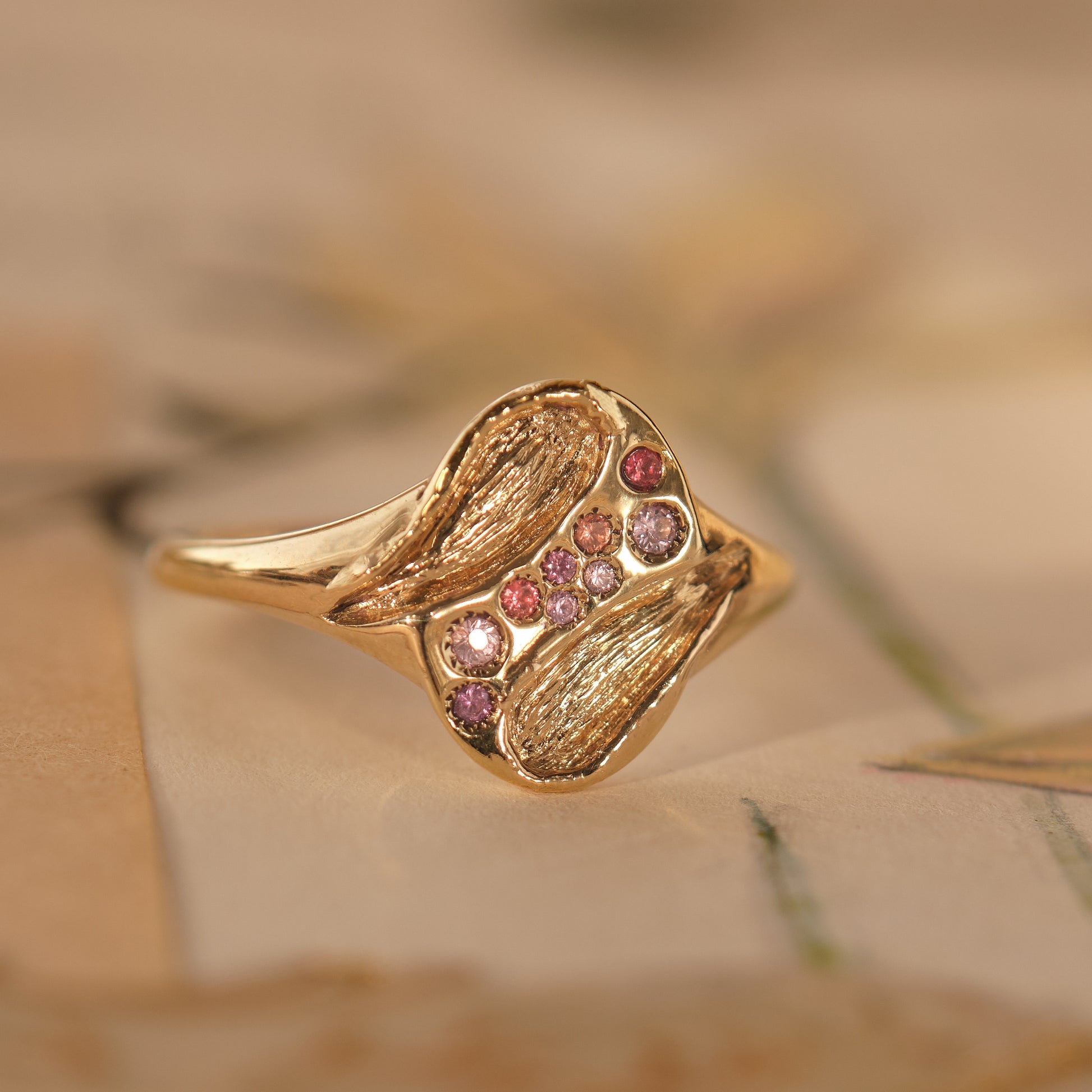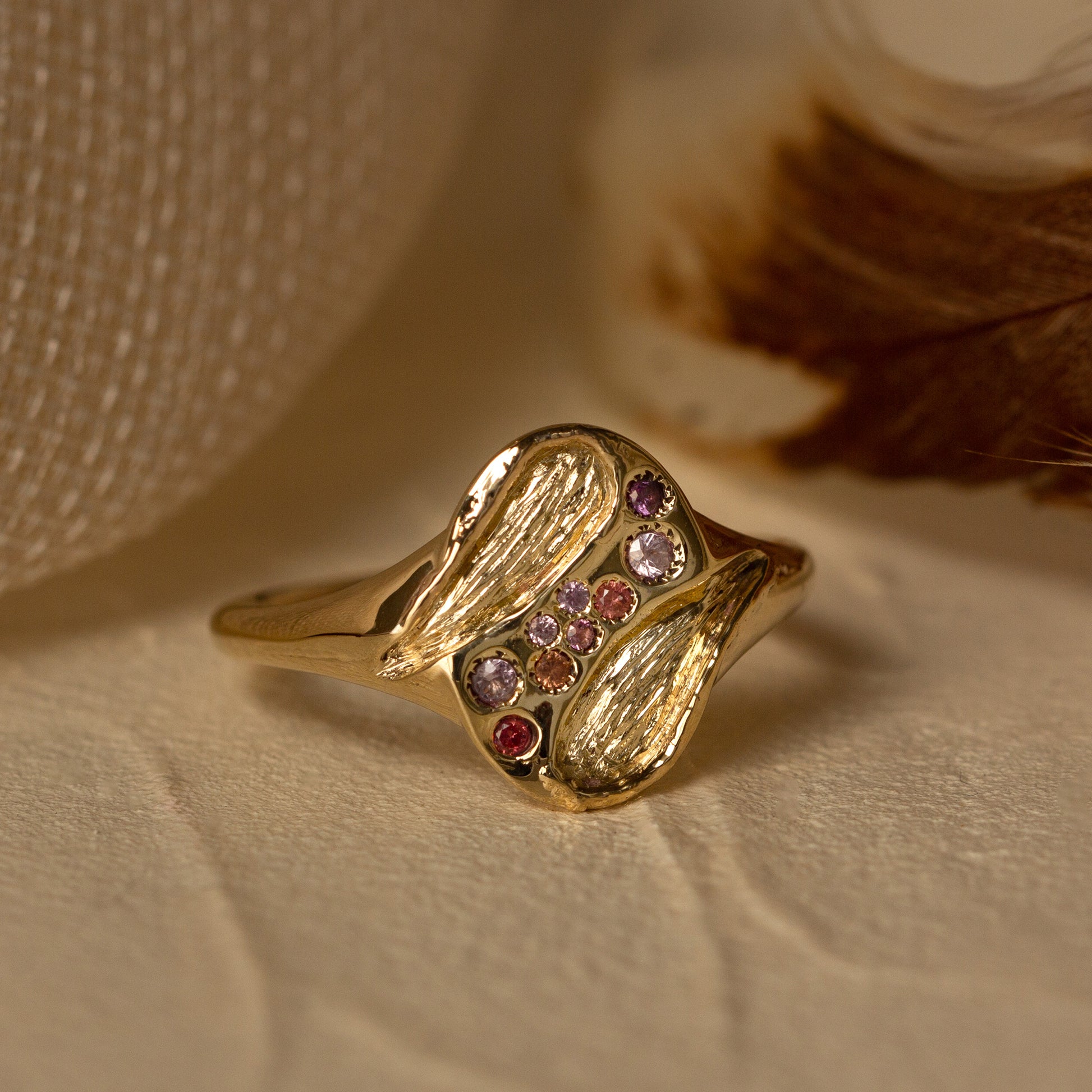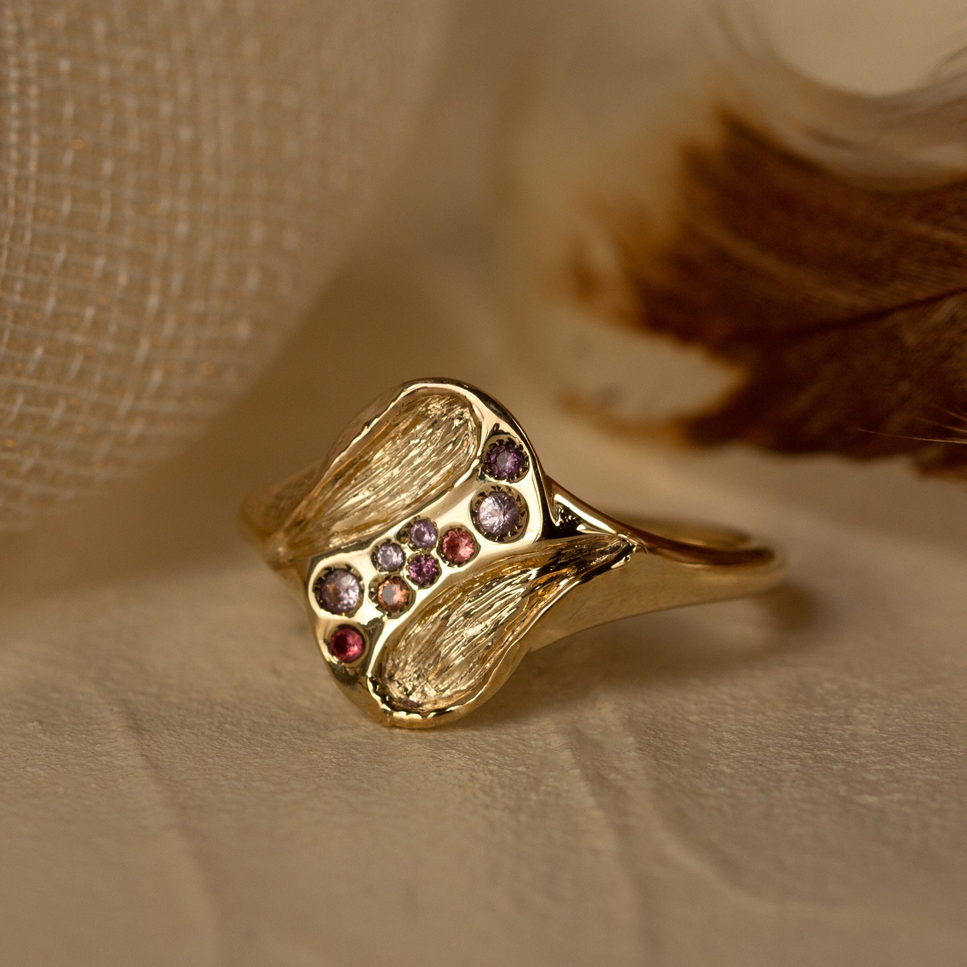 Inspired by Monet’s many poppy field paintings, reimagined in the warm glow of sunset, the Meadow Serenade (Sunset) features round brilliant-cut sapphires that radiate subtle brilliance with every movement. This smooth signet design flaunts pressed brushstroke textures that flow gracefully onto the ring’s shoulders, creating an elegant and sophisticated allure.