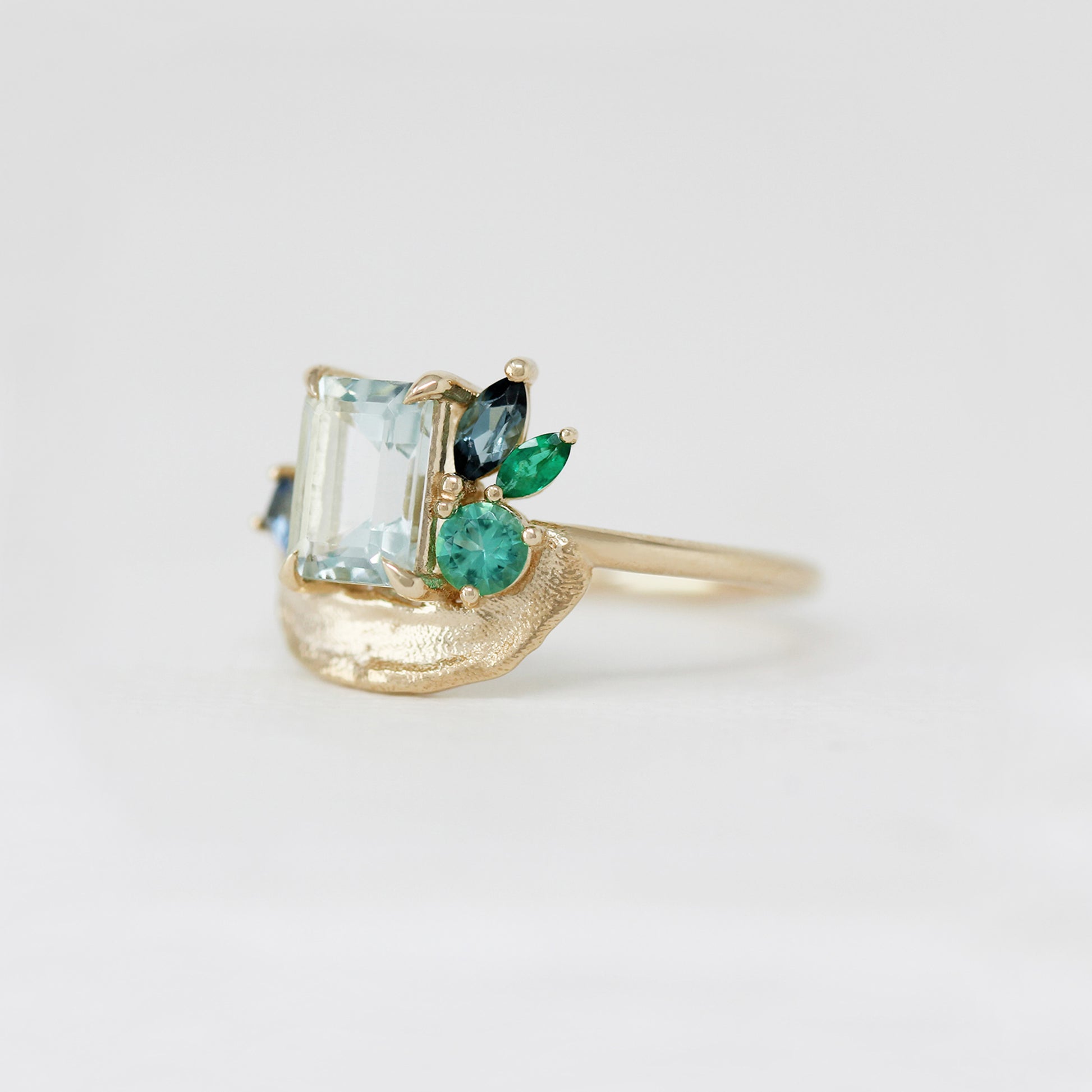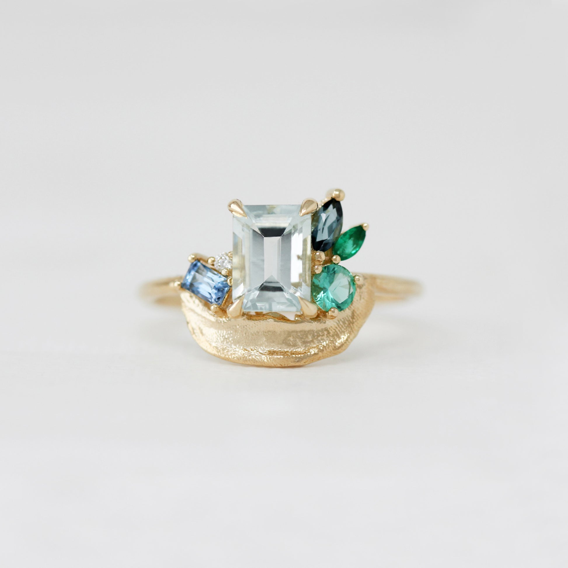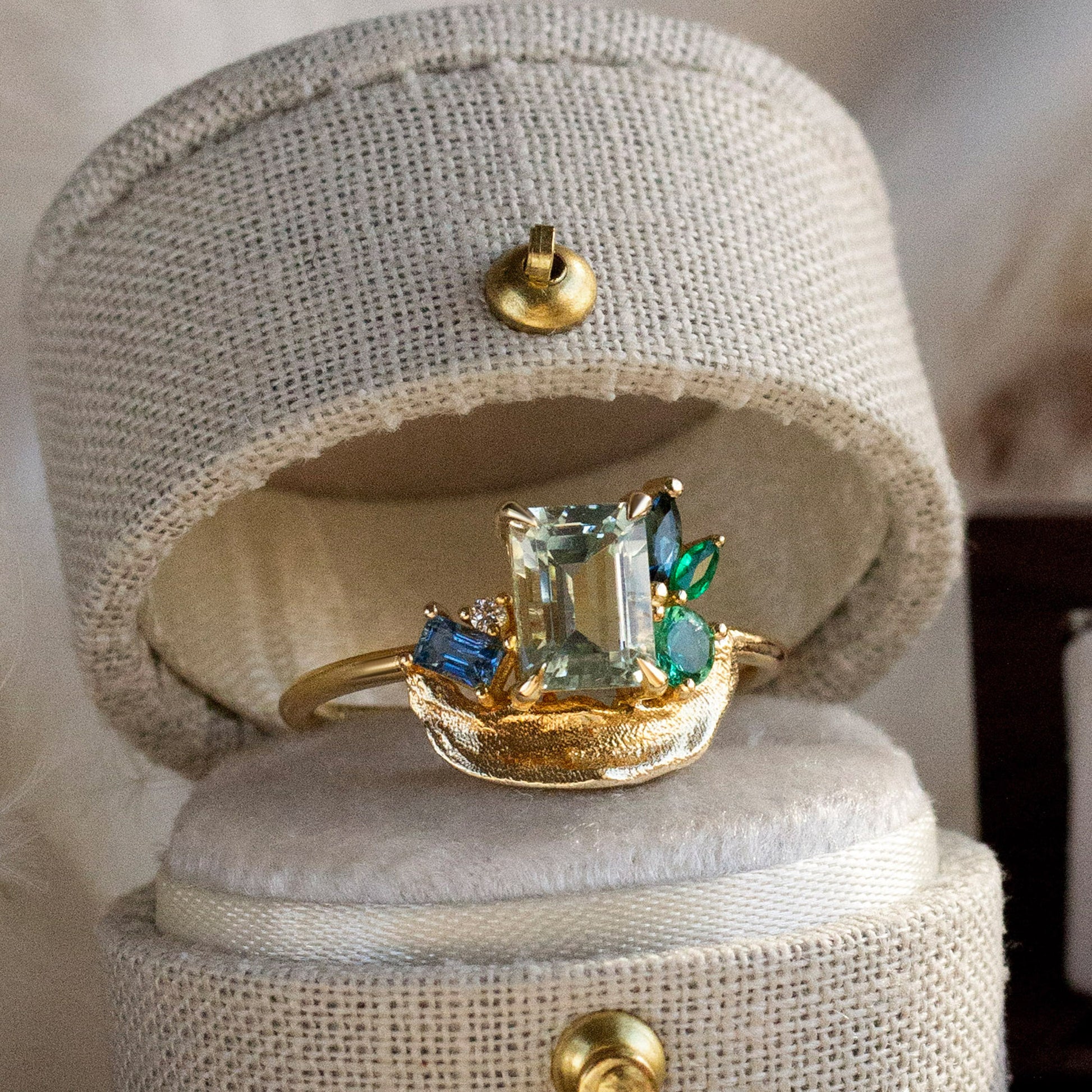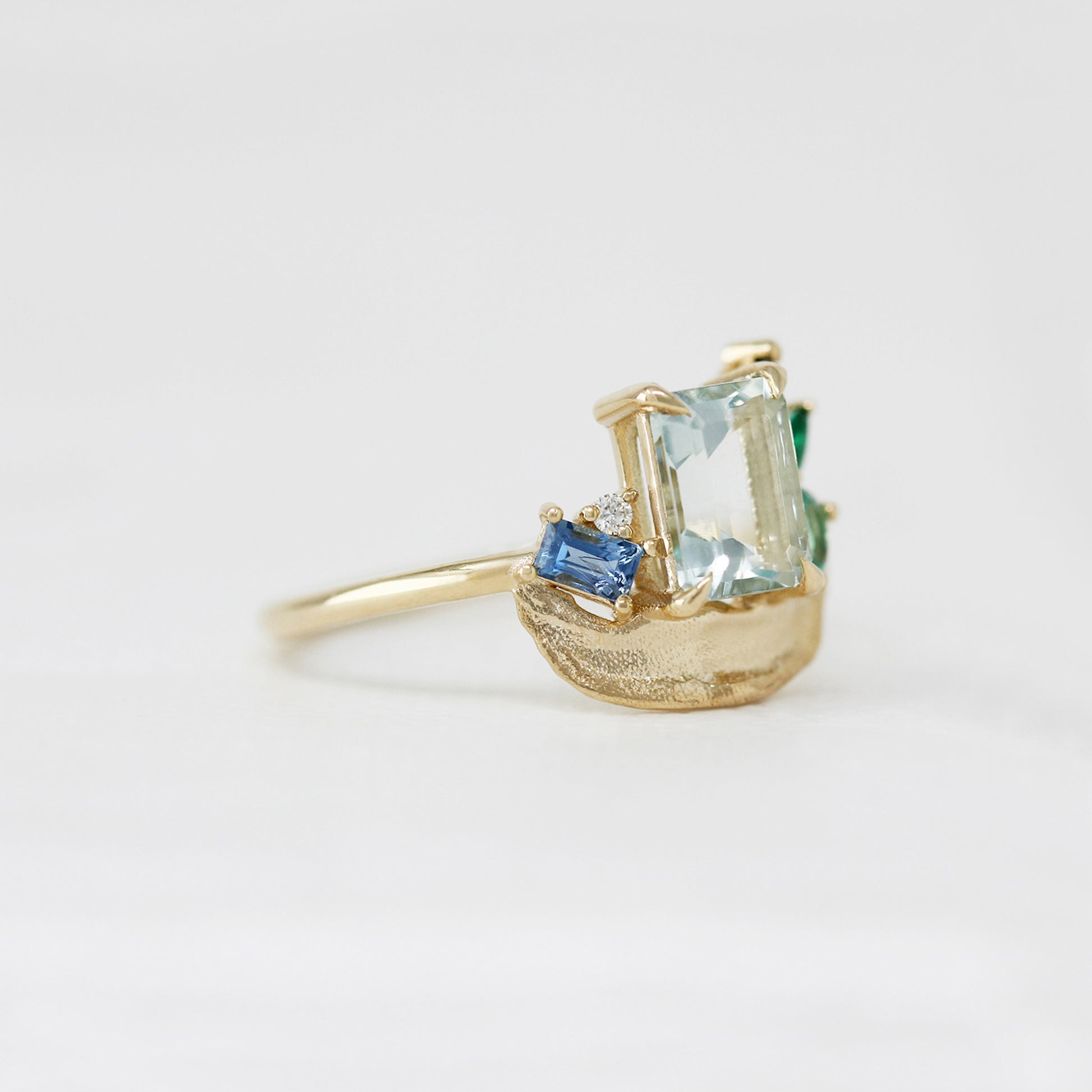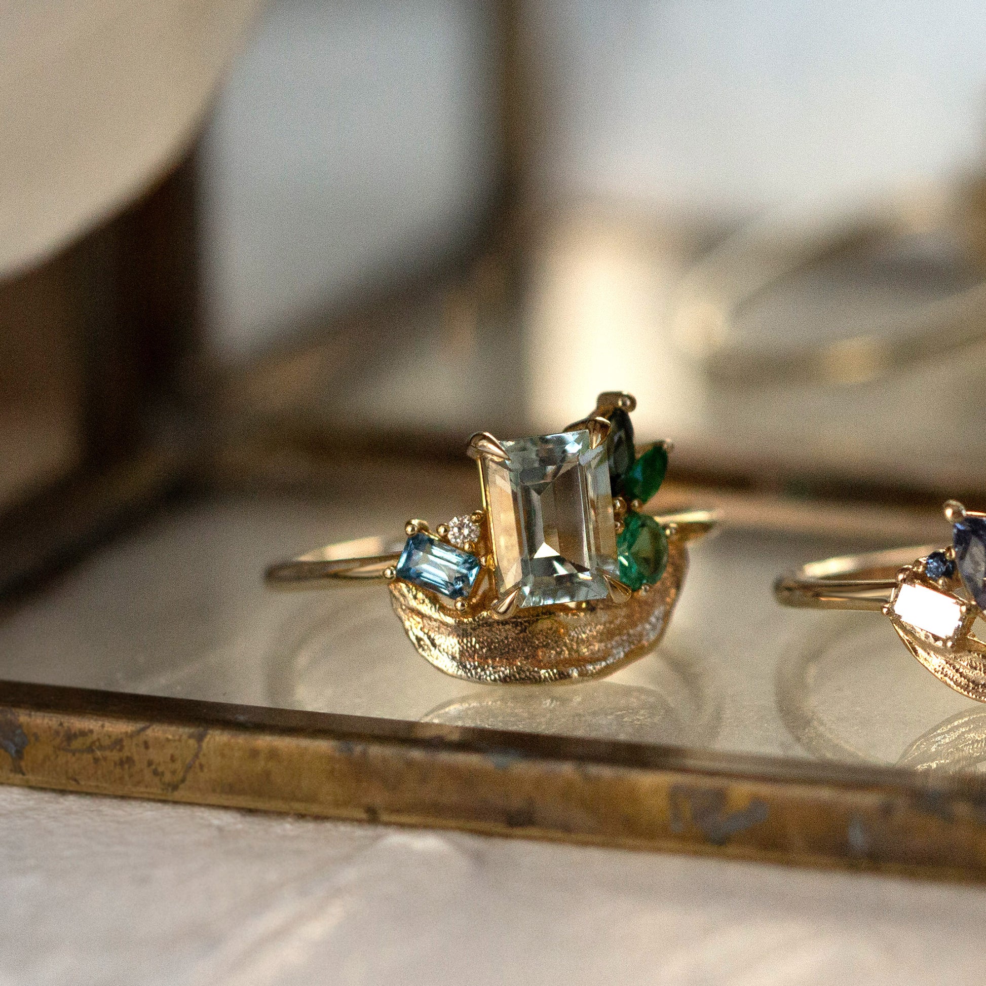 Take a walk to the scenic paradise of Monet’s lily ponds. Featuring a luminous palette of glistening blues and greens, the Mint Blush is adorned with an aquamarine, a topaz, a tourmaline, a diamond, and castleton-green emeralds that rest atop a slow, steady golden brushstroke texture to capture the tranquil beauty of nature in wearable form.