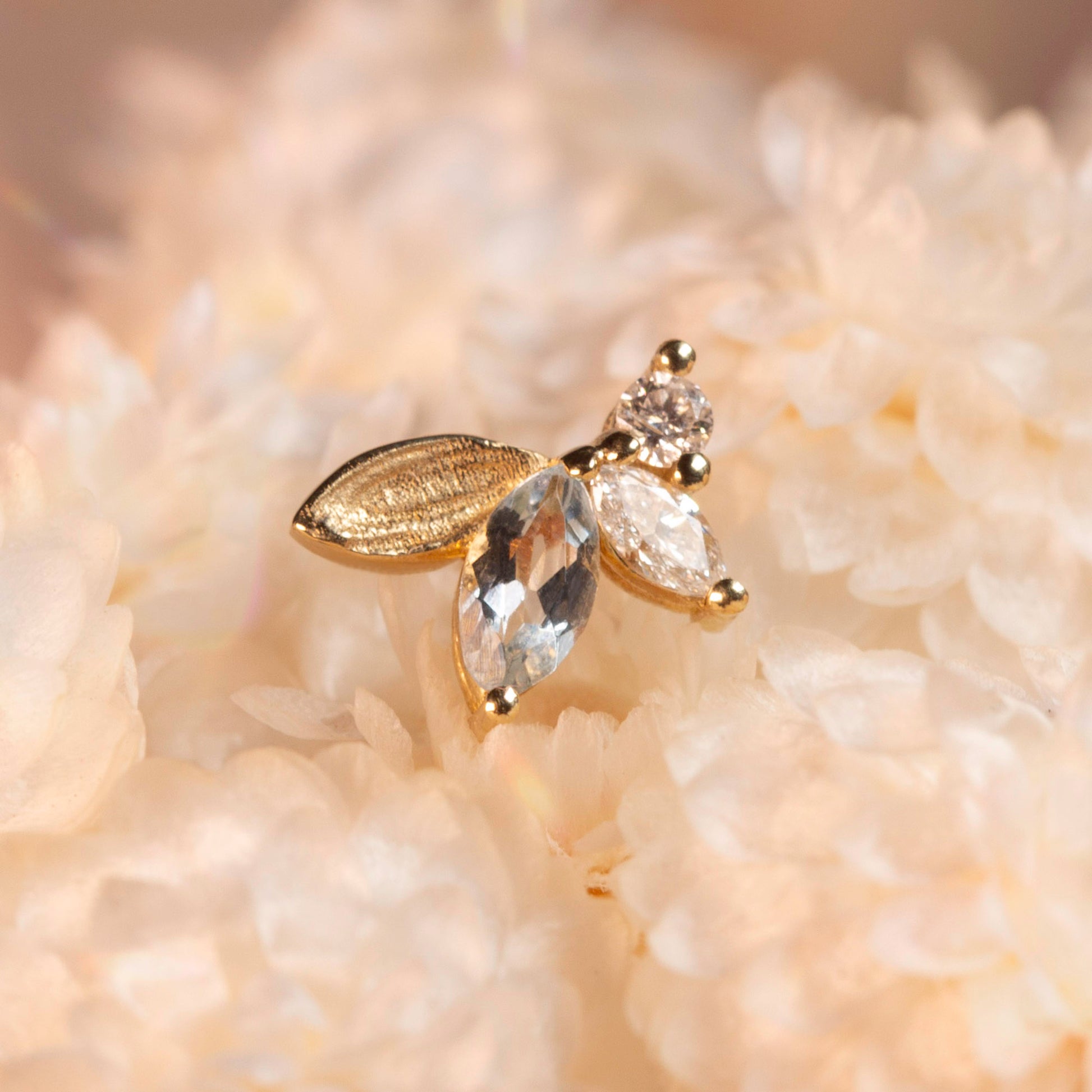 The Monet’s Lily Petals Earring features three petals reimagined with soft, ripple-like brushstroke texture, a crystalline aquamarine, an opulent marquise diamond, and a dazzling round diamond at the bottom, making it a dreamy addition to your earring collection.