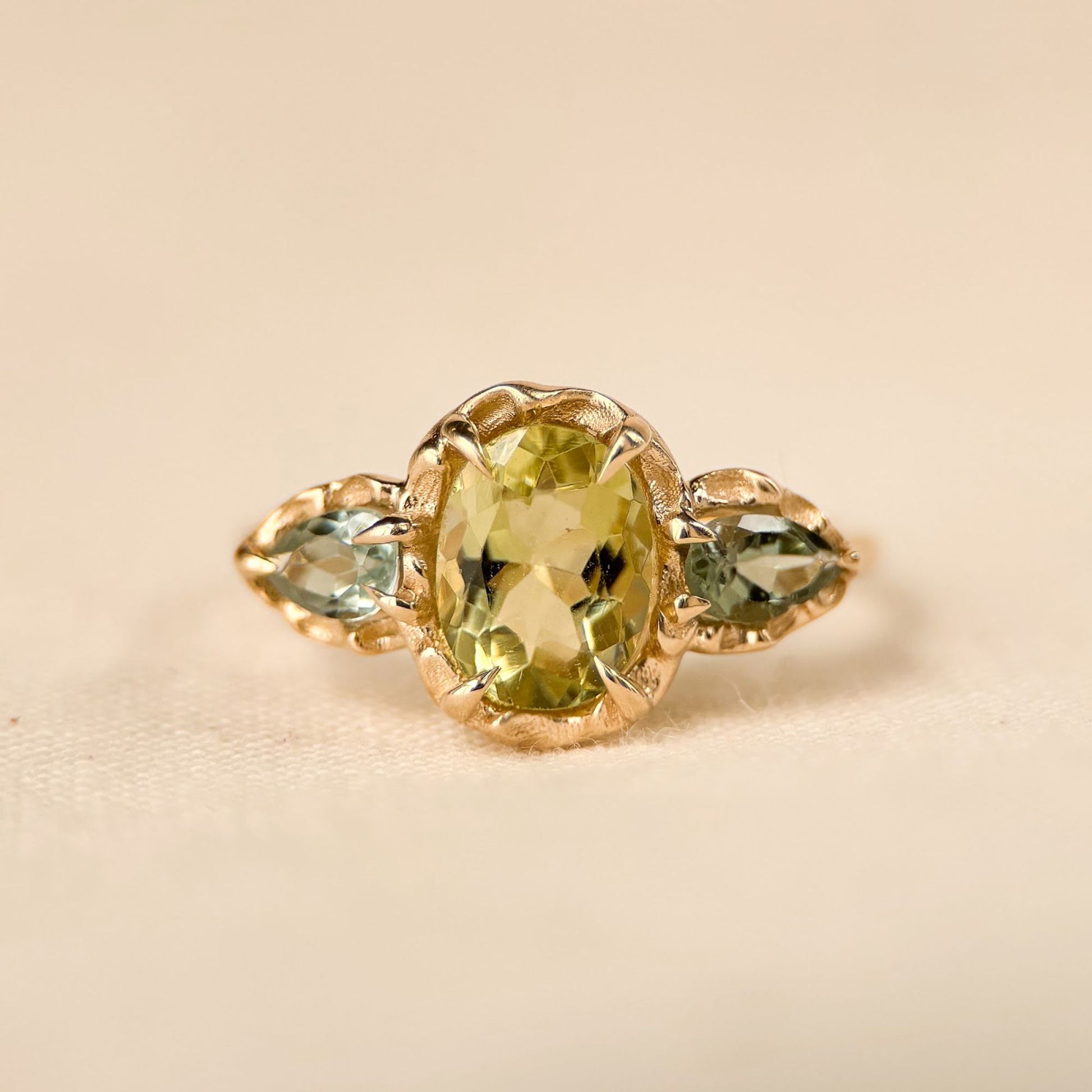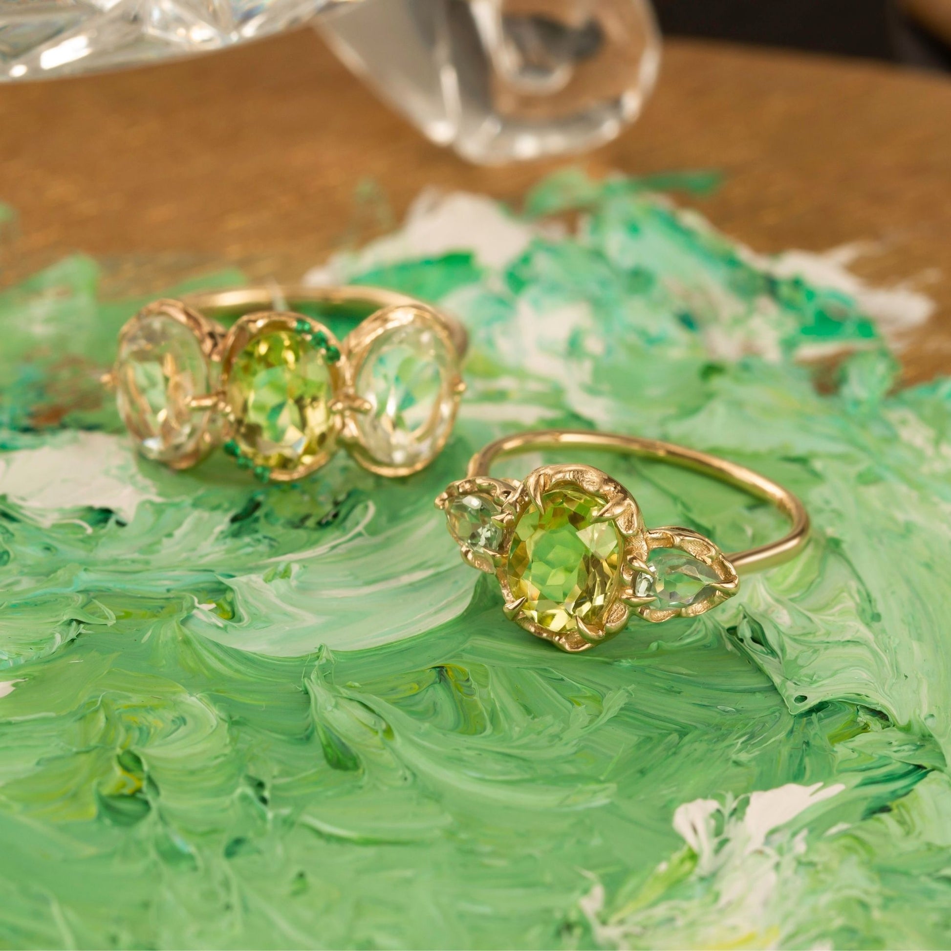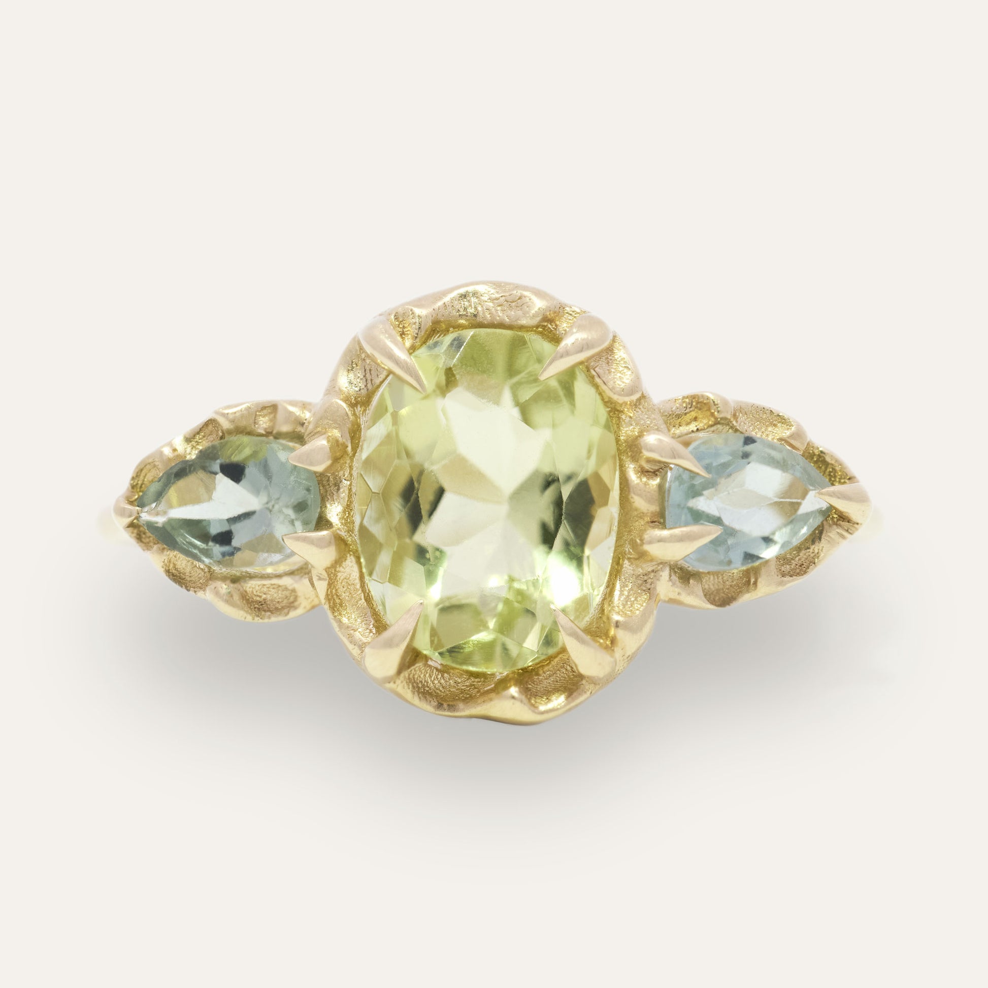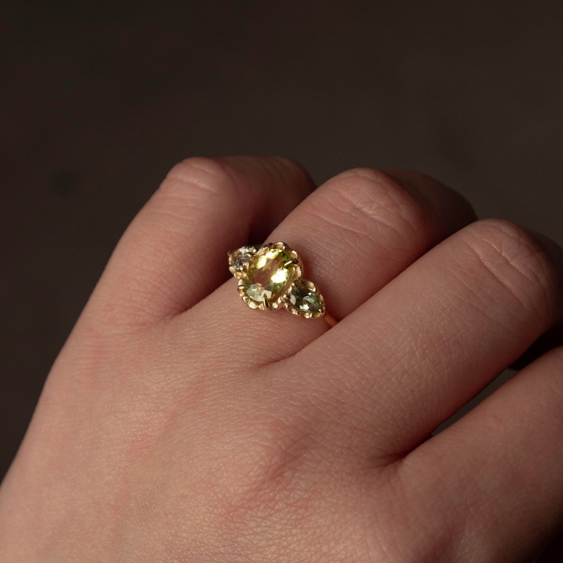 Bathed in the soft glow of early spring, the Dewleaf Green ring quietly celebrates renewal and grace. A luminous lime-green chrysoberyl radiates with golden-green fire, evoking young leaves catching the first light of day. Flanking it, two sage-hued pear-shaped tourmalines provide a gentle contrast, like shadows dancing beneath fresh foliage.