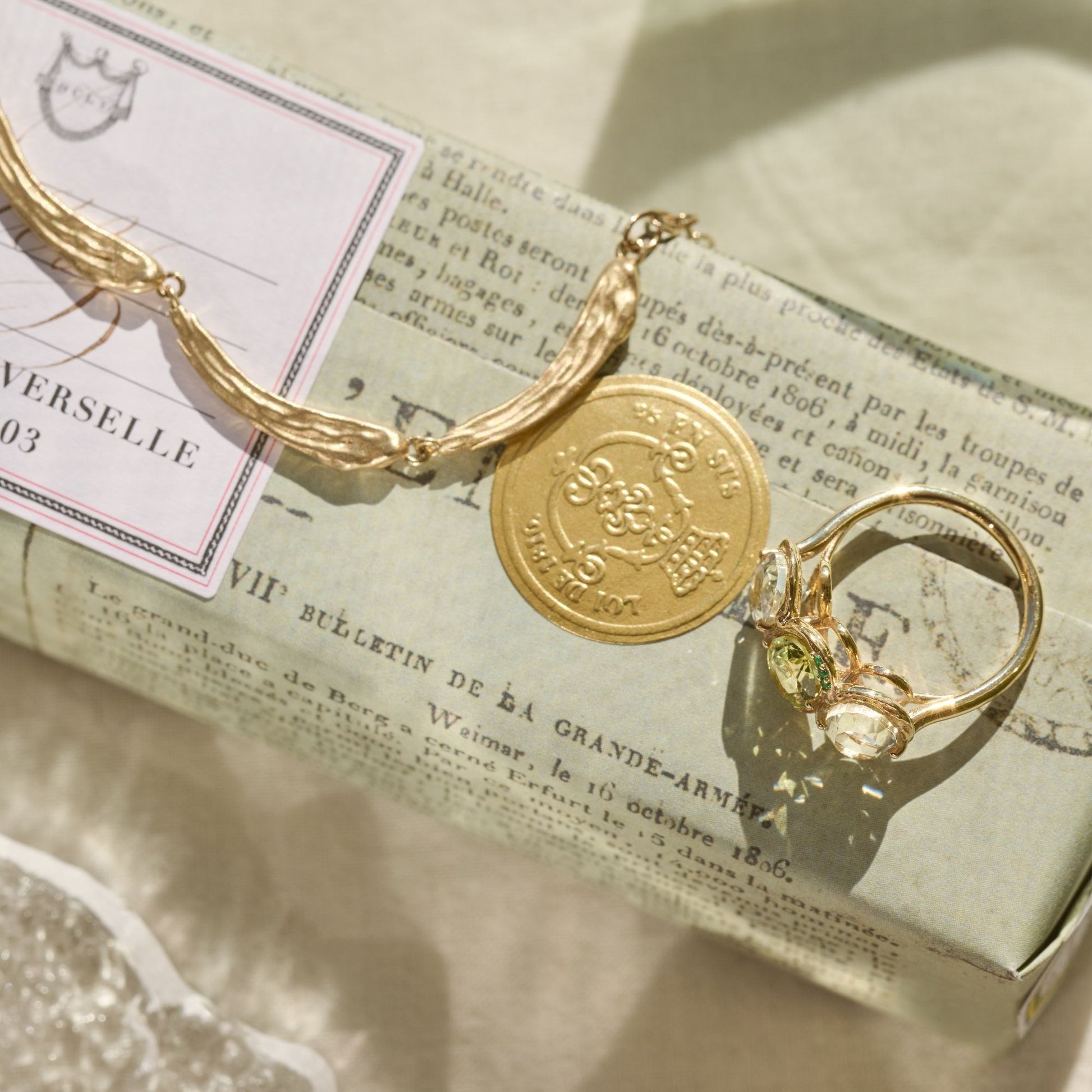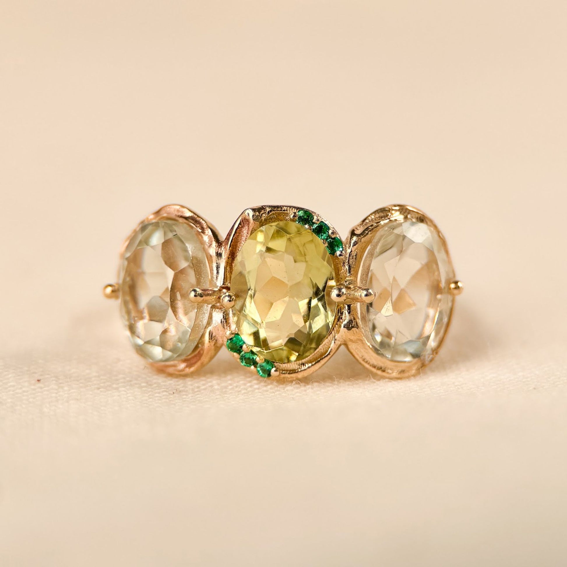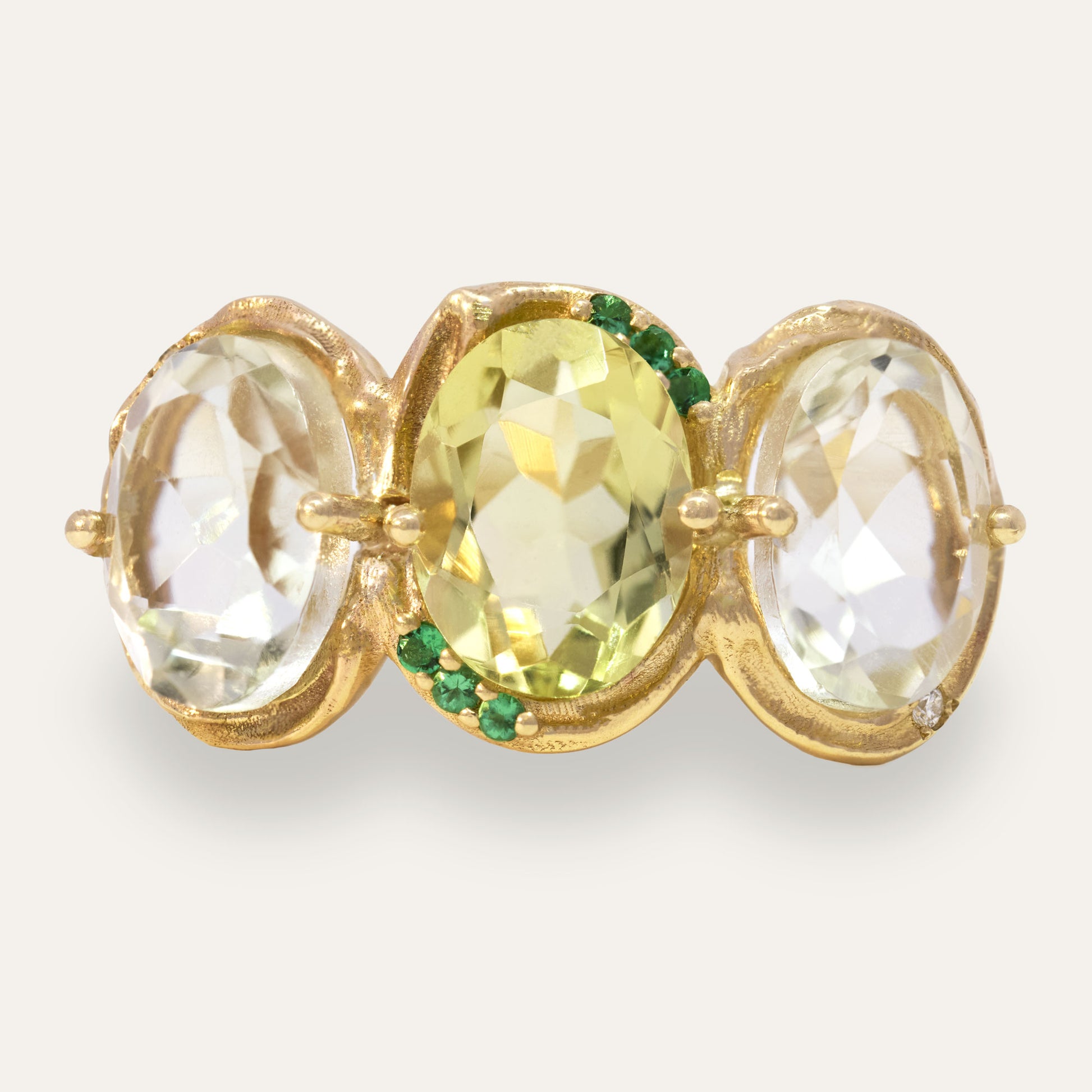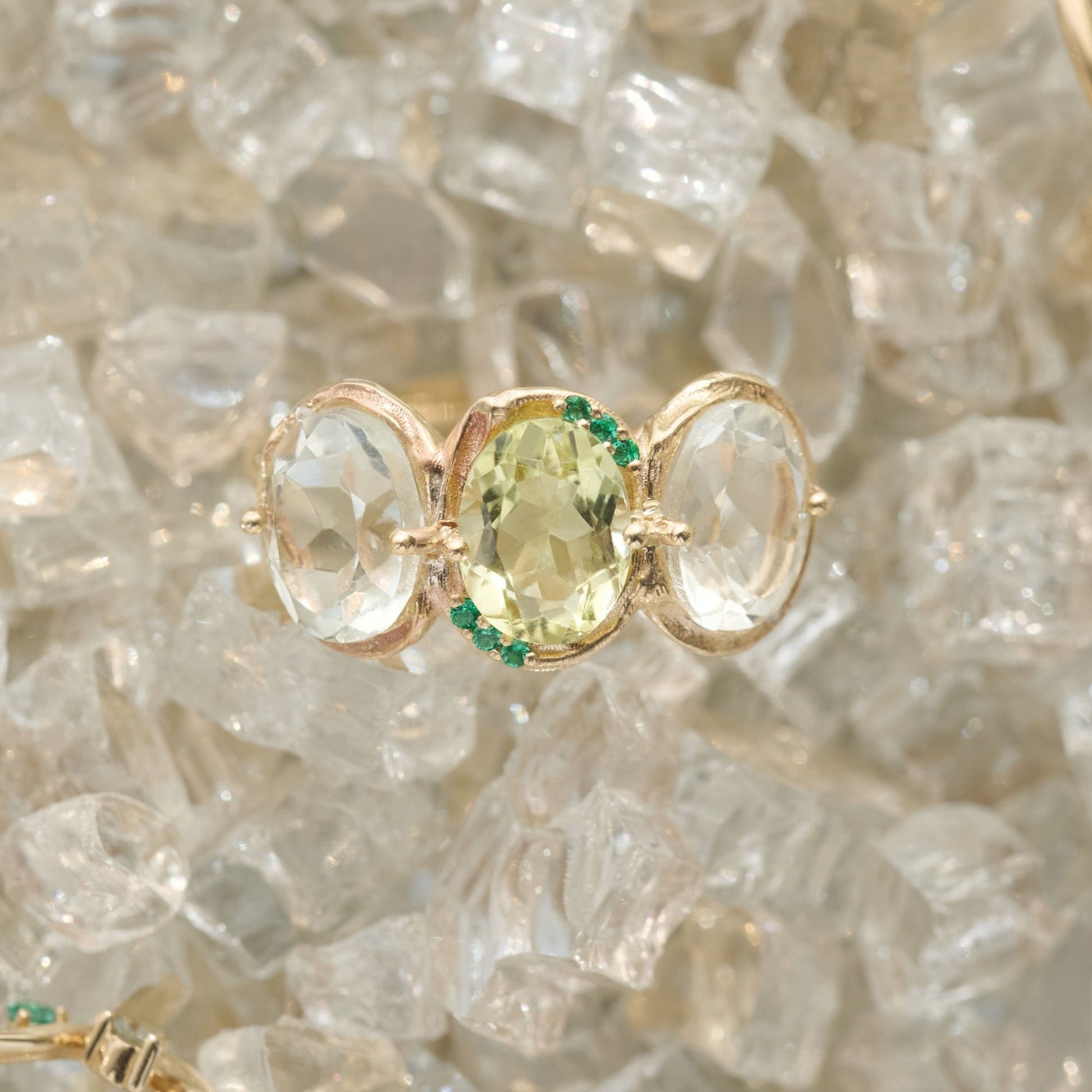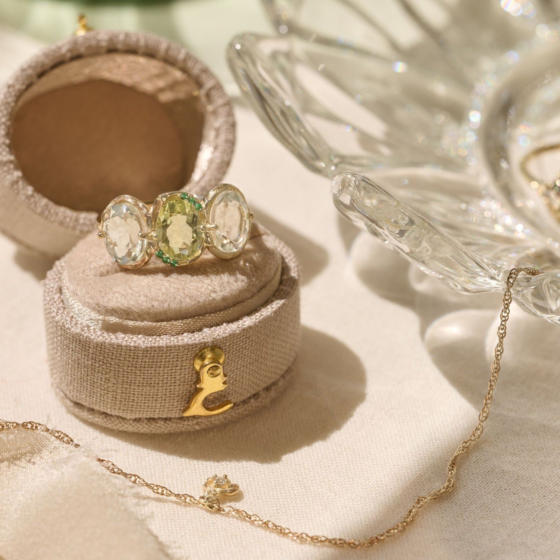 Delicate and serene, the Jasmine Palette ring evokes the quiet elegance of jasmine blossoms unfurling in the soft light of spring. At its center, a deep green chrysoberyl glows with natural richness, framed by two pale green amethysts that echo the gentle unfolding of petals. Encircling the chrysoberyl, six vivid emeralds add depth and dimension, while two diamonds rest beside the amethysts like glints of sunlight between leaves. Set in gold, the composition feels like an artist’s palette, inspired by the timeless beauty of jasmine.
