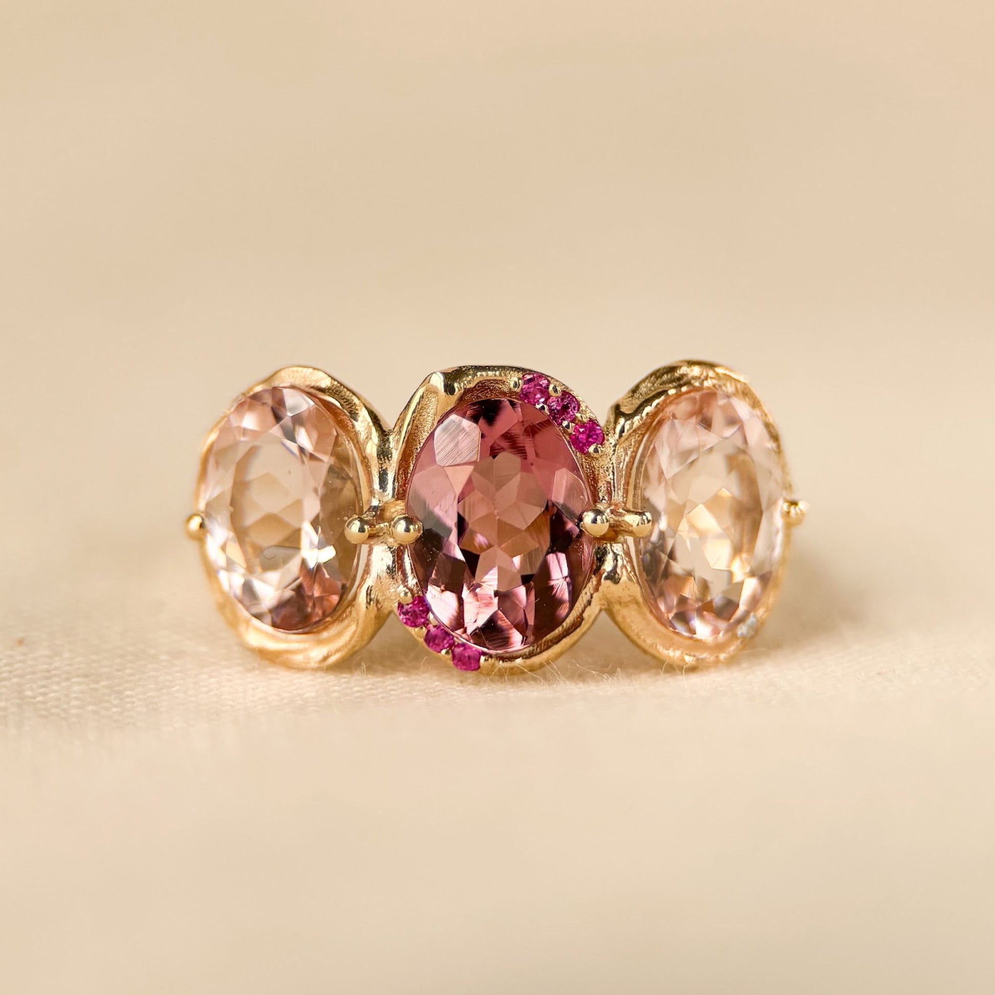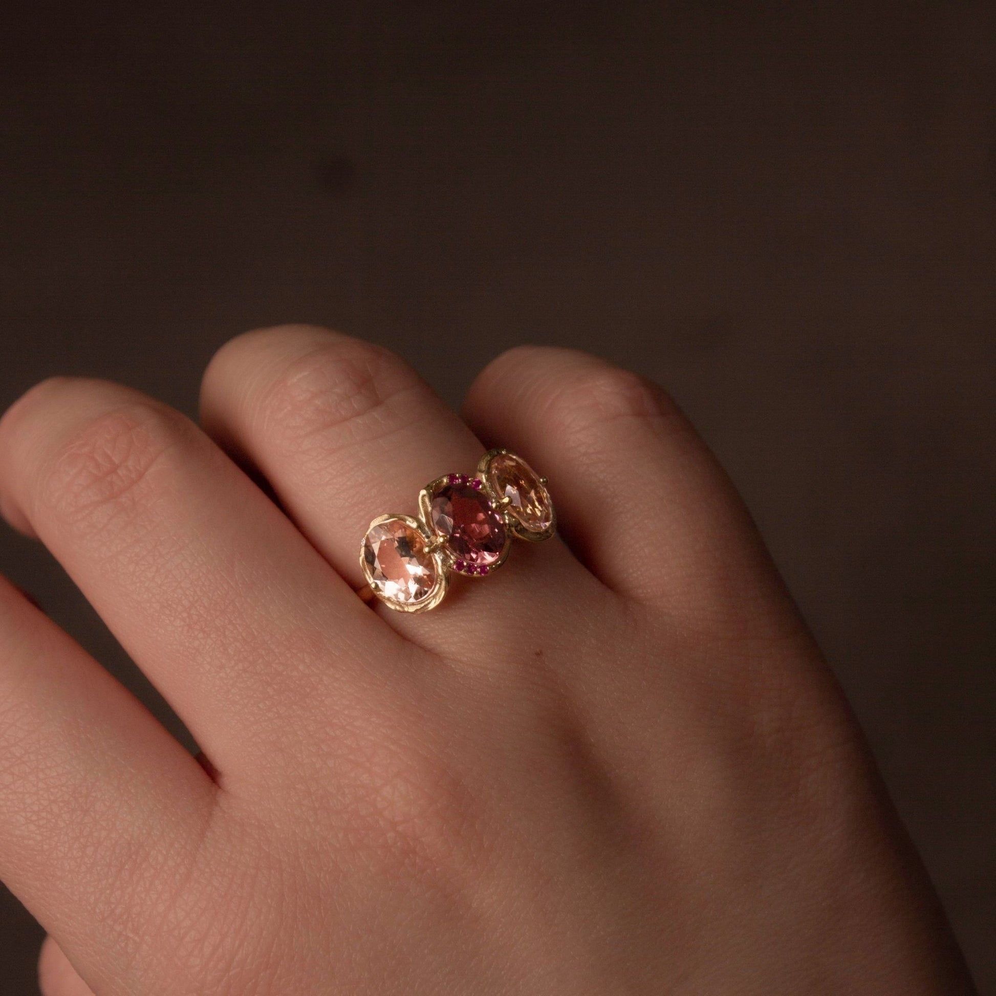 Lush and luminous, the Peony Palette ring captures the layered beauty of a peony in full bloom, each petal unique, yet harmoniously part of a greater whole. At its center glows a rich deep pink tourmaline with two delicate pink morganites on each side. Framing the centerpiece, six vibrant pink sapphires bring richness and dimension, while two diamonds nestled beside the morganites add a subtle sparkle. Set in gold, this ring is a celebration of color, texture, and the romantic complexity found in nature’s most beloved blooms.
