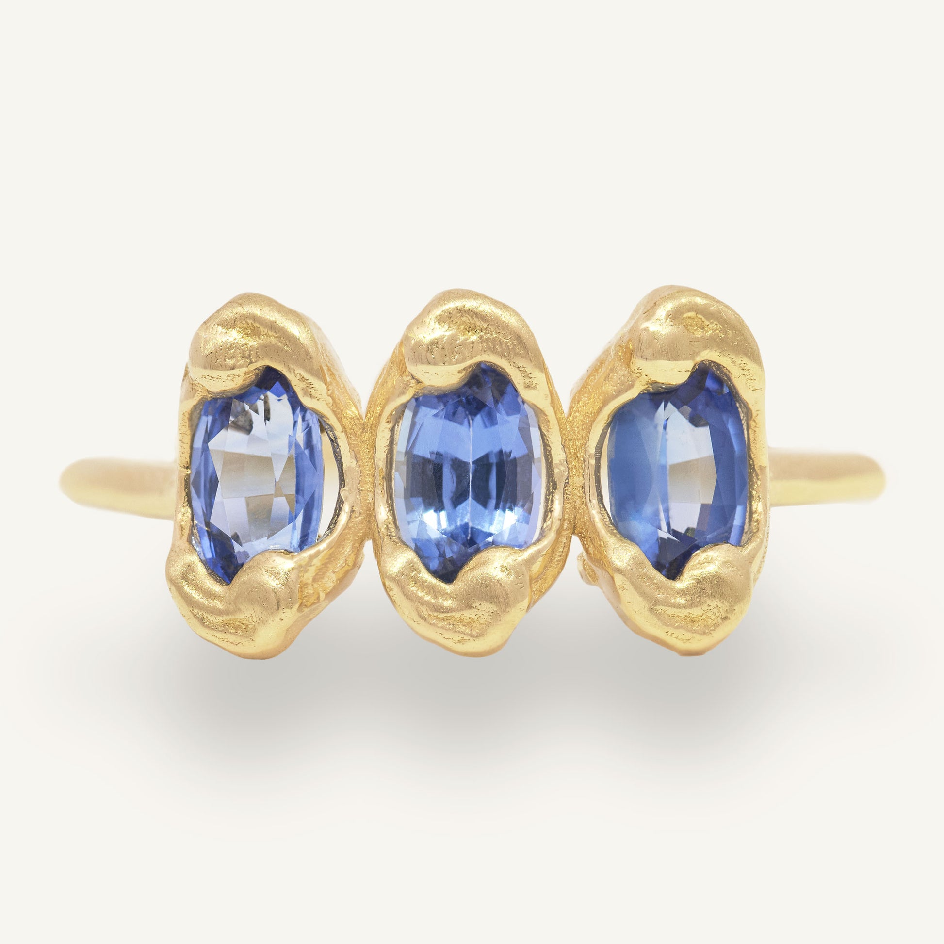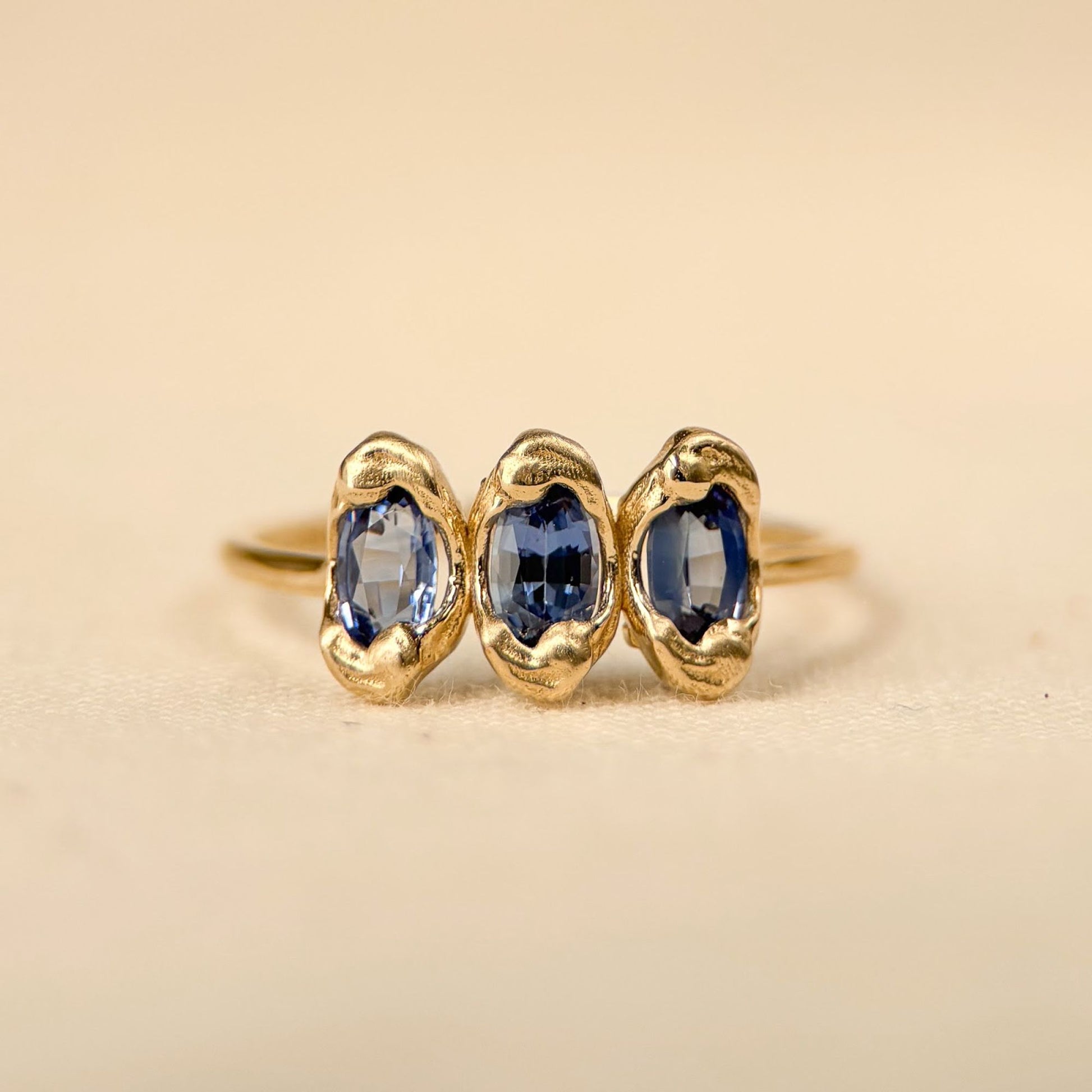 Framed in sculpted gold, three deep blue sapphires radiate the serene calm of dusk. Their cool tones, each a meditation in sapphire, suggest still water, open skies, and breath between moments. The trio holds a quiet grace, composed and eternal.