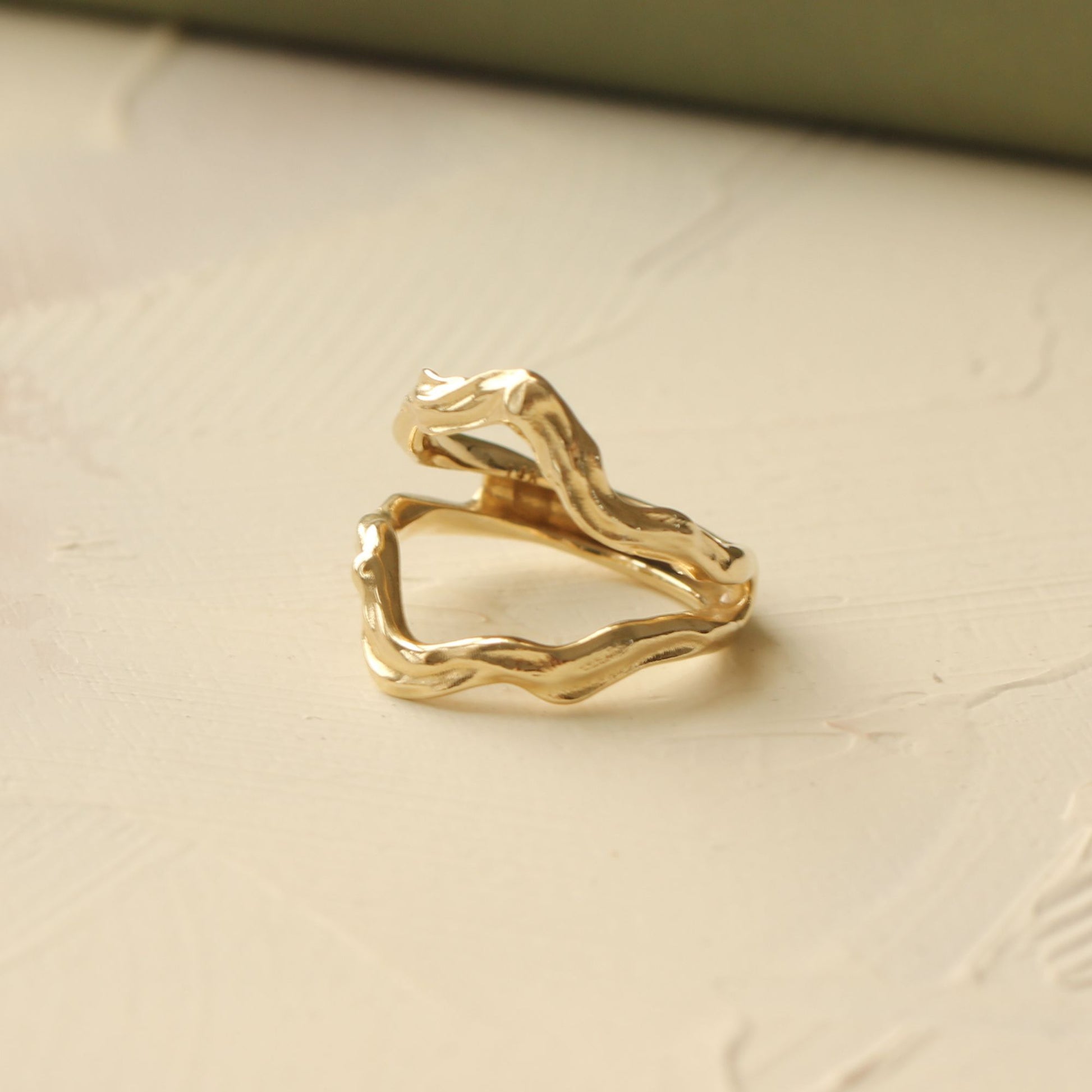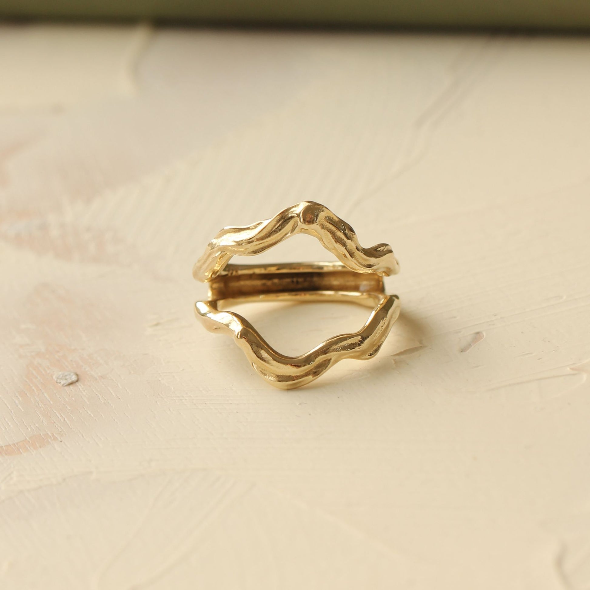 The Pado band captures the soft rise and fall of a wave, sculpted in flowing brushstroke curves of gold. Designed with a slide-in structure, it allows the Maya Blue ring to glide into place, completing the form as one unified piece. Stone-free and organic, Pado moves like water-quietly shaping the silhouette of a single, fluid ring.