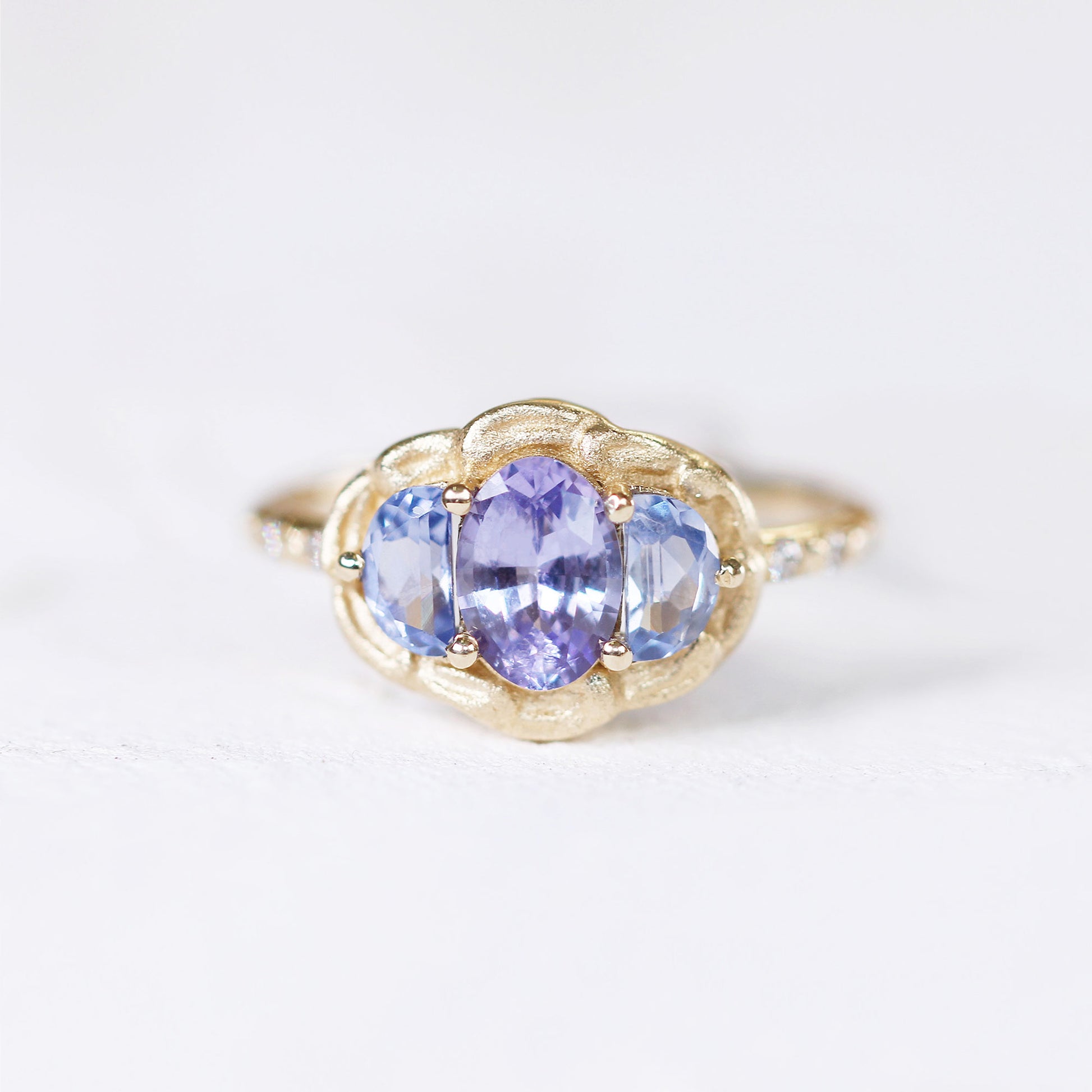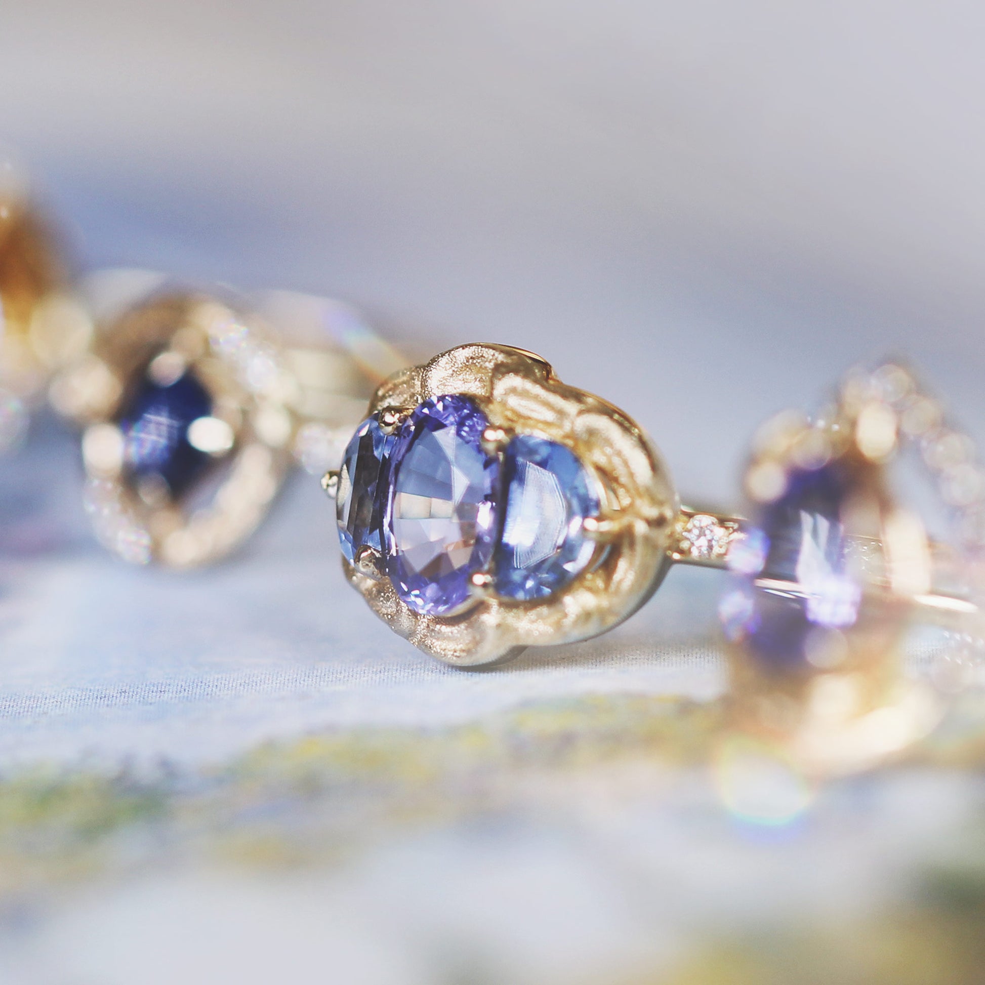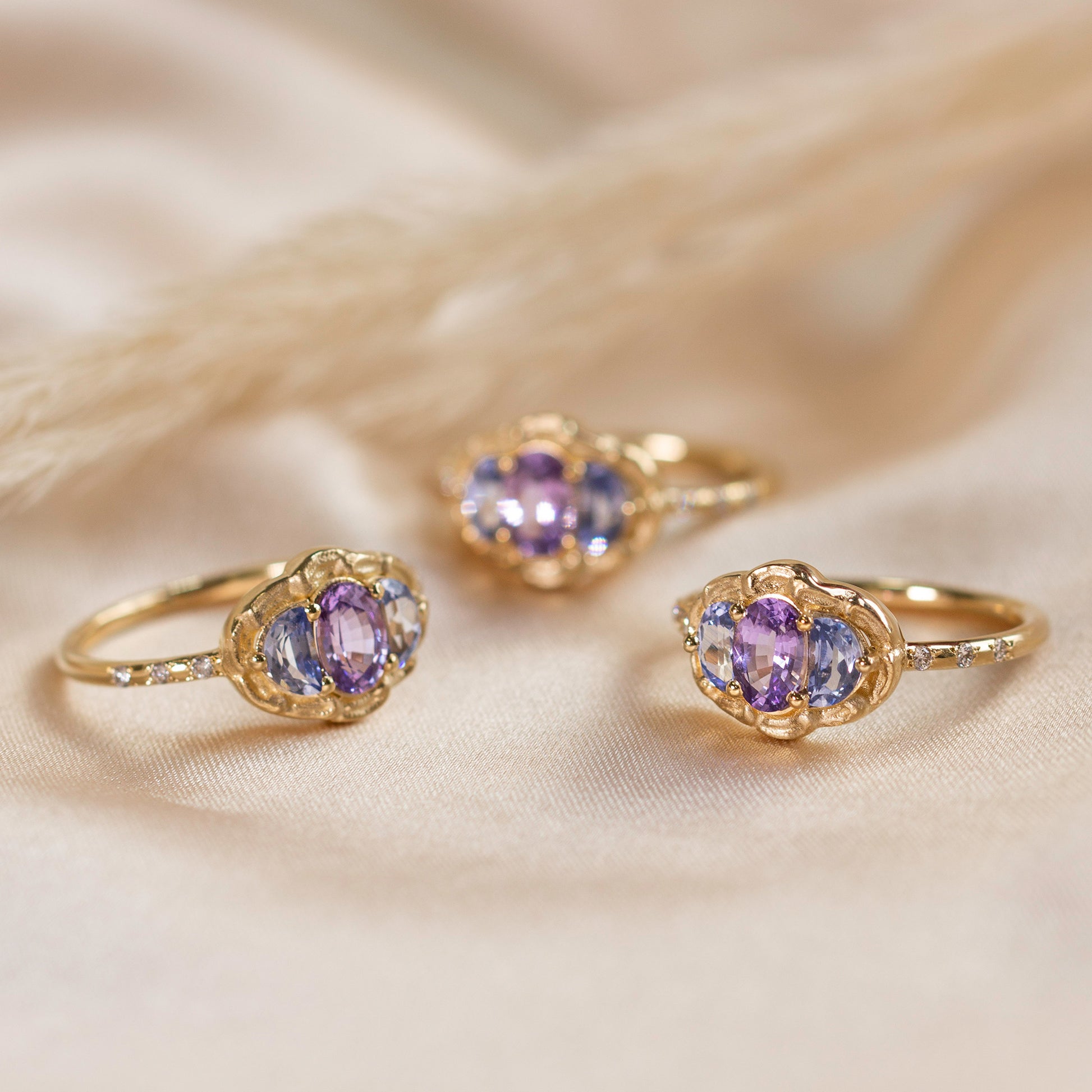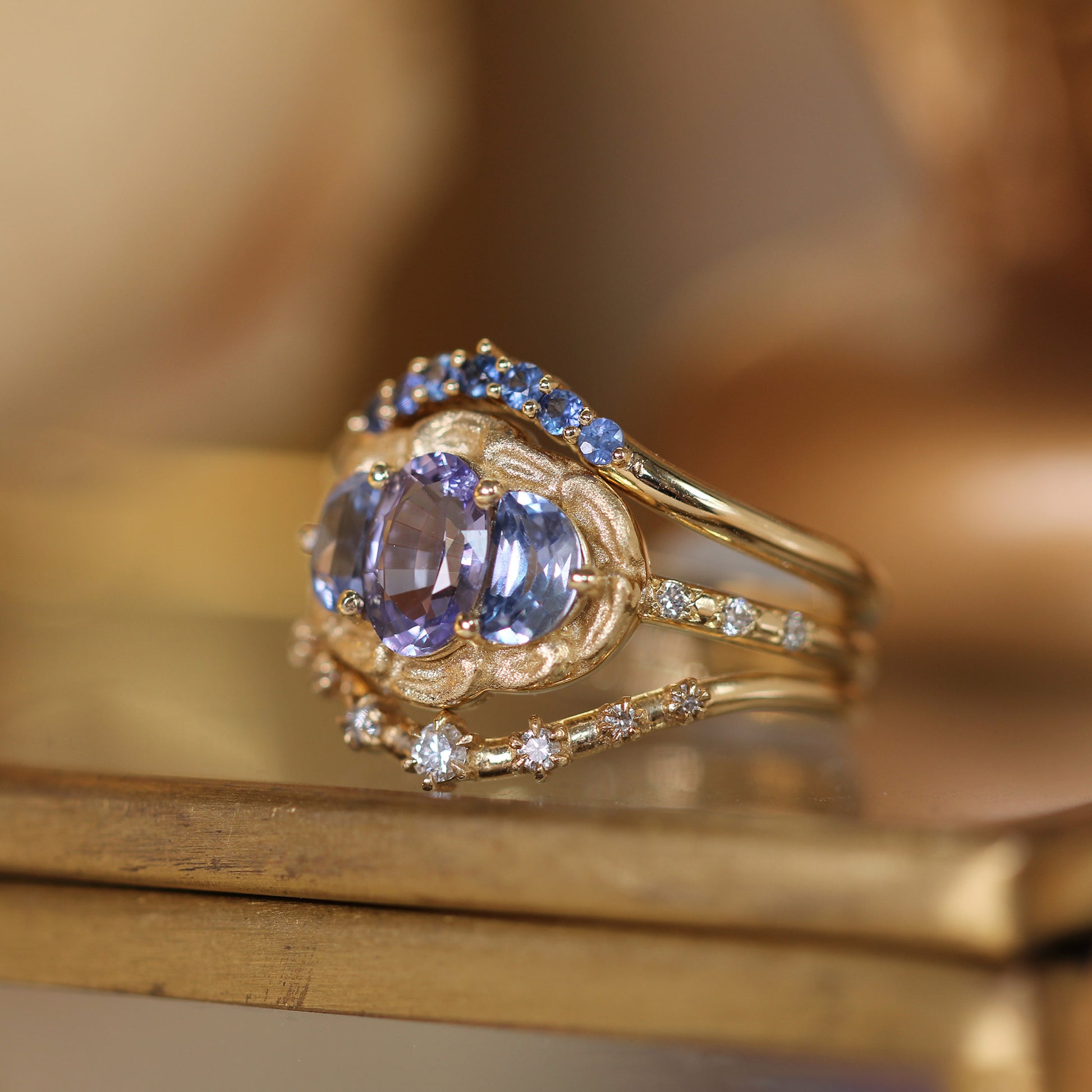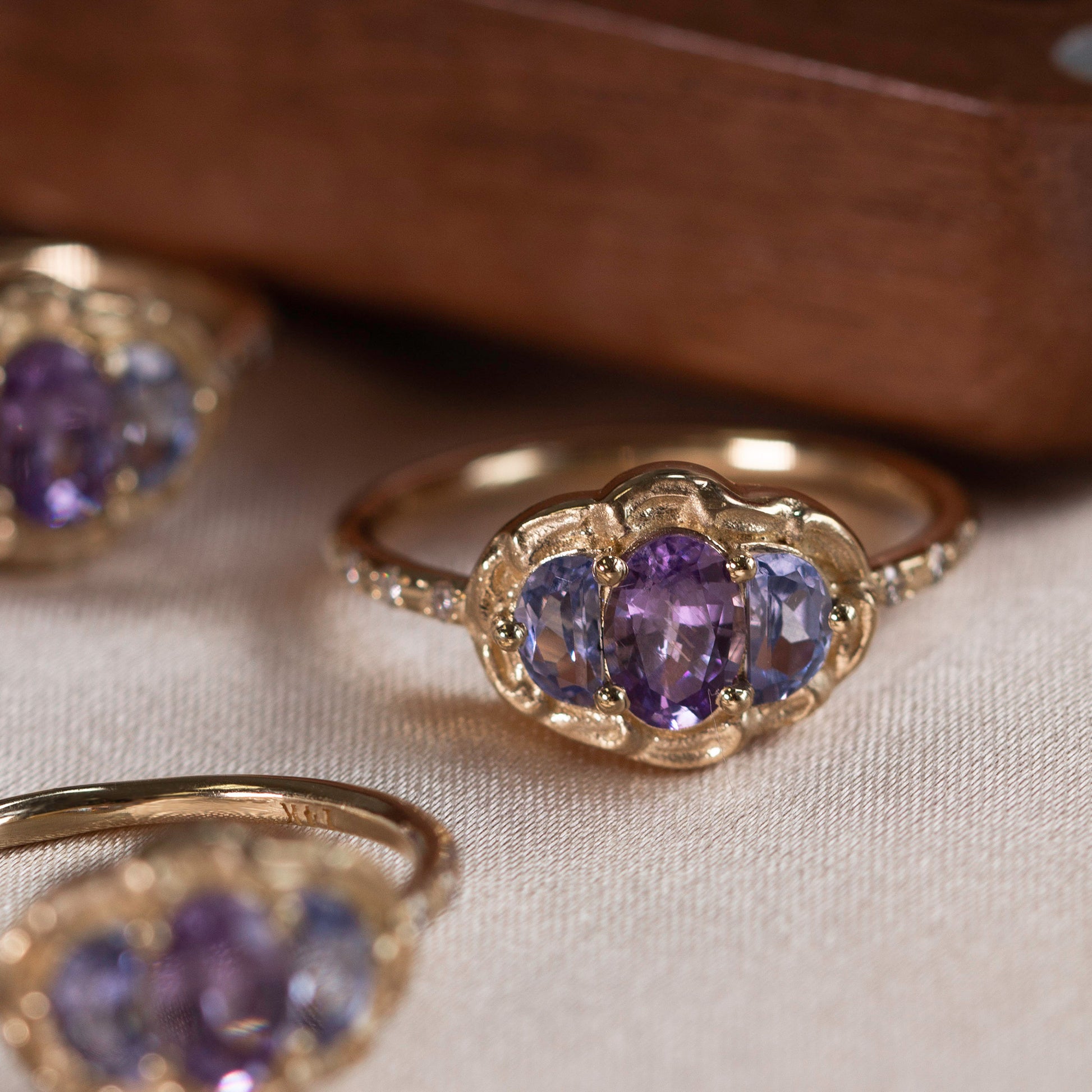 Inspired by the tender blooms of periwinkle flowers awakening in spring, the Periwinkle Ring is a palette of ripe plum-purple sapphire and two French-blue half-moon sapphires, nestled in short, whipped brushstroke textures. Along each shoulder, three star-set white diamonds add a delicate sparkle, creating a piece as enchanting as the season it reflects.