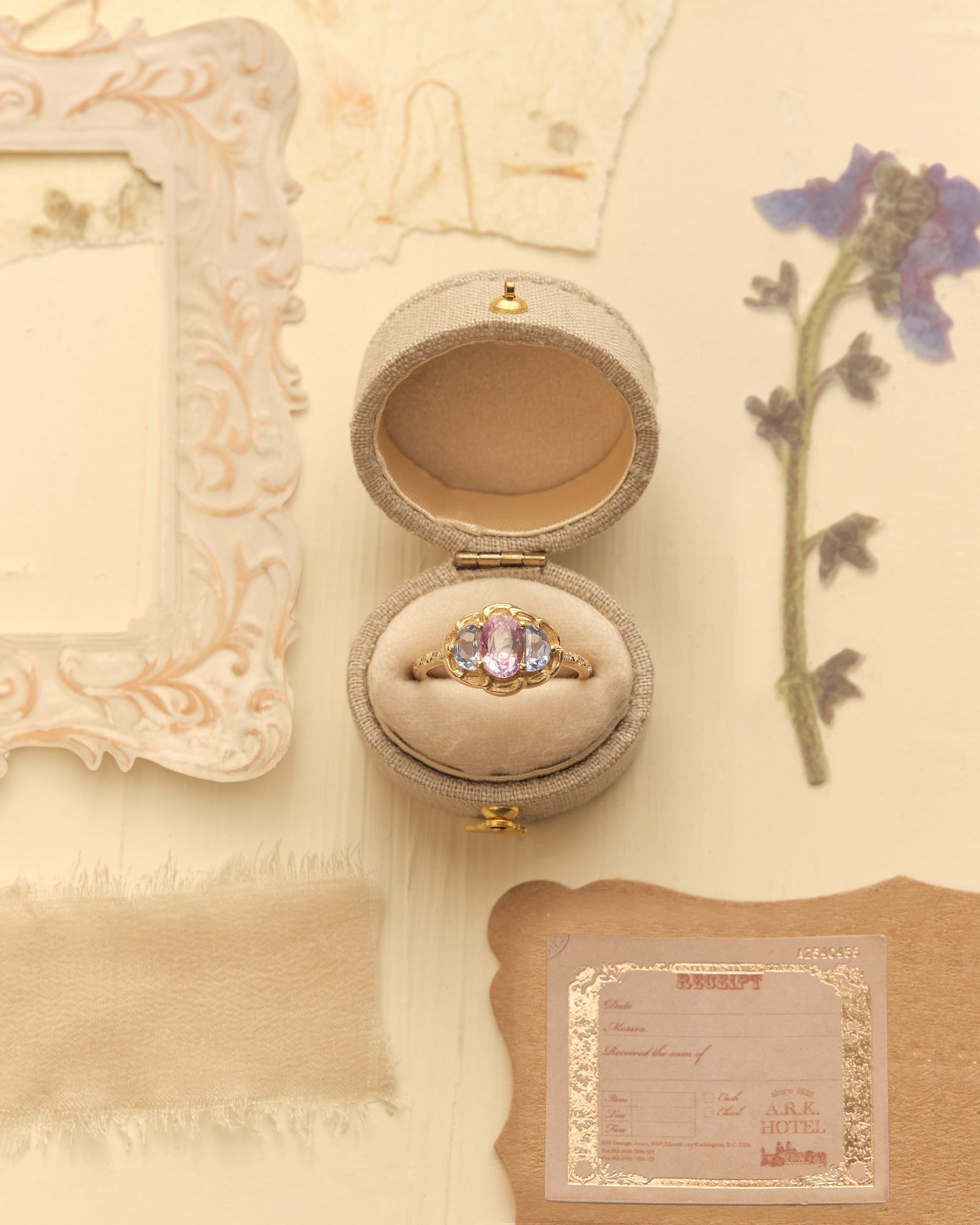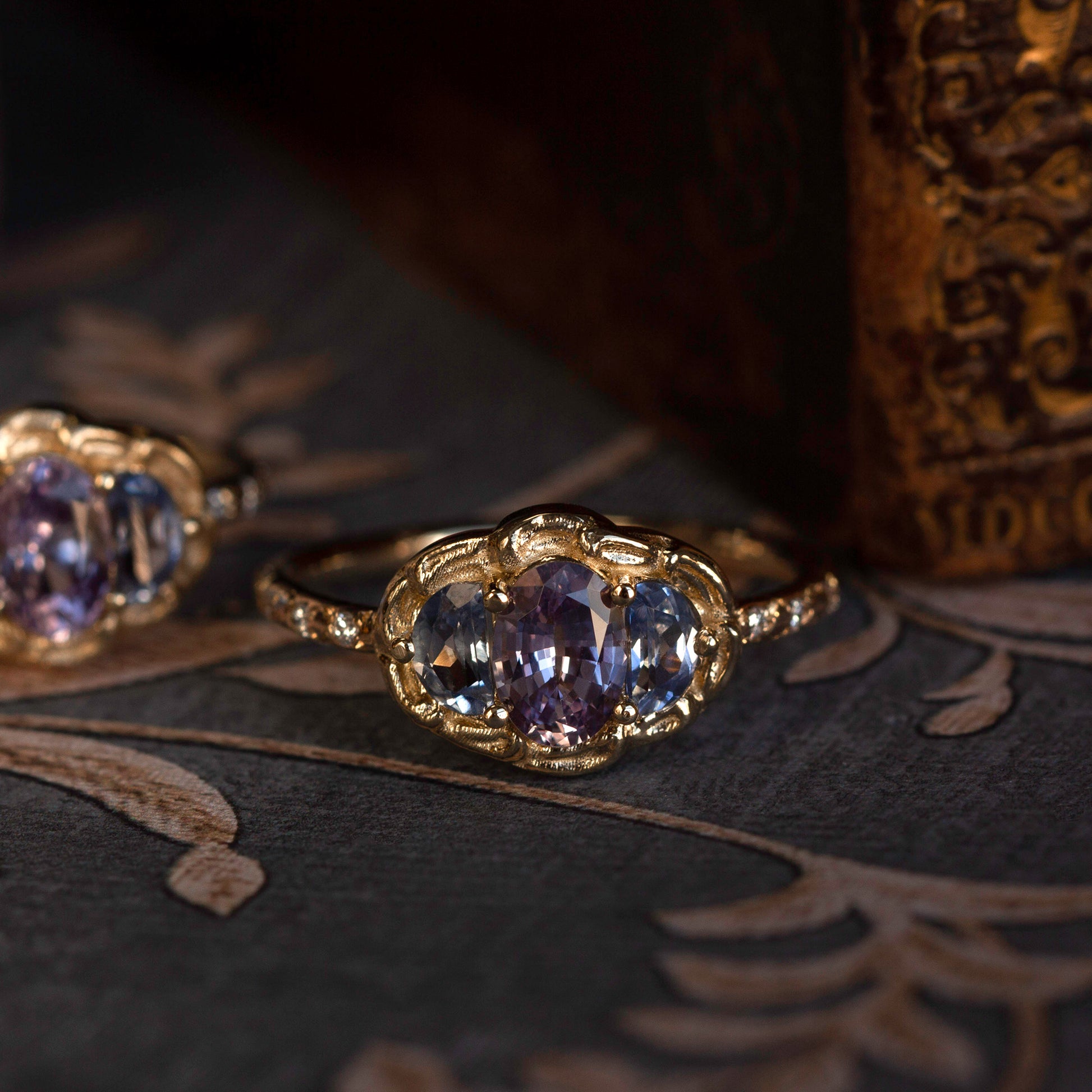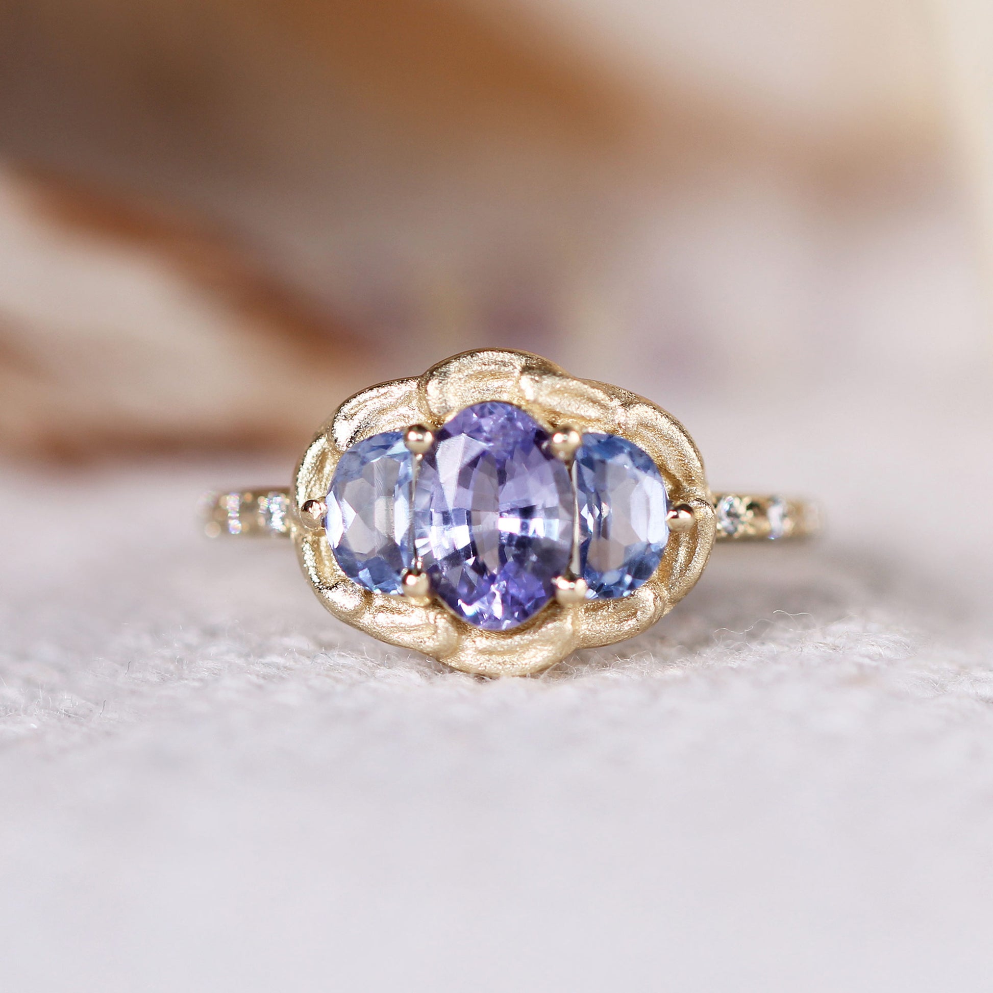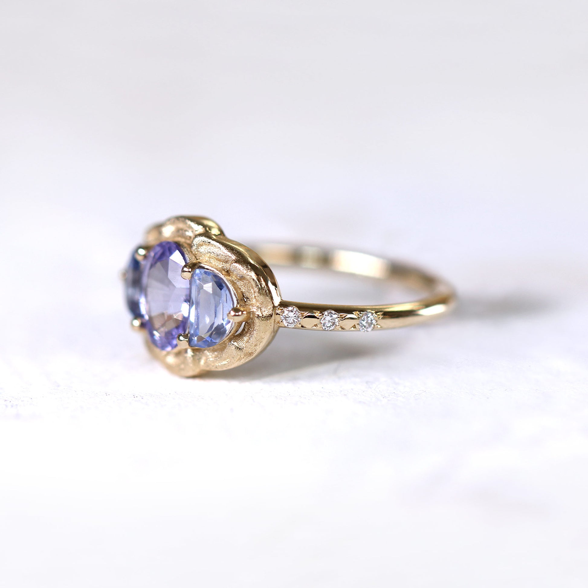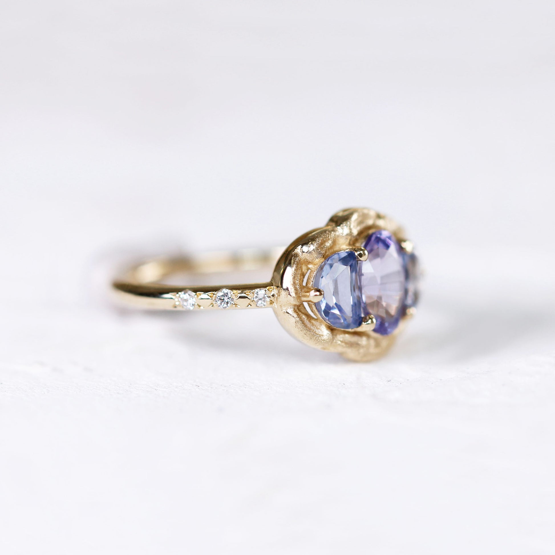 Inspired by the tender blooms of periwinkle flowers awakening in spring, the Periwinkle Ring is a palette of ripe plum-purple sapphire and two French-blue half-moon sapphires, nestled in short, whipped brushstroke textures. Along each shoulder, three star-set white diamonds add a delicate sparkle, creating a piece as enchanting as the season it reflects.