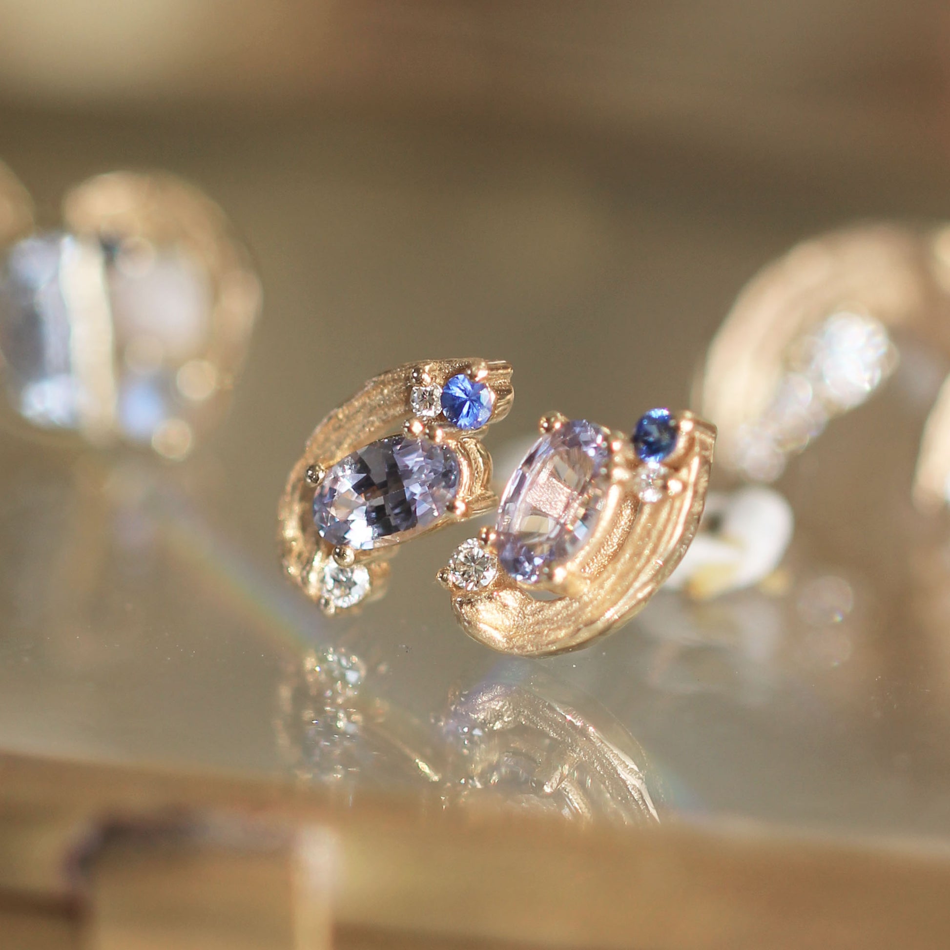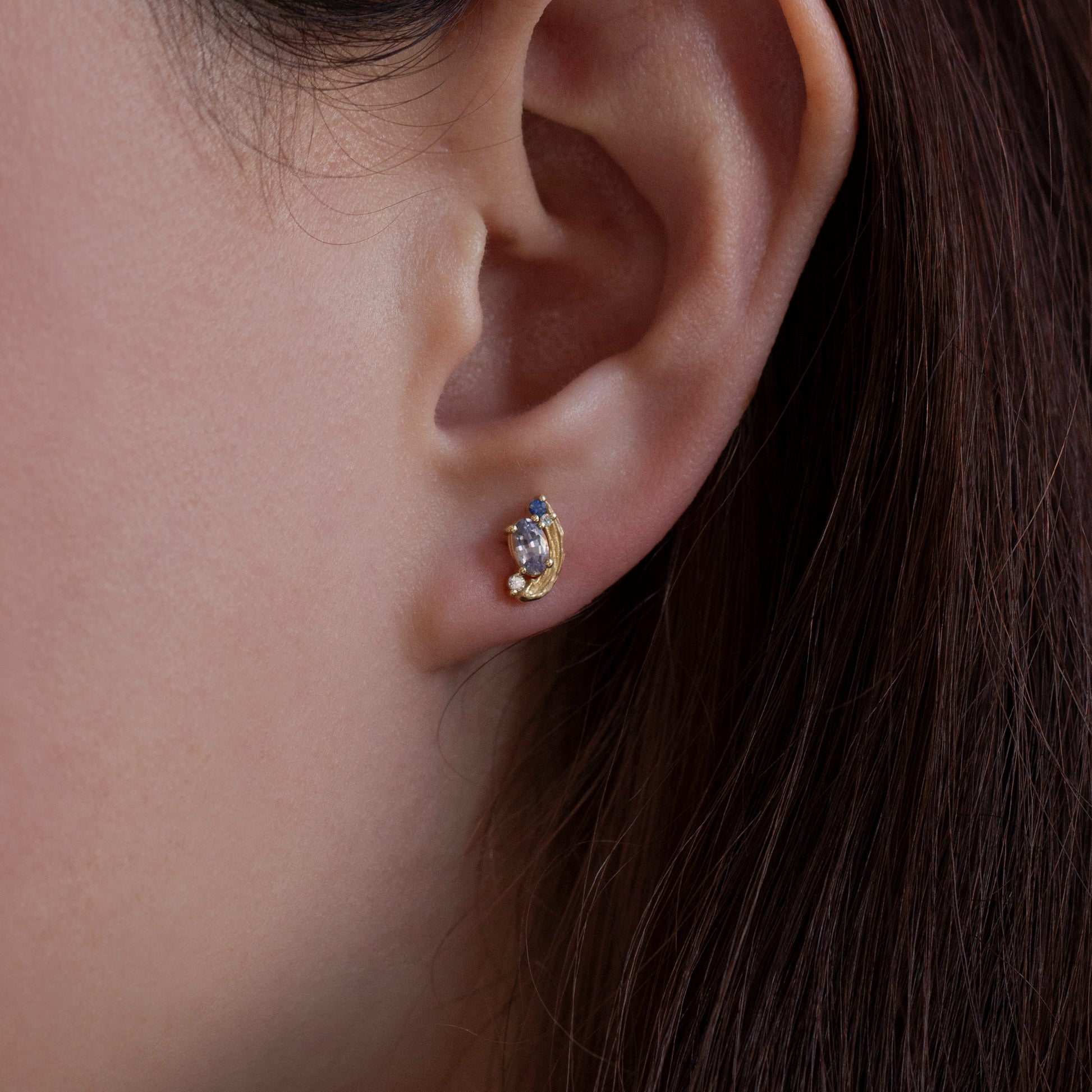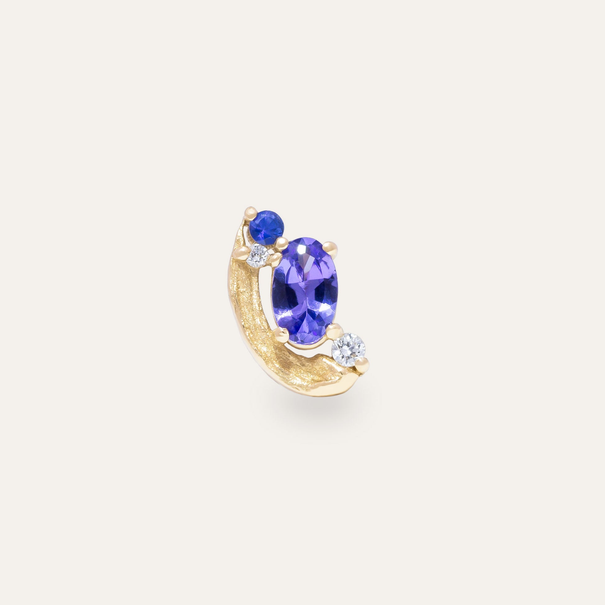 A tribute to the first blossoms of spring, the Periwinkle Earring features a luscious purple tanzanite, two radiant diamonds, and a vivid cobalt-blue sapphire. Connected by creamy golden brushstrokes, this piece captures the soft, enchanting hues of periwinkle flowers, emanating the sweet bloom in early spring.