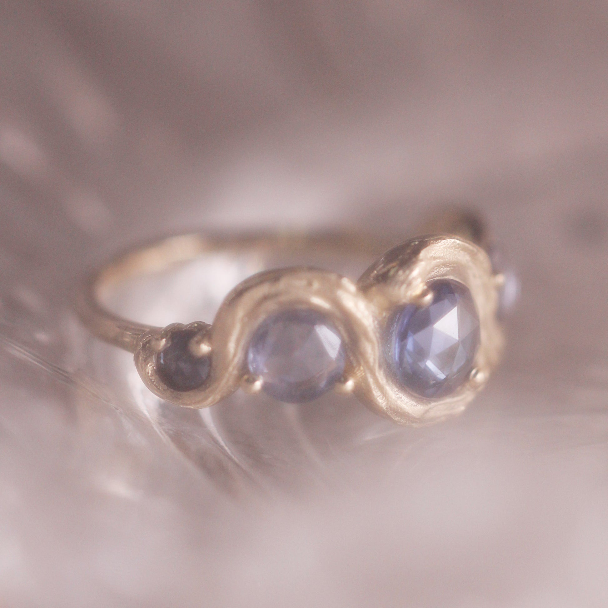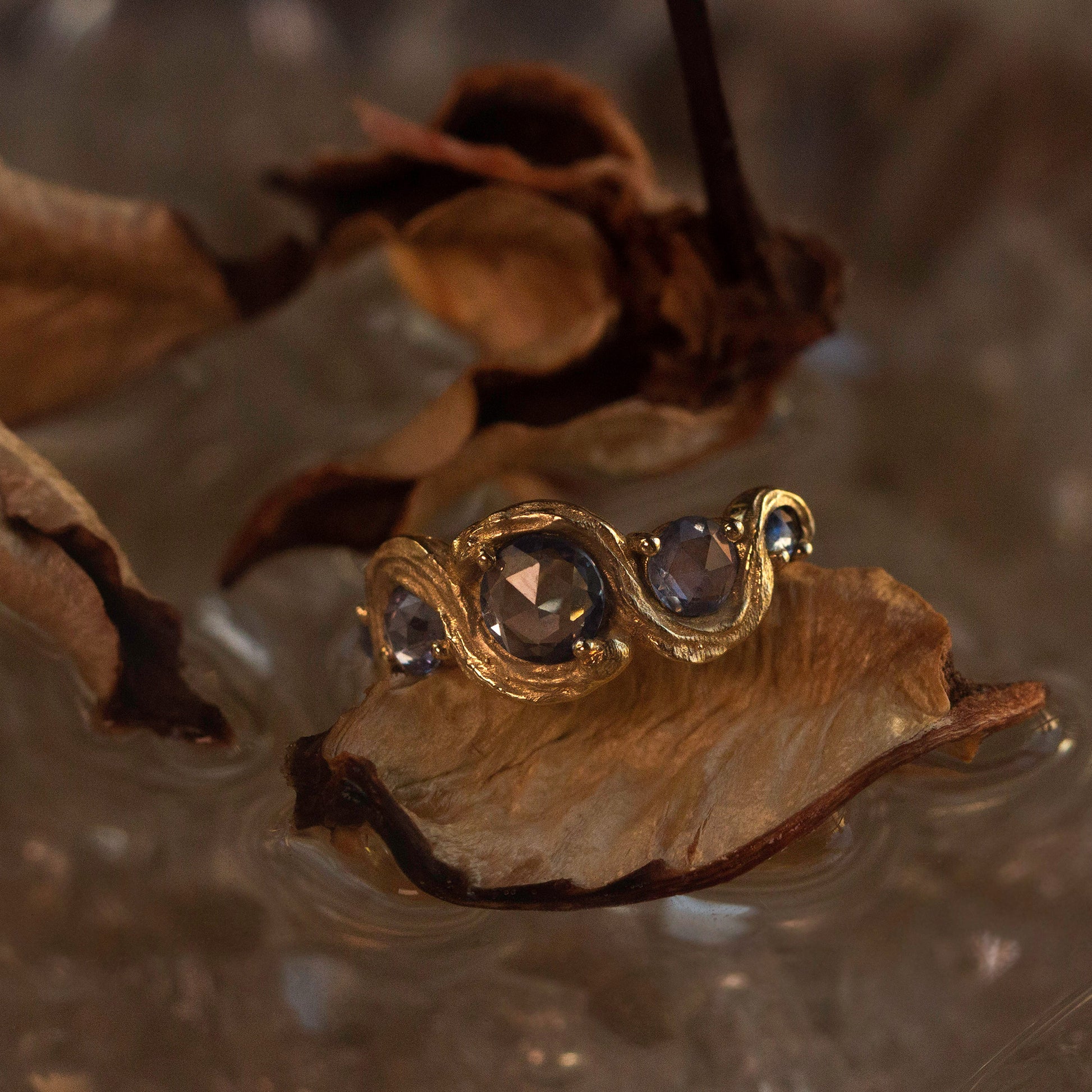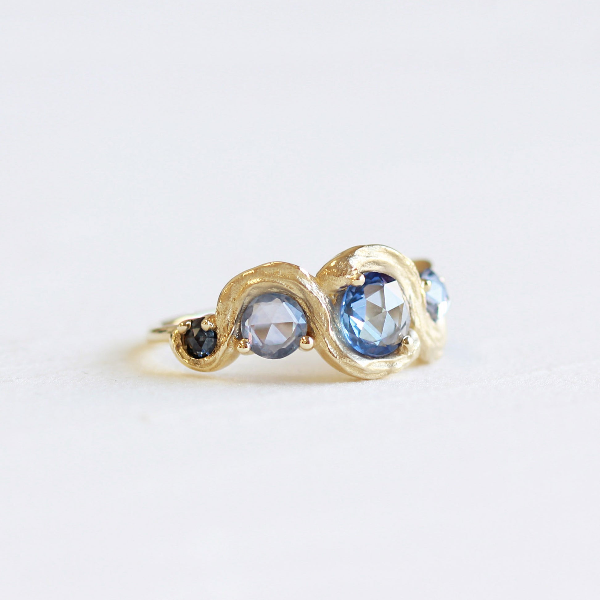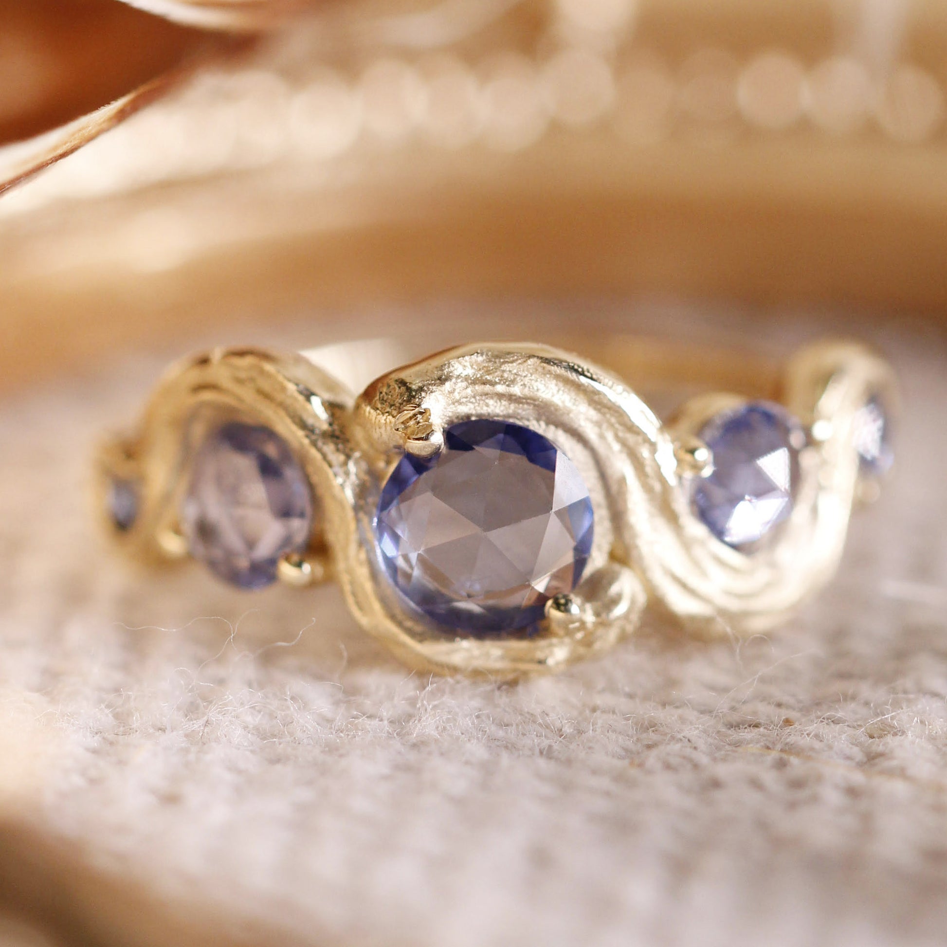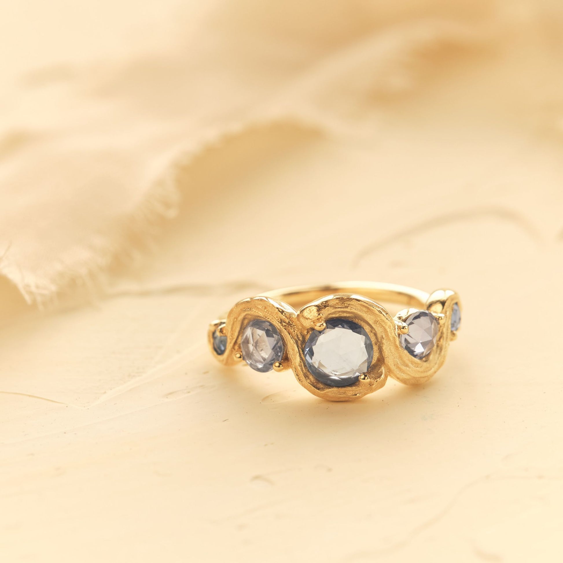 Channeling the swirling beauty of Van Gogh’s Starry Night (1889), the Phthalo Blue features five classic-blue sapphires that spiral together in a dance of color and light. Ripple-like gold brushstrokes encircle the sapphires, creating a rich, dynamic composition – a striking homage to artistry and imagination.