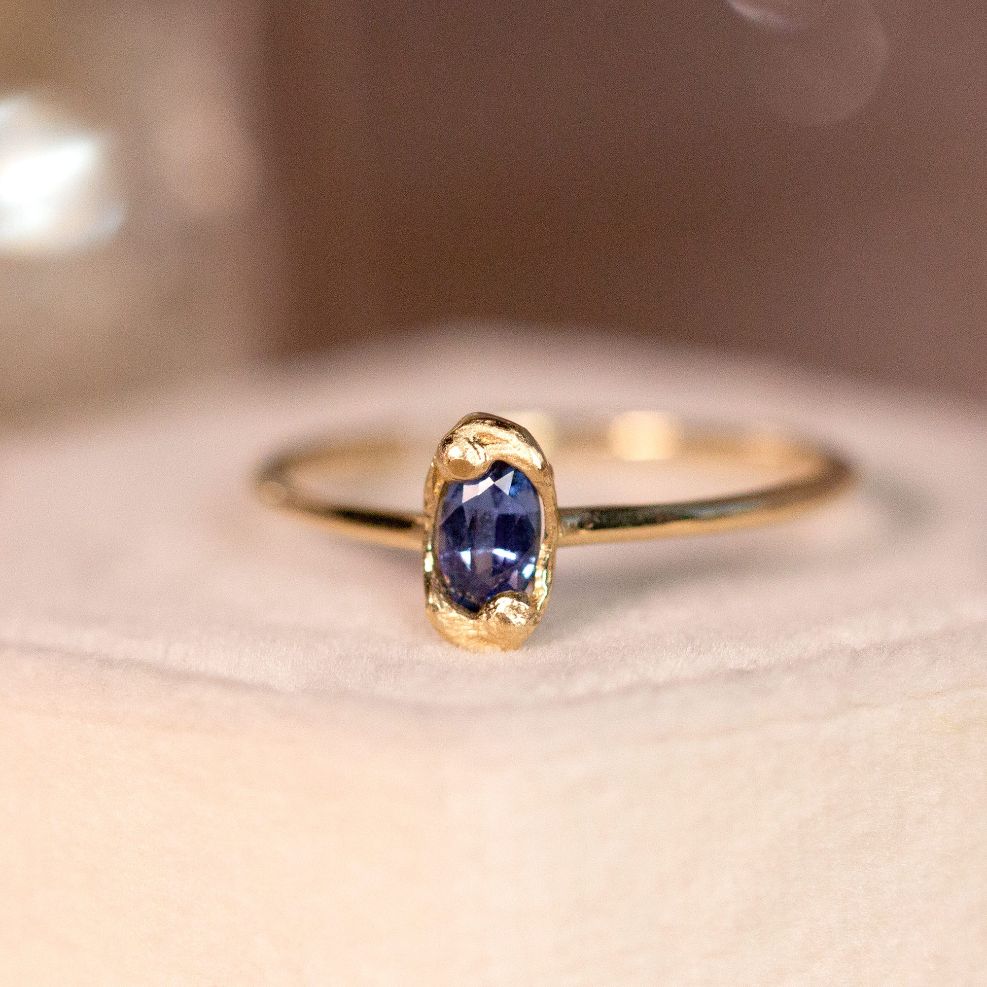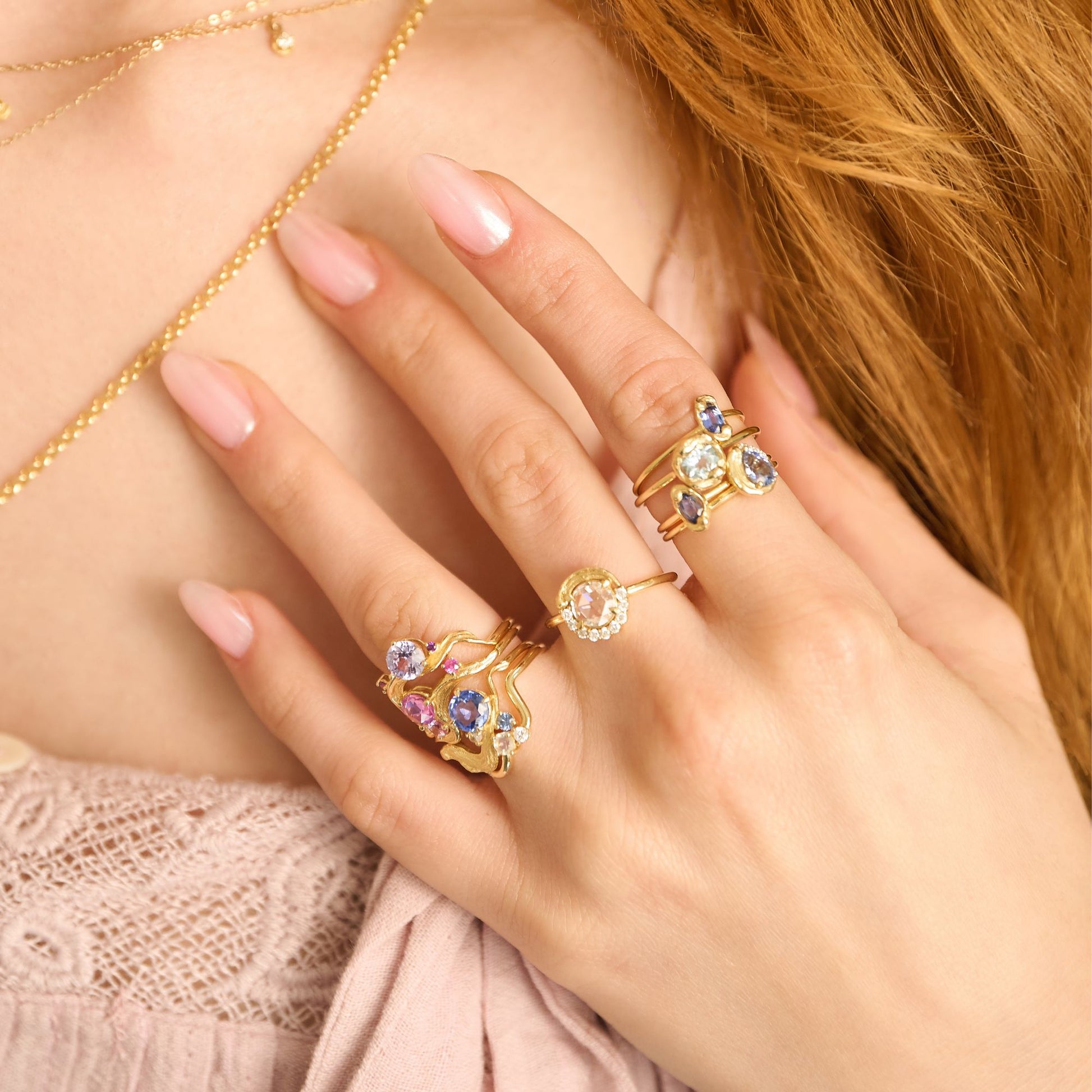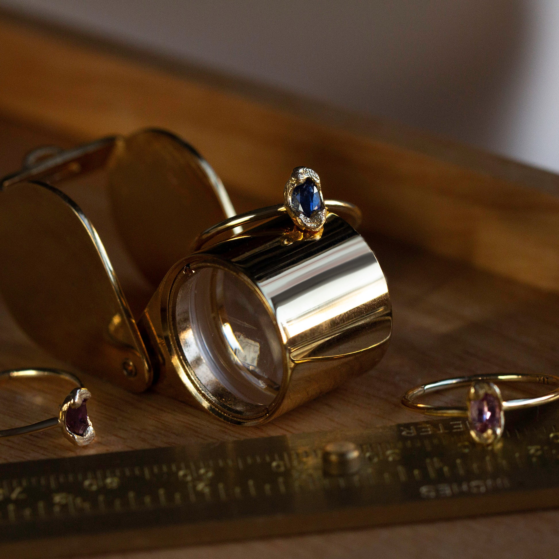 The Pigment Ring in blue sapphire is a fresh drop of vivid resolution-blue and a couple of dabs of creamy gold brushstroke textures, swept right off a painter’s palette. With its perfect bead of pigment that glistens in the light, this piece serves as a symbol of the limitless inspiration and wonder found in every artistic journey.