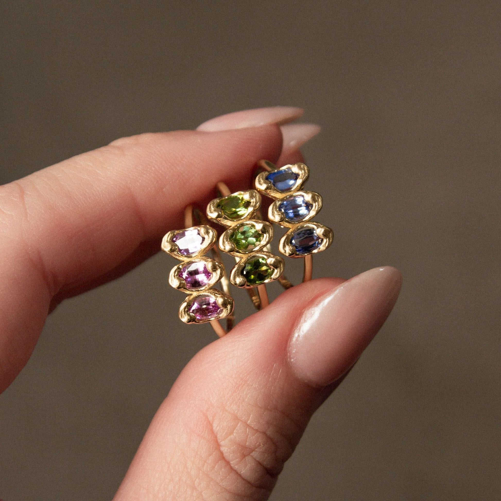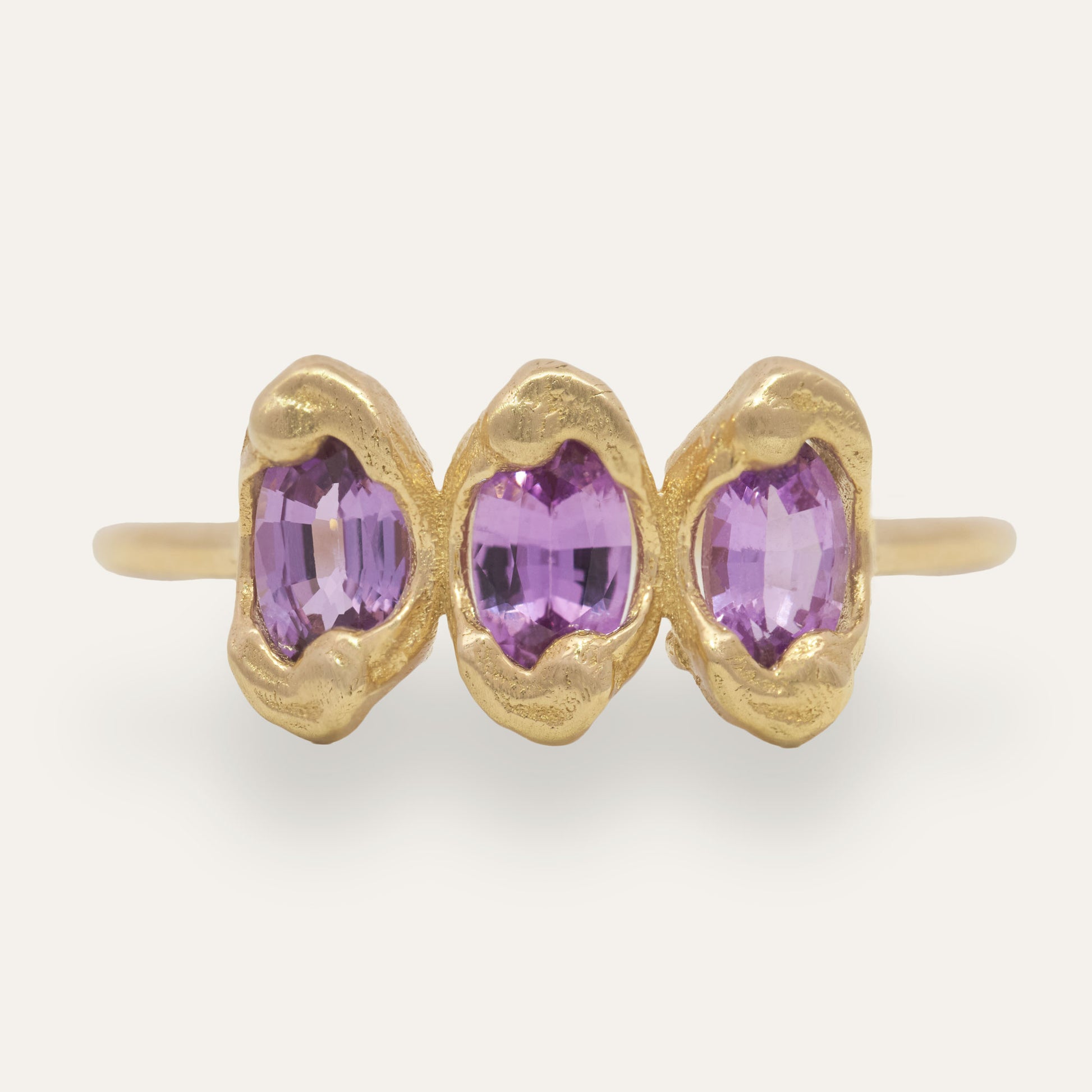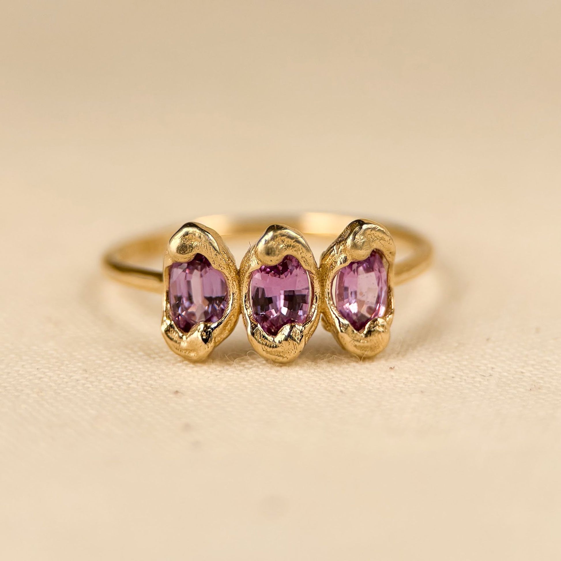Bathed in warm golden light, three oval pink sapphires bloom with the tenderness of morning. Their soft hues whisper of petal blush and early sun, each one offering a moment of warmth and gentle promise. The ring is a quiet celebration of softness and joy.