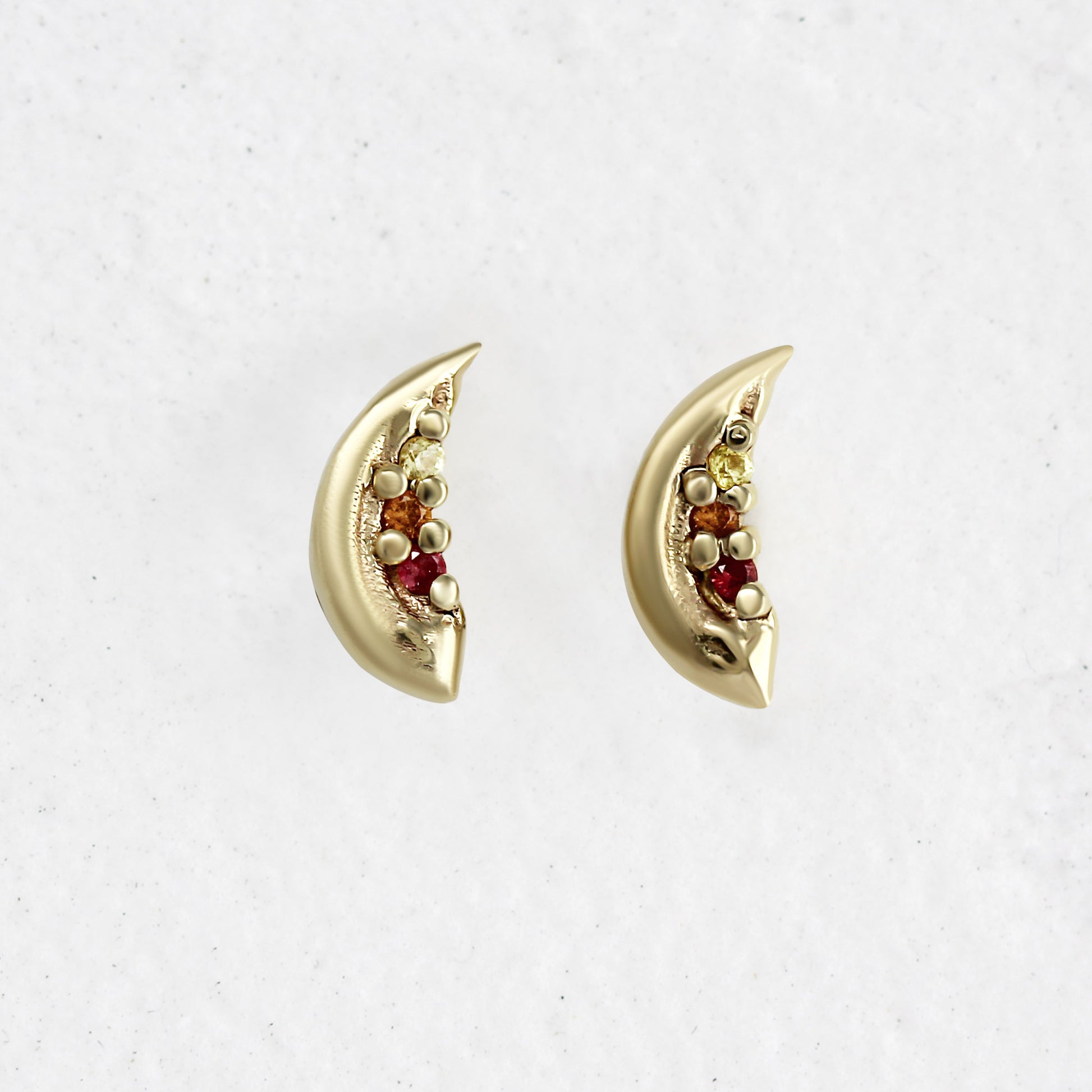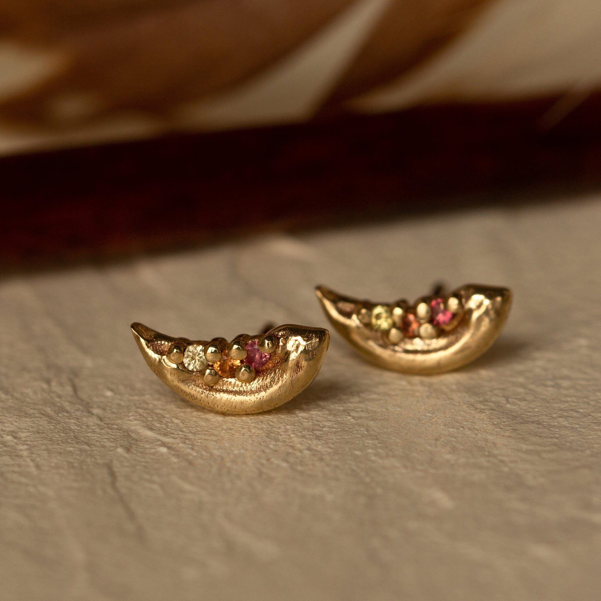 A vivid reimagining of Monet’s sunlit poppy fields, the Poppy Field Earring is a medley of warm red, orange, and yellow sapphires nestled atop a golden, painterly brushstroke. This cheerful design celebrates nature’s brilliance, making it a joyful statement for every season.