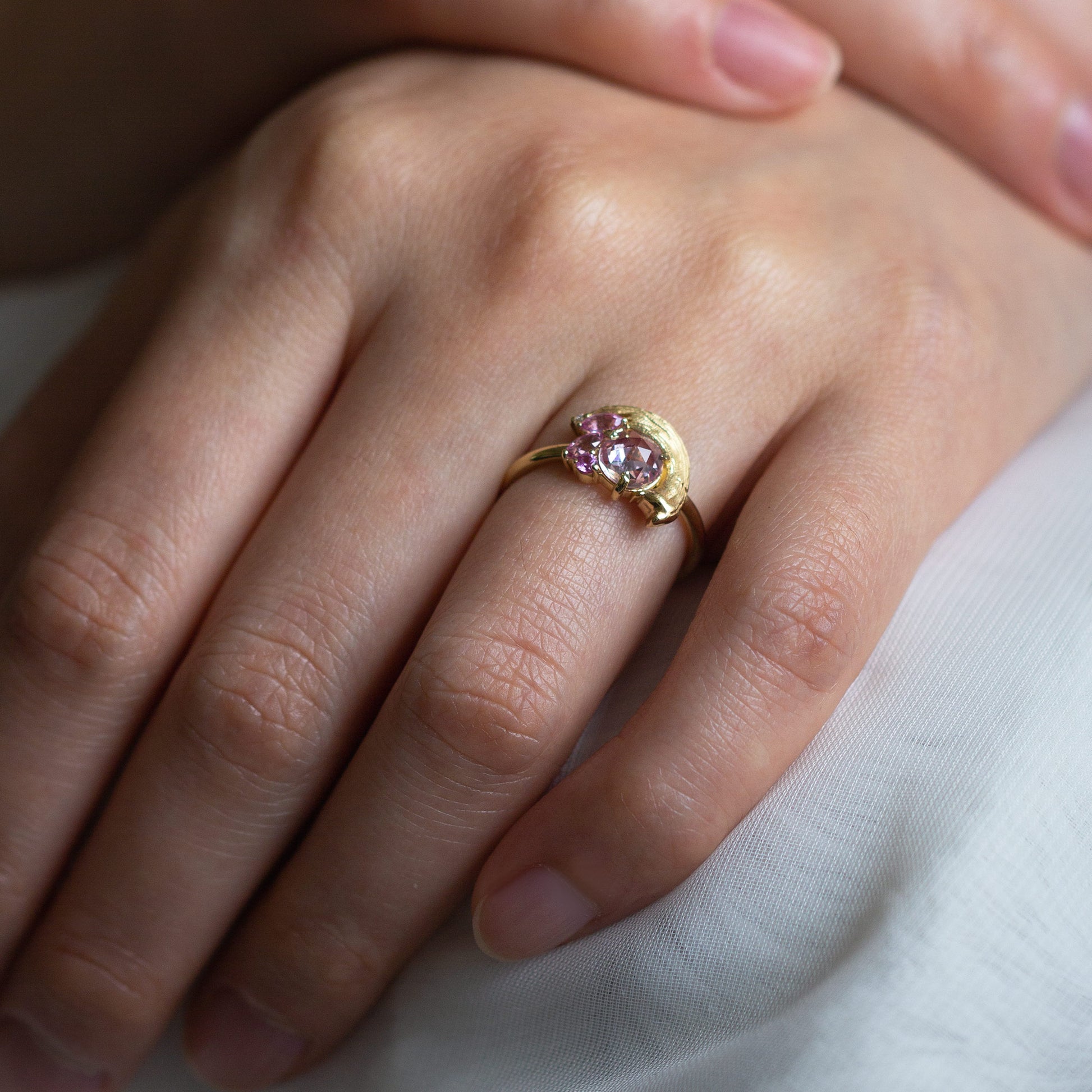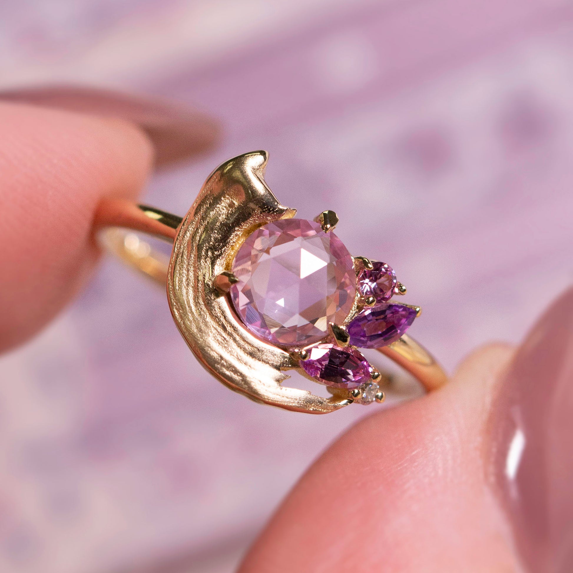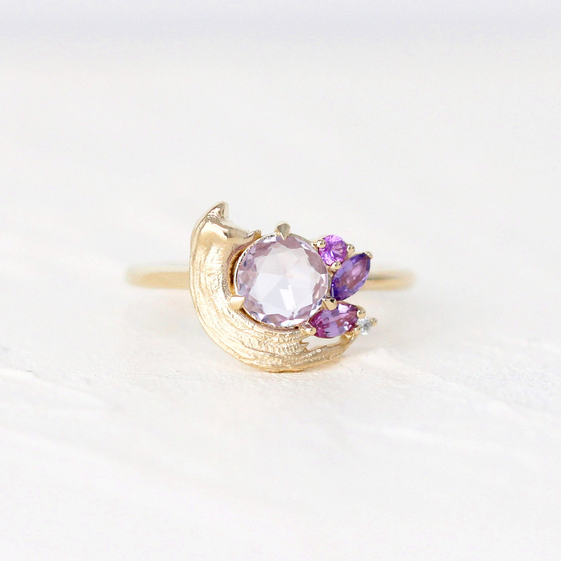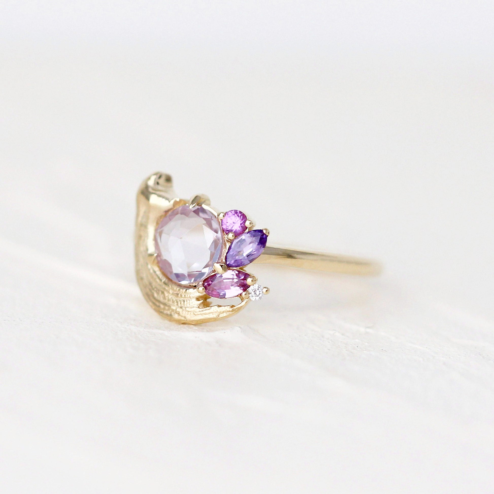 A tender tribute to the beauty of golden moments, the Potter’s Pink Ring centers a pale, rosy sapphire atop a satiny brushstroke. Sweet pink and purple sapphires, accented with sparkling white diamonds, form a dreamy palette that reflects the delicate textures of Le Conte’s Impasto Collection.