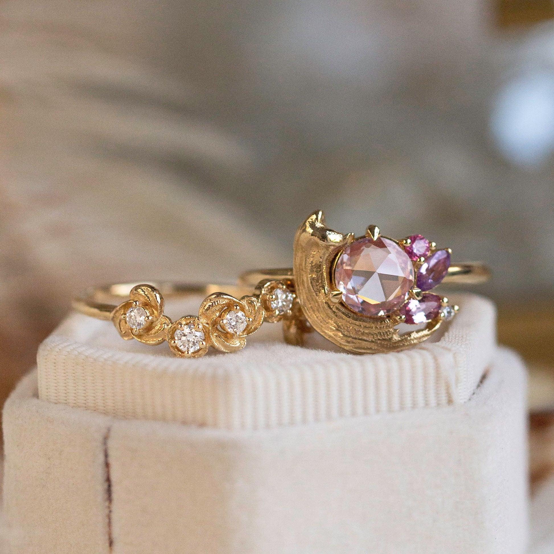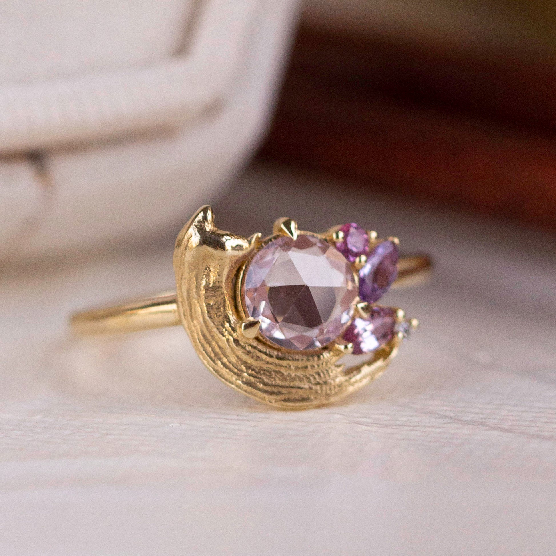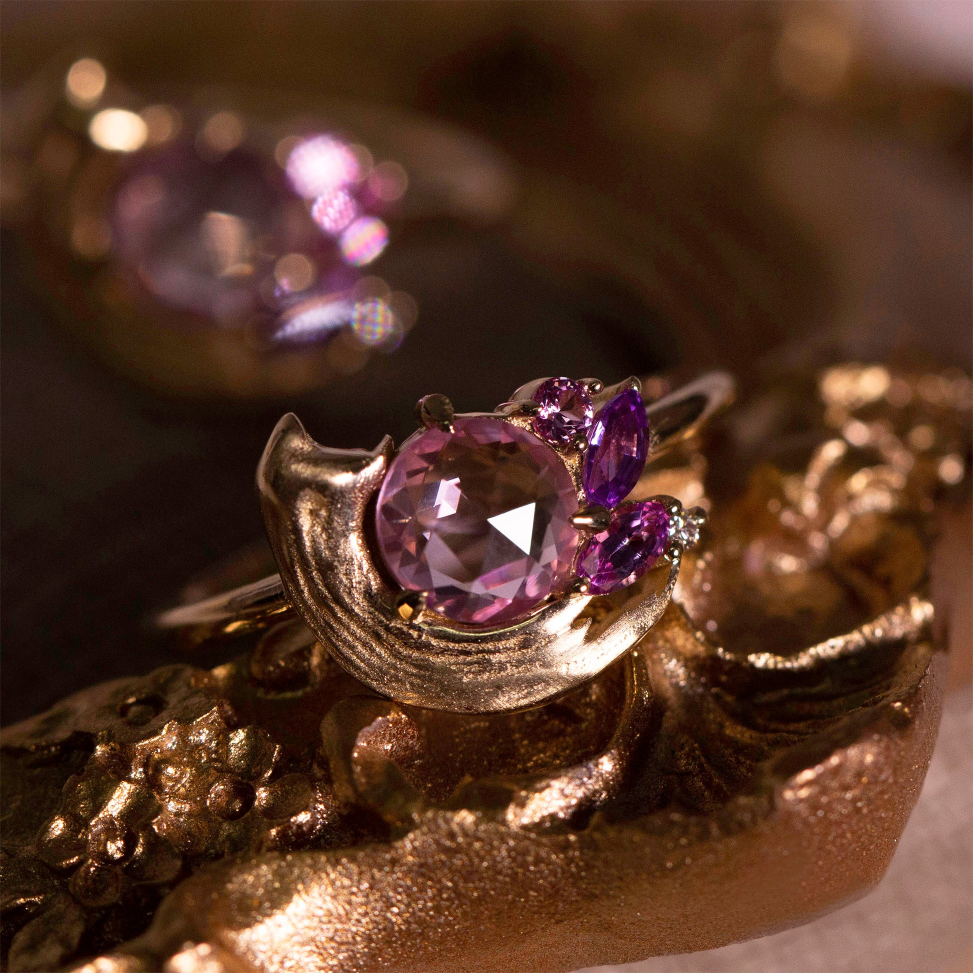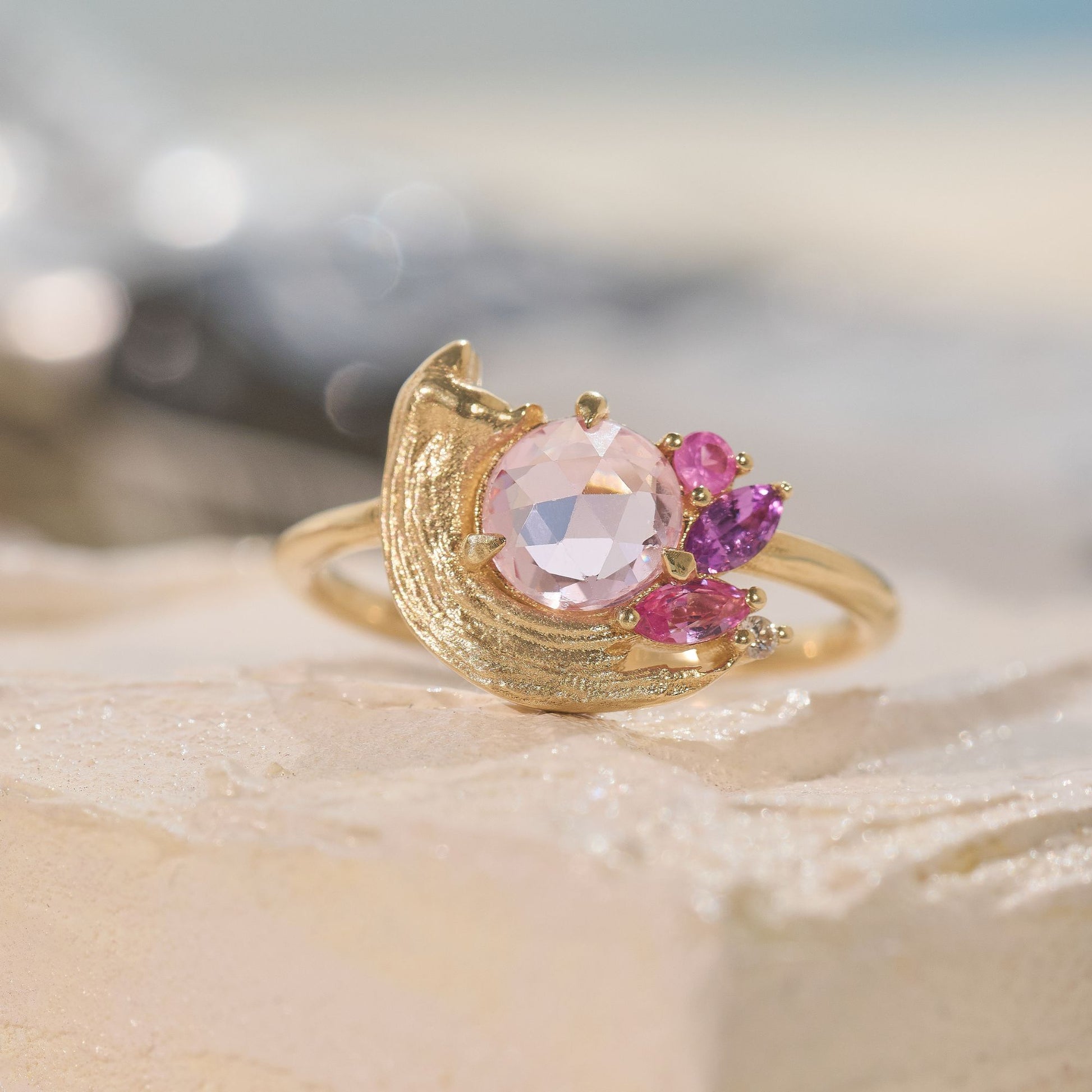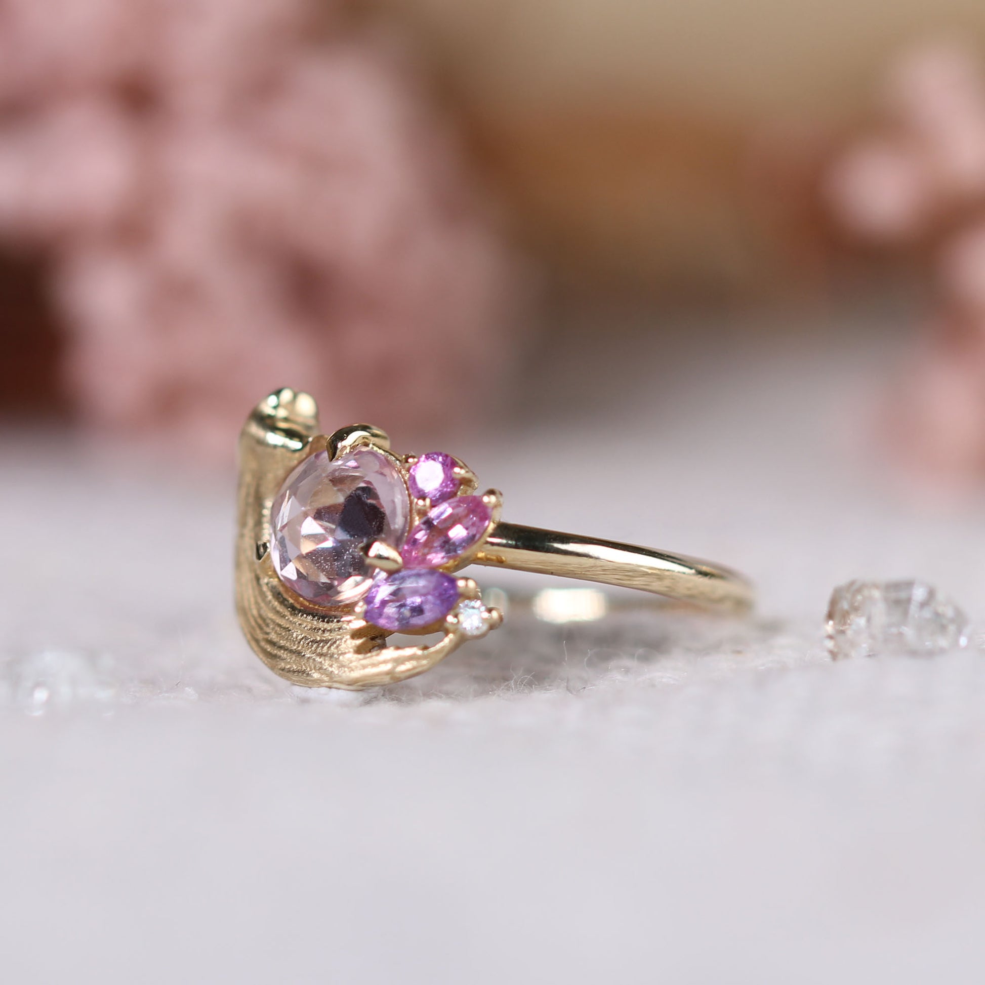A tender tribute to the beauty of golden moments, the Potter’s Pink Ring centers a pale, rosy sapphire atop a satiny brushstroke. Sweet pink and purple sapphires, accented with sparkling white diamonds, form a dreamy palette that reflects the delicate textures of Le Conte’s Impasto Collection.