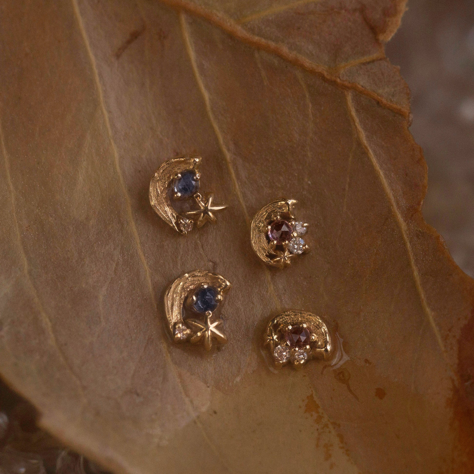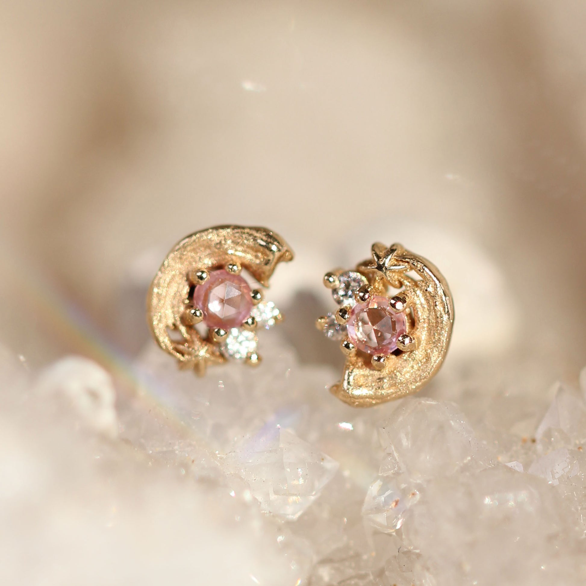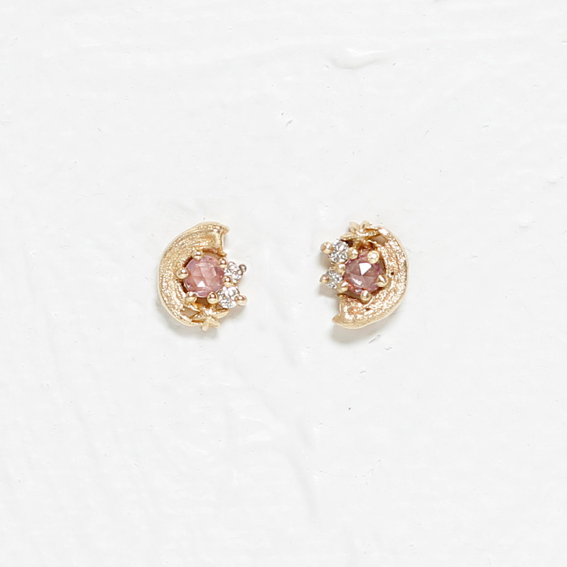 The Potter’s Pink Earring is an ode to artistry, featuring a blush-pink sapphire, a radiant golden star, and sparkling white diamonds. With a satiny gold brushstroke texture, this enchanting design twinkles with every movement.
