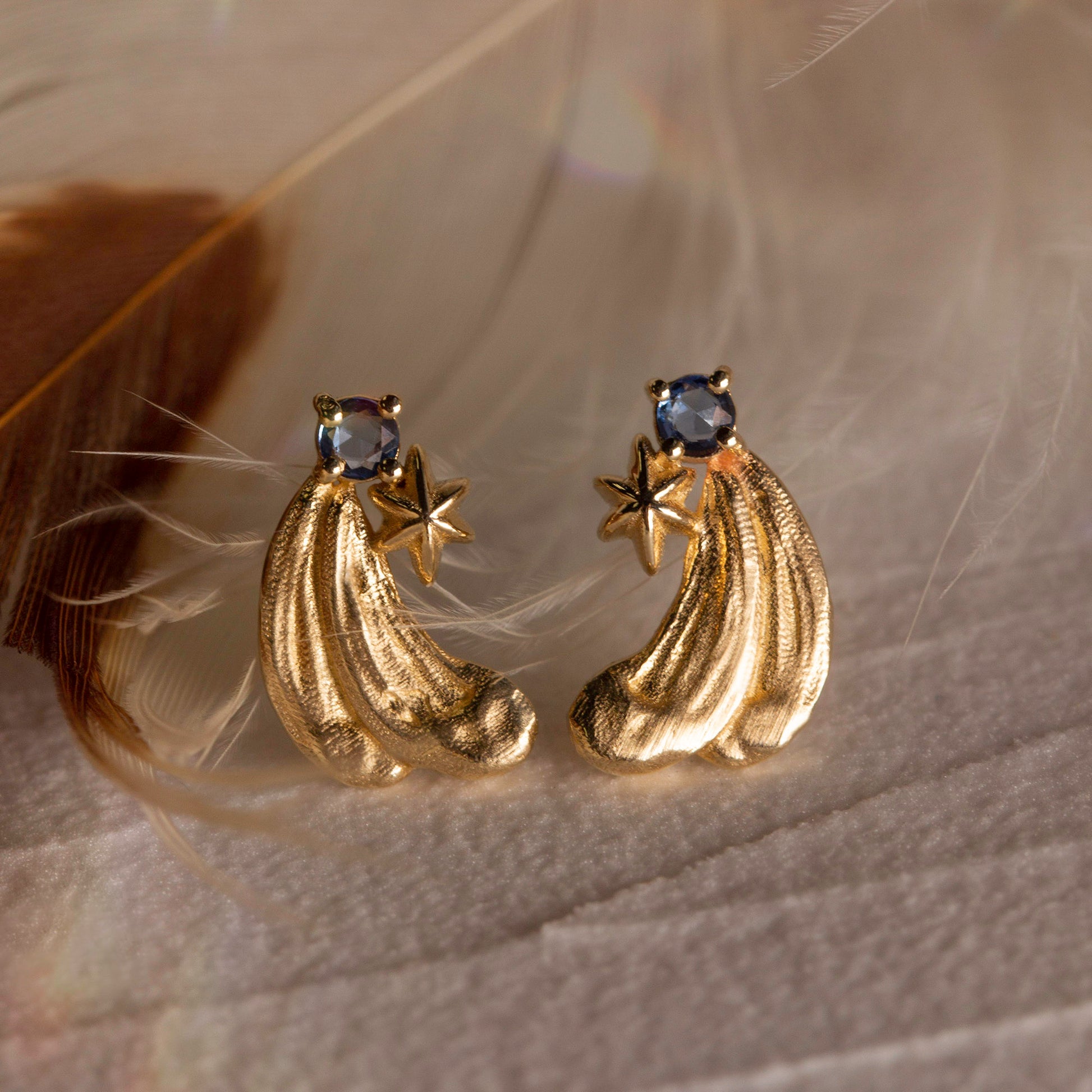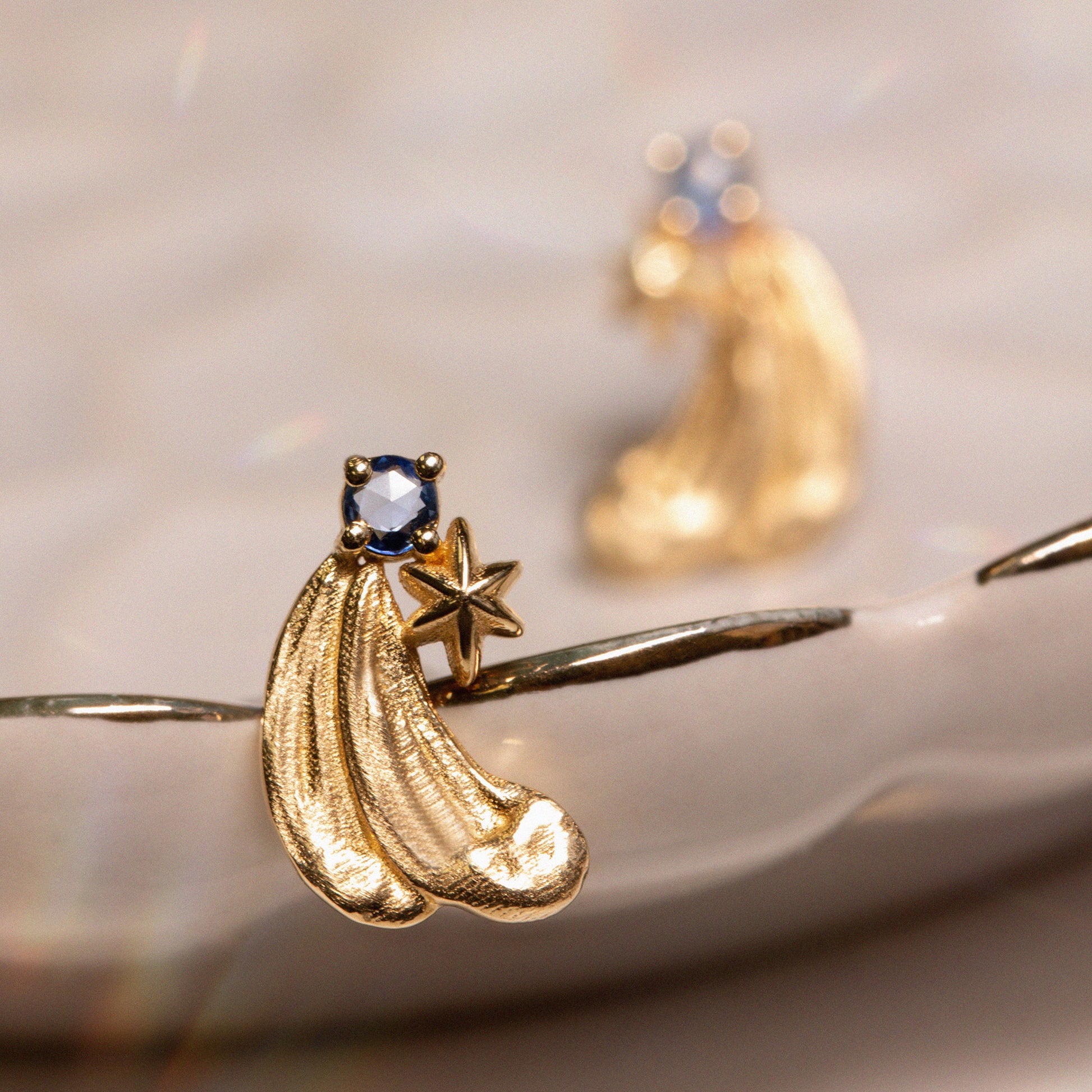 Inspired by Van Gogh’s swirling starry skies, the Prussian Blue Earring captures the beauty of celestial dreams. A prussian-blue sapphire glimmers alongside a plump golden star, as layered brushstrokes of gold flow elegantly beneath.