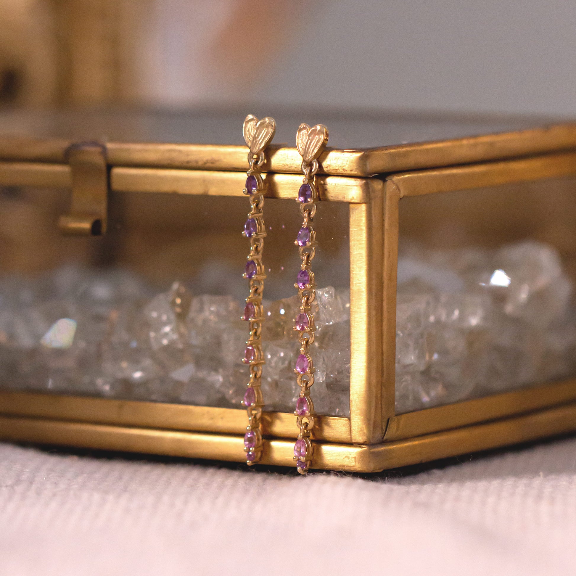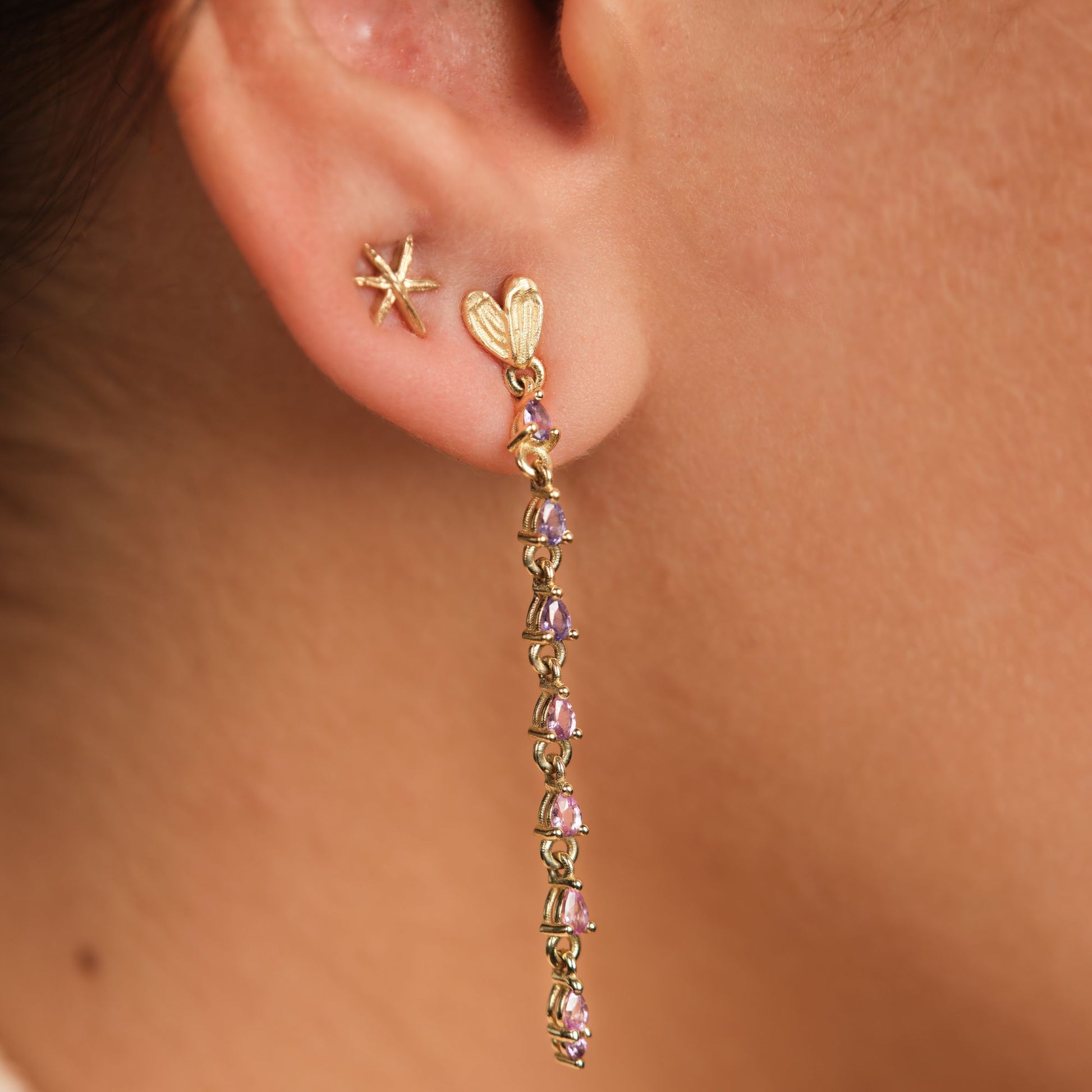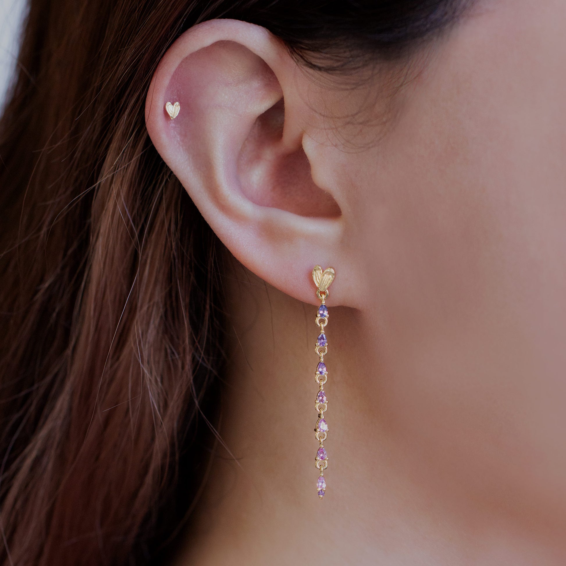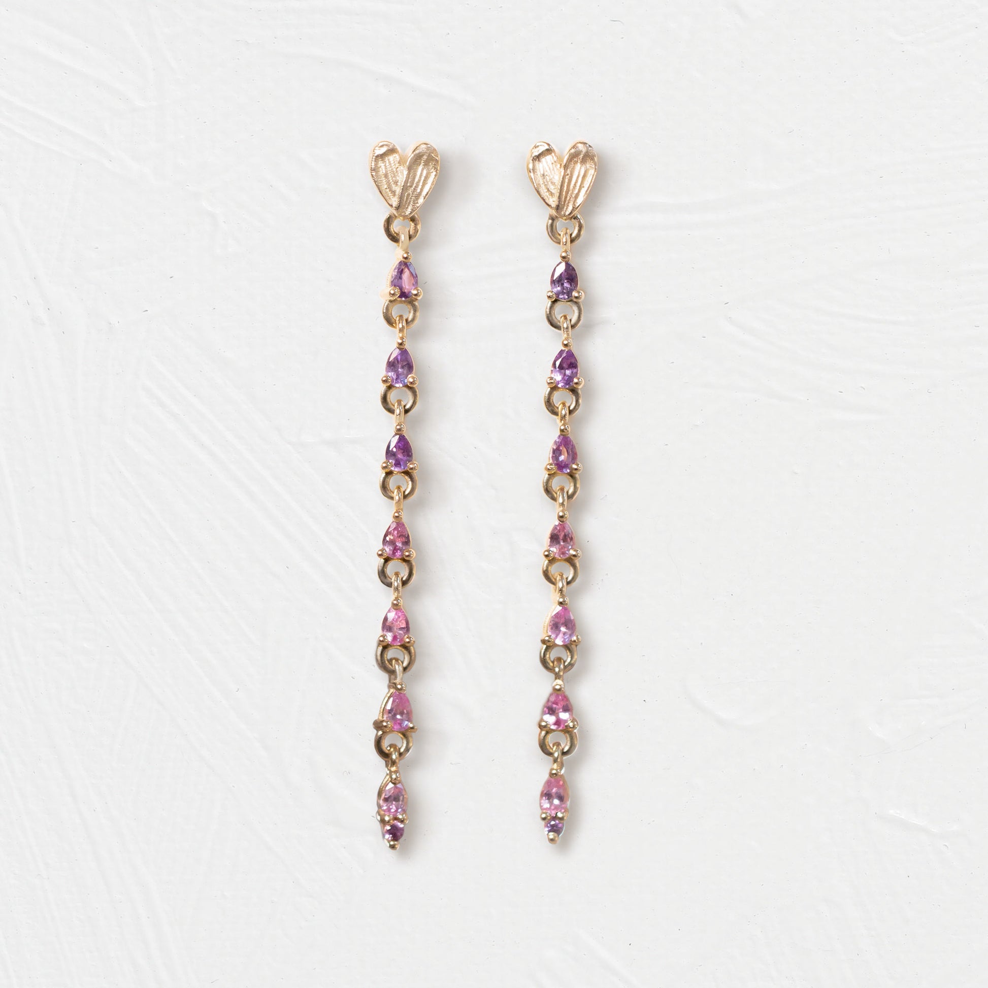 A love letter to feminine romantics, the Purple Palette Earring is an enchanting design with a cascade of pear-shaped purple and pink sapphires flowing gracefully from a golden heart of creamy brushstroke textures. These dangling earrings are designed to celebrate elegance and charm, wrapping you in a soft, artistic glow.