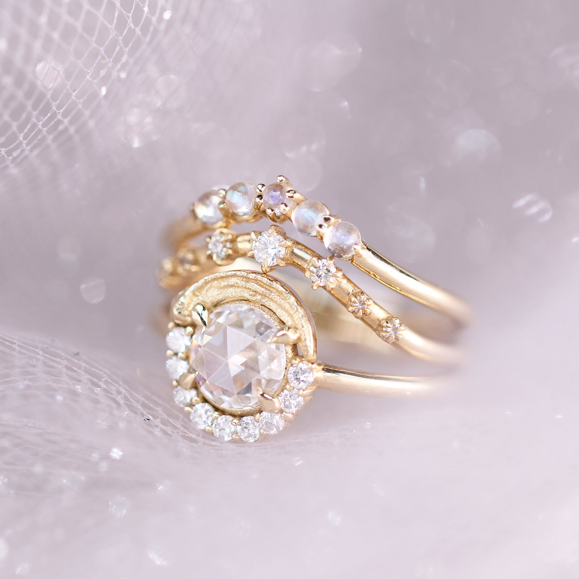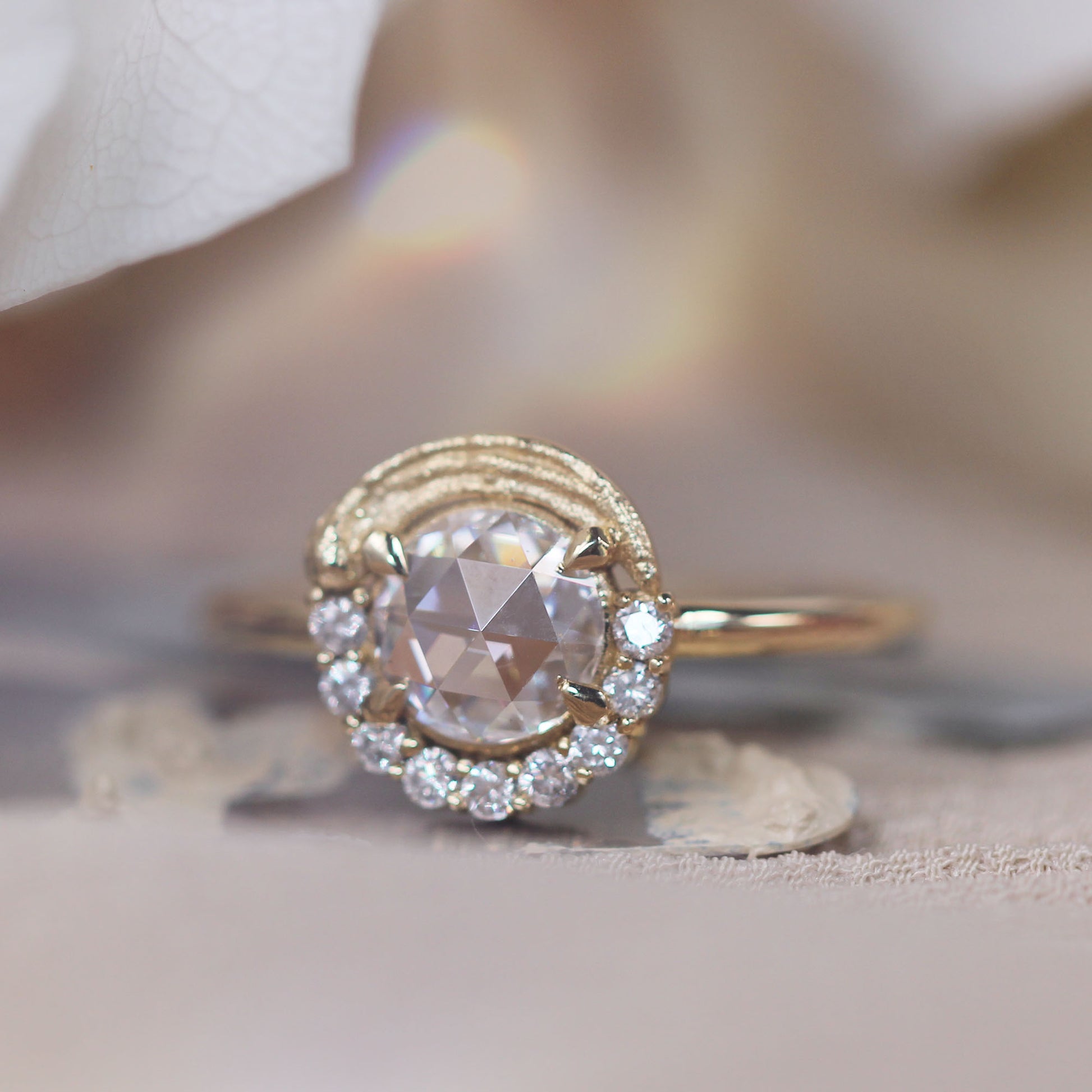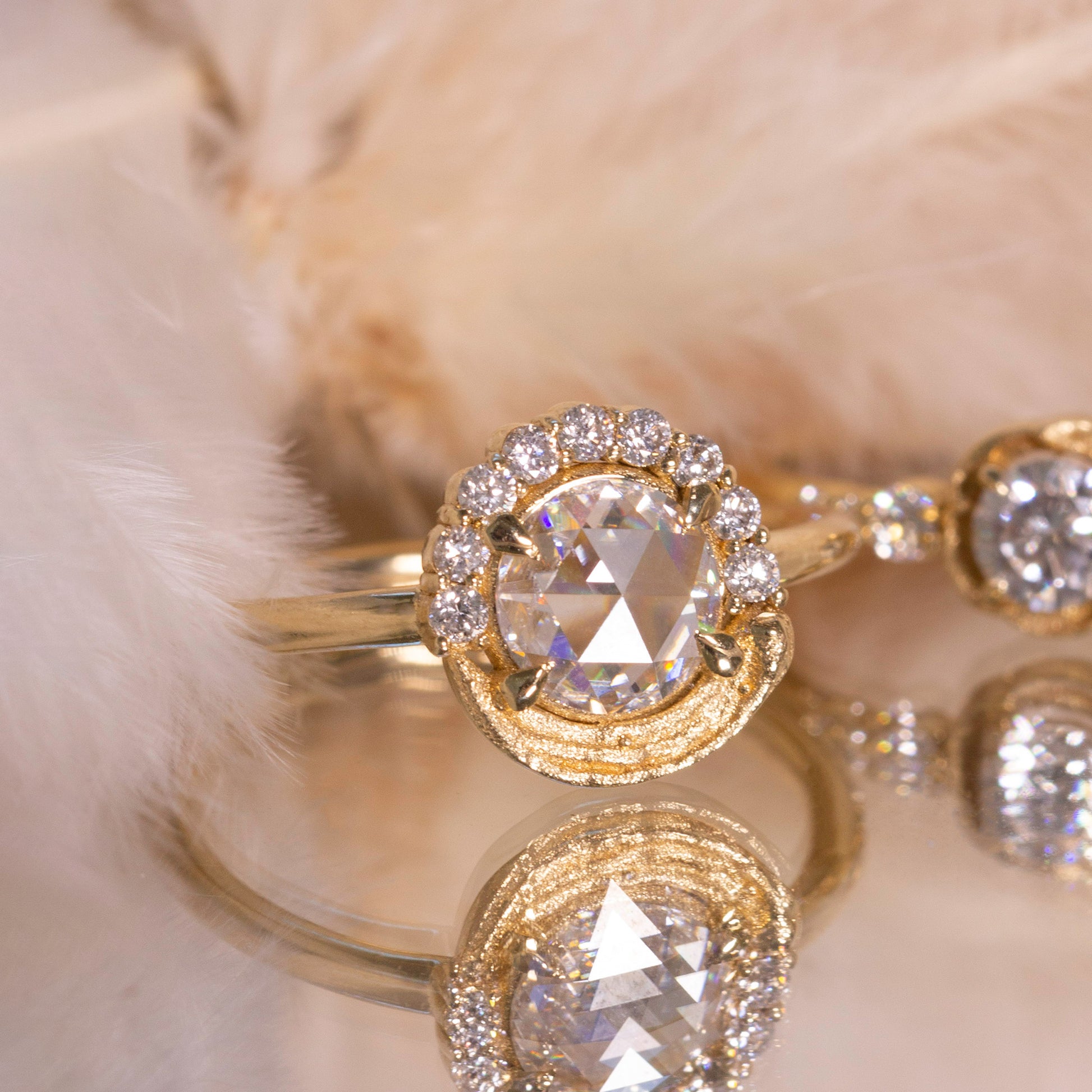 The Renoir captures Pierre-Auguste Renoir’s textured brushstrokes with nine brilliant round diamonds encircling the center diamond to create a lustrous golden halo. This design is a bold yet timeless option for an engagement ring or a vintage-inspired heirloom.