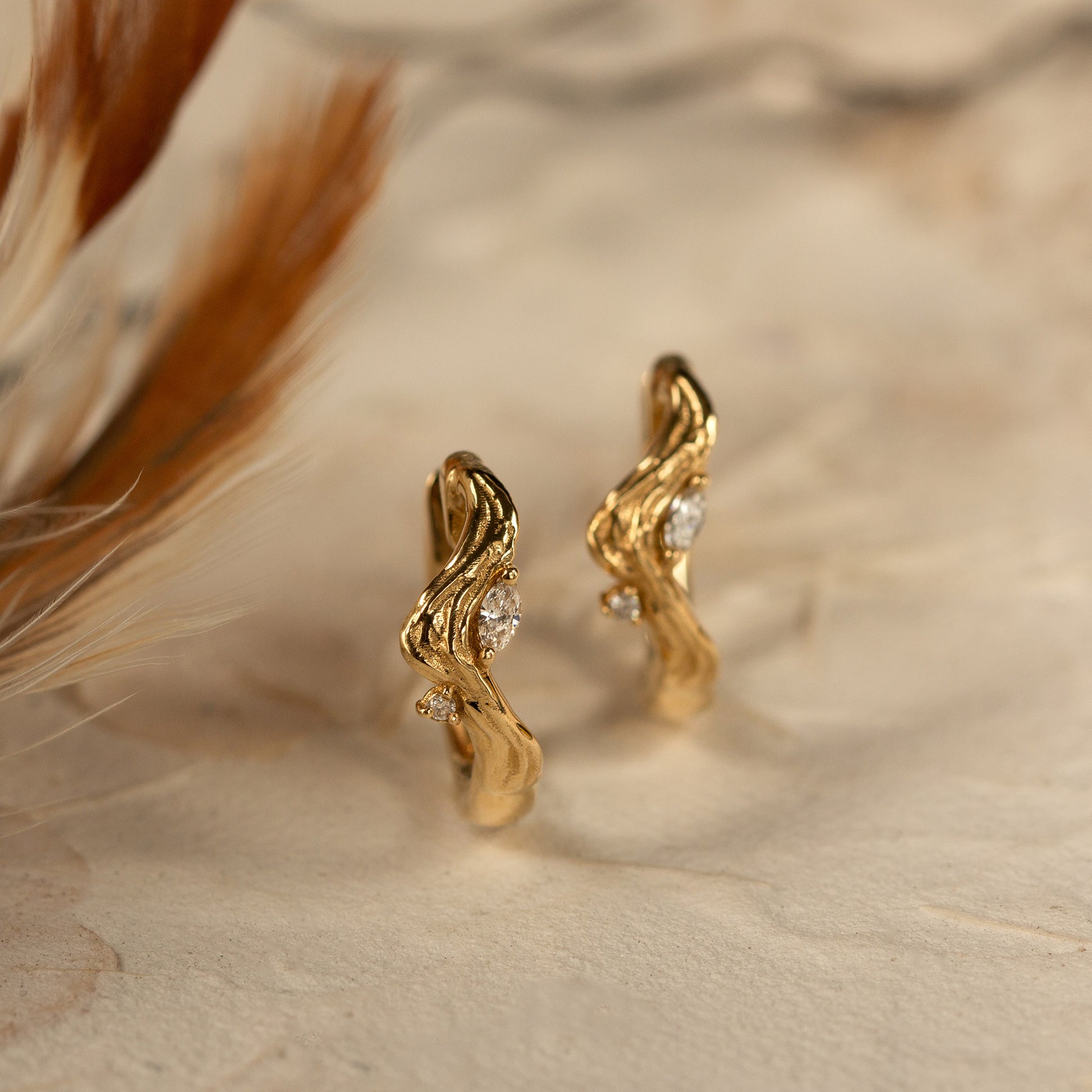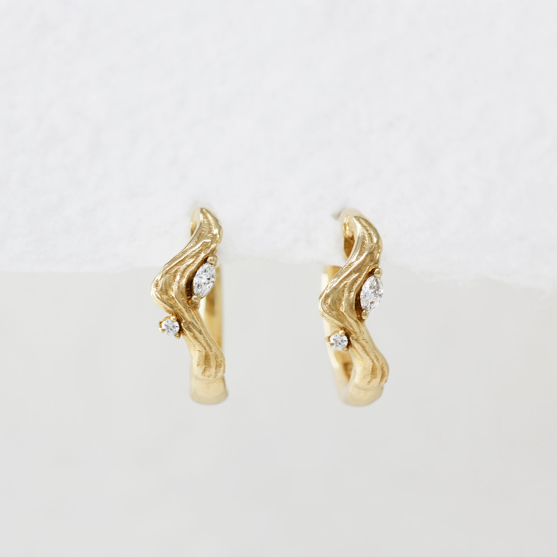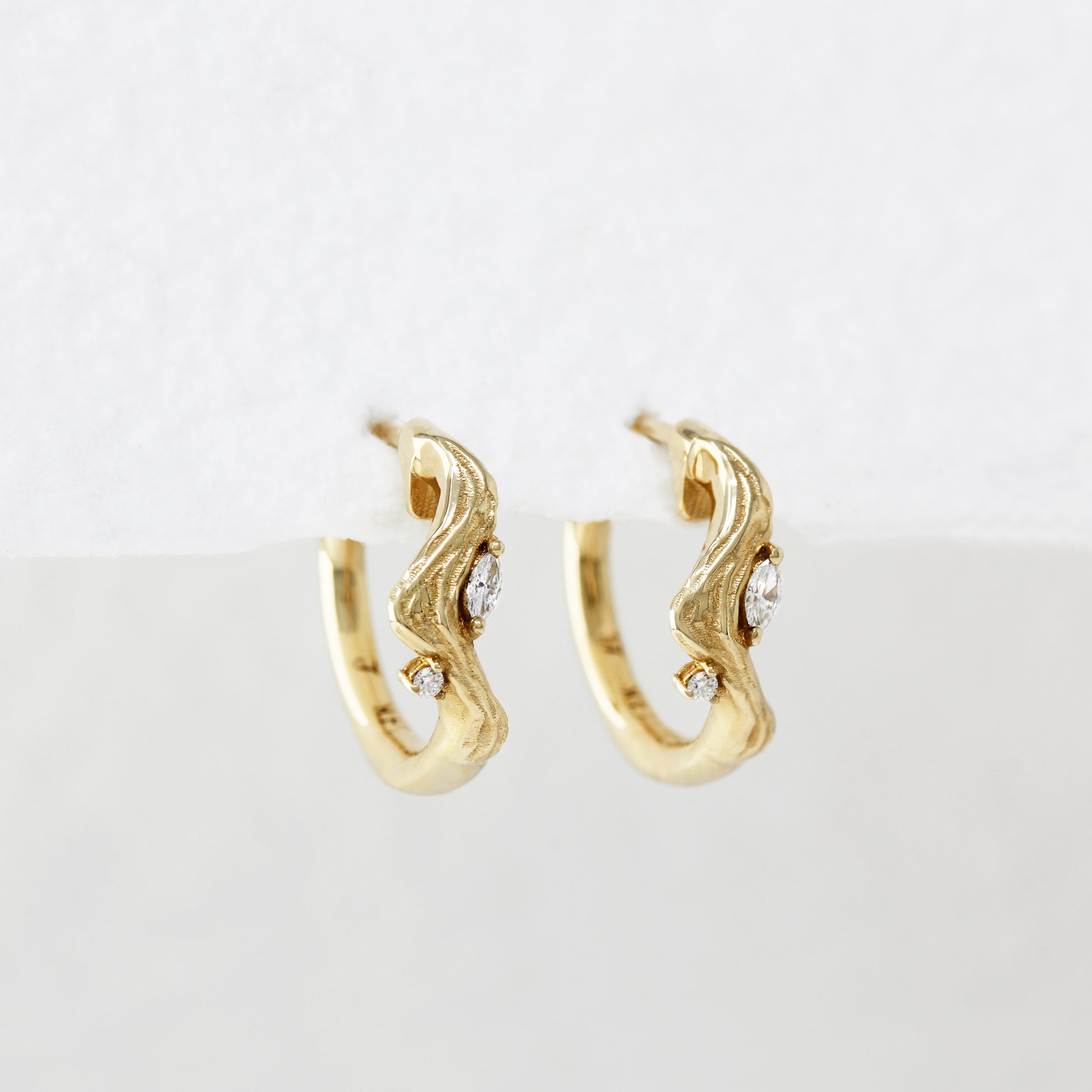 Inspired by Renoir’s delicate, wispy brushstrokes, the Renoir Breeze Hoop Earring features feathery textures in creamy gold, adorned with glistening marquise and round diamonds nestled within the folds of its sculptural design. This graceful piece captures the fleeting beauty of light and movement, perfect for elevating any look with timeless artistry.