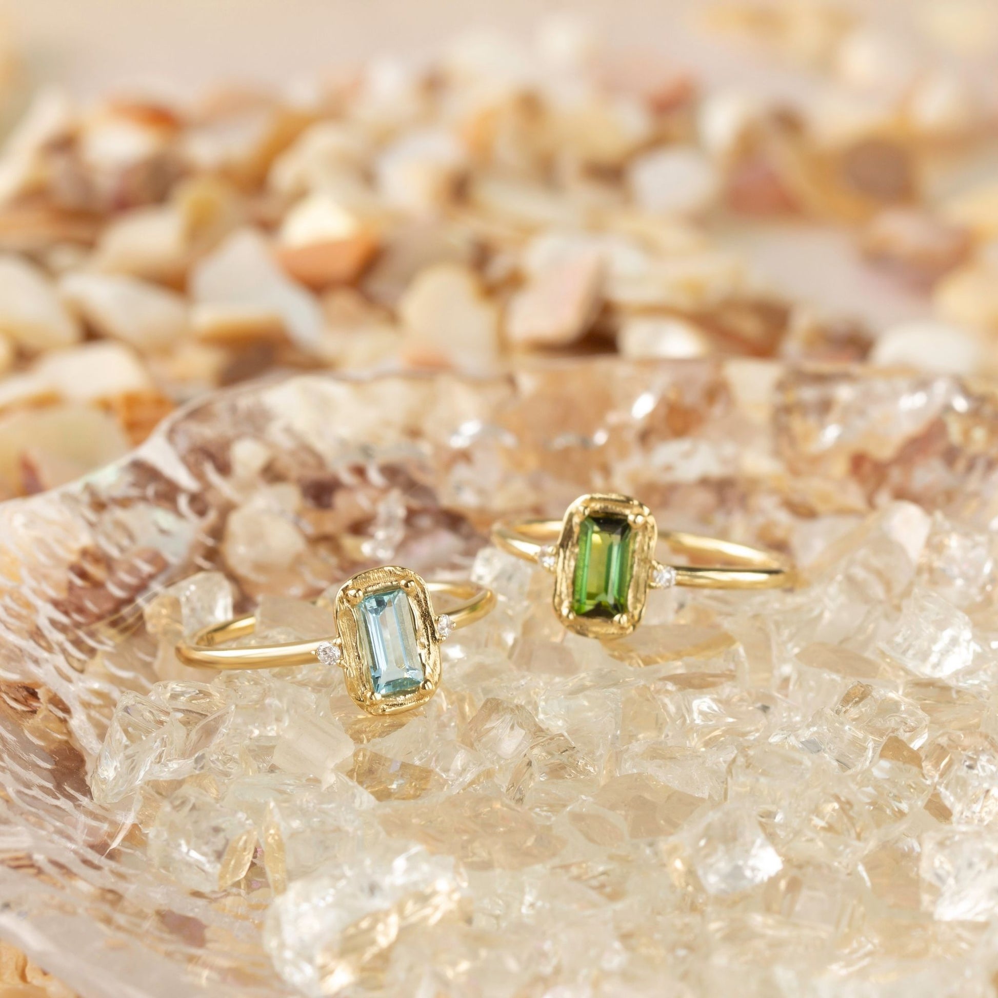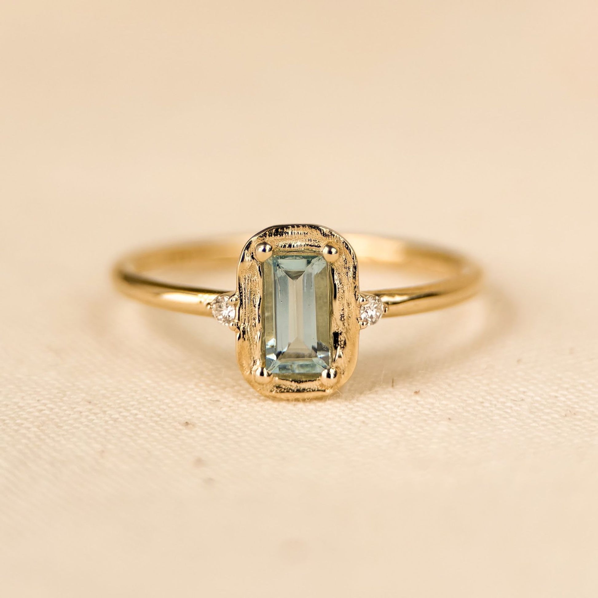 Take a quiet stroll along the shoreline, where ocean mist softens the horizon and light dances on the waves. The Seamist Blue ring is a tranquil composition of aquamarine, delicate diamonds, and warm 14K gold, capturing the ephemeral beauty of the sea’s embrace. At its center, the aquamarine glows with serene, dreamlike clarity, flanked by two diamonds that shimmer like droplets suspended in morning air. Soft and luminous, this piece is an homage to nature’s calmest moments.
