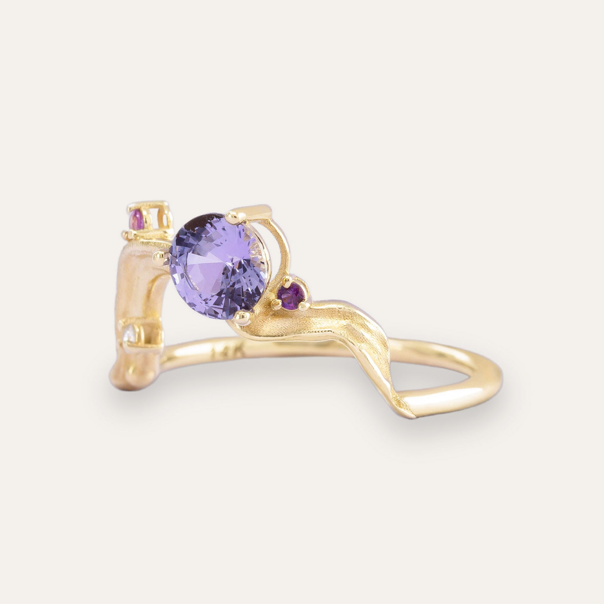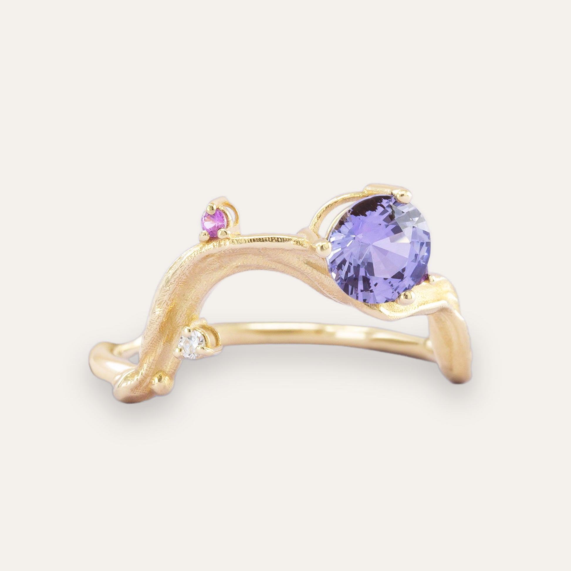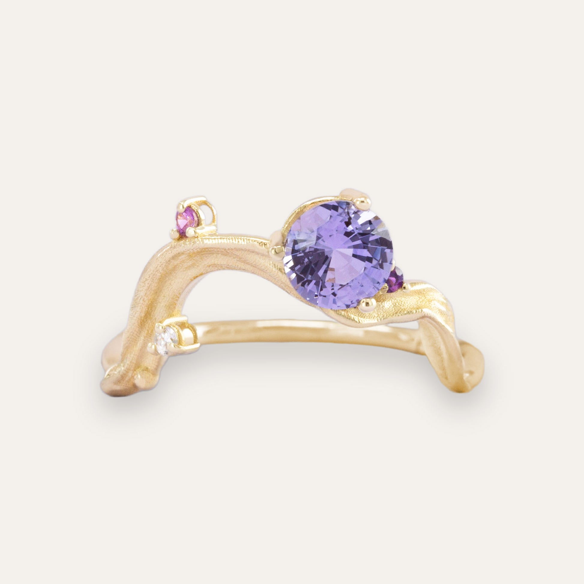 For every dream, there’s a burst of imagination. The Sugar Plum, adorned with purple and violet sapphires and a sparkling diamond, embraced by a bold brushstroke texture, stirs up the magical wonders of whimsical artistry.