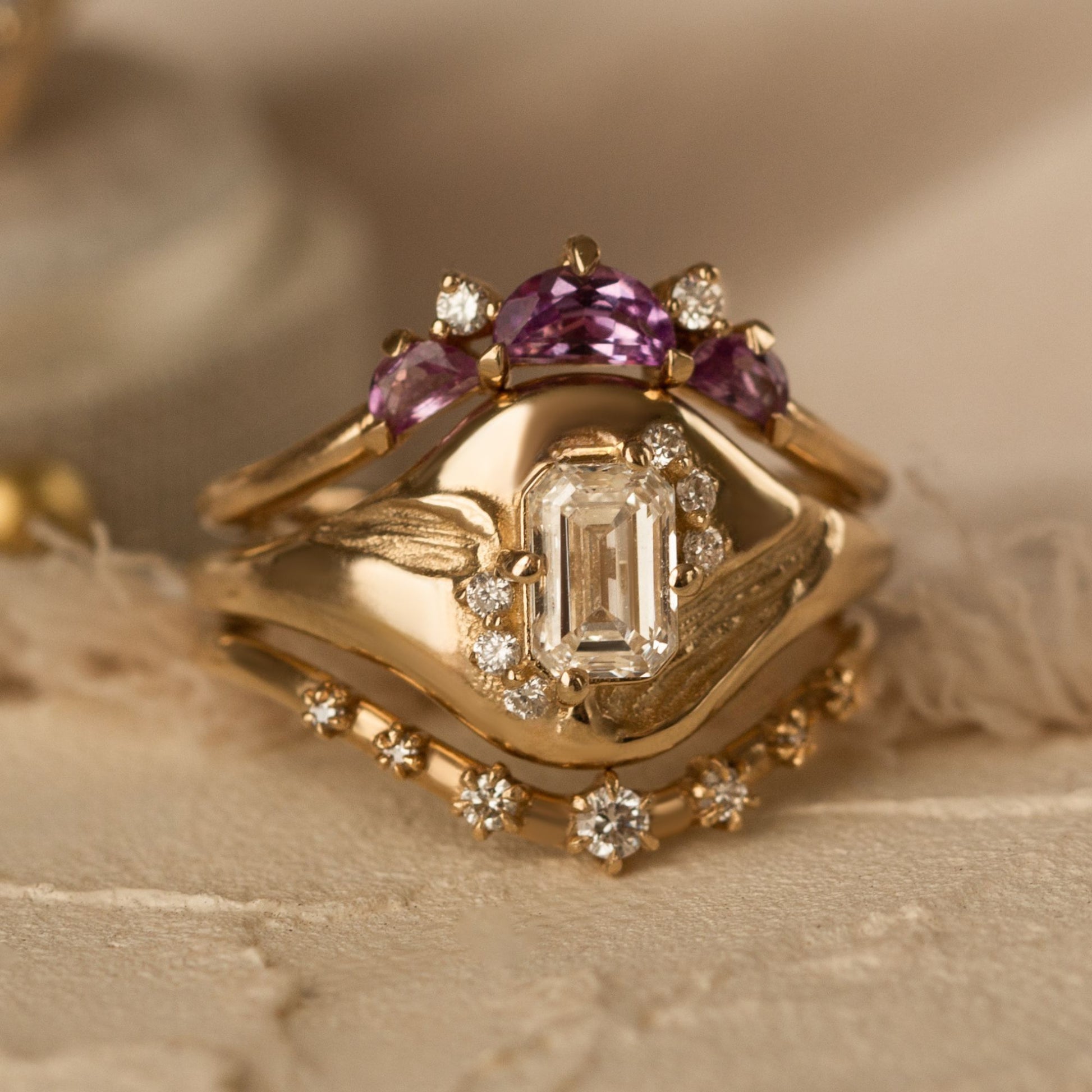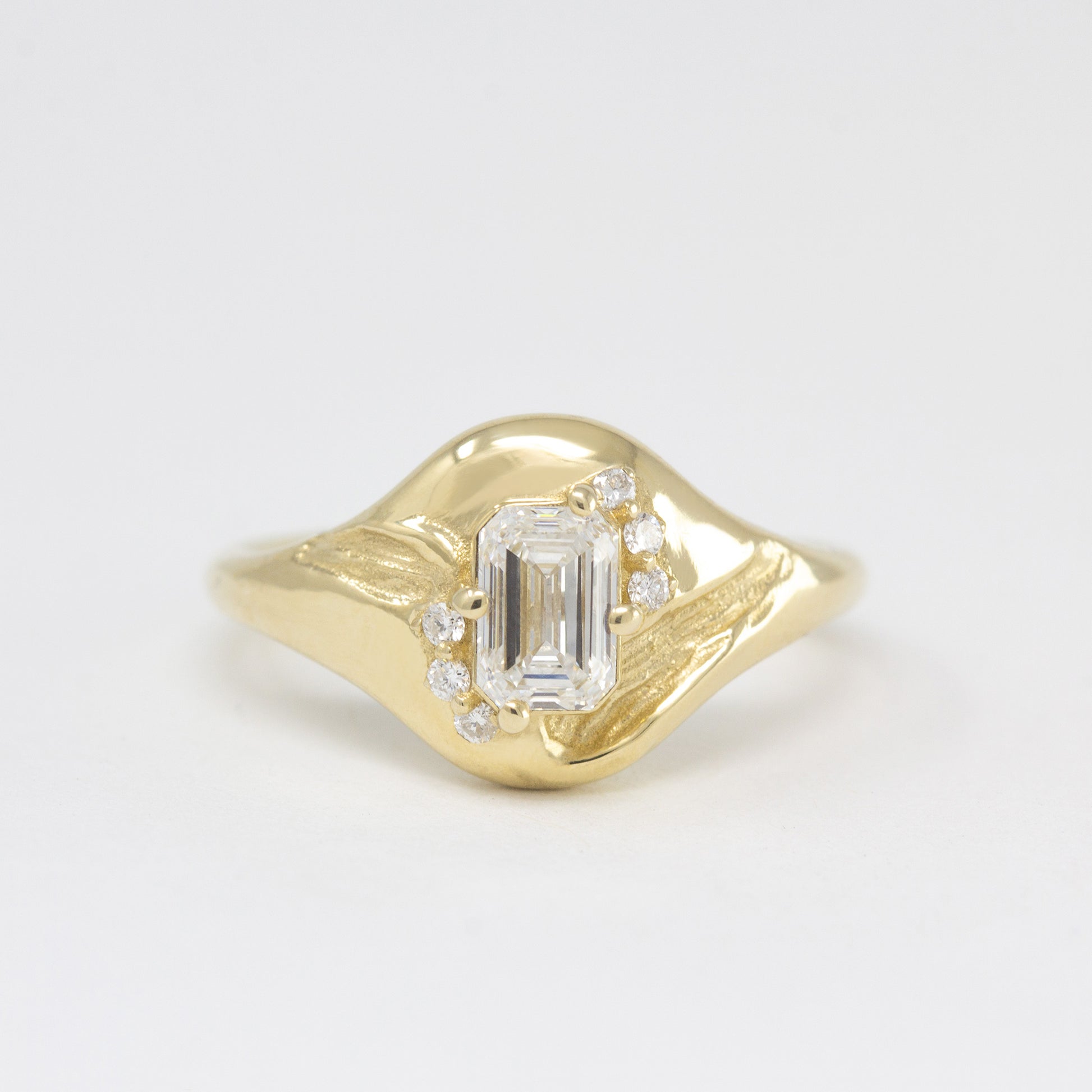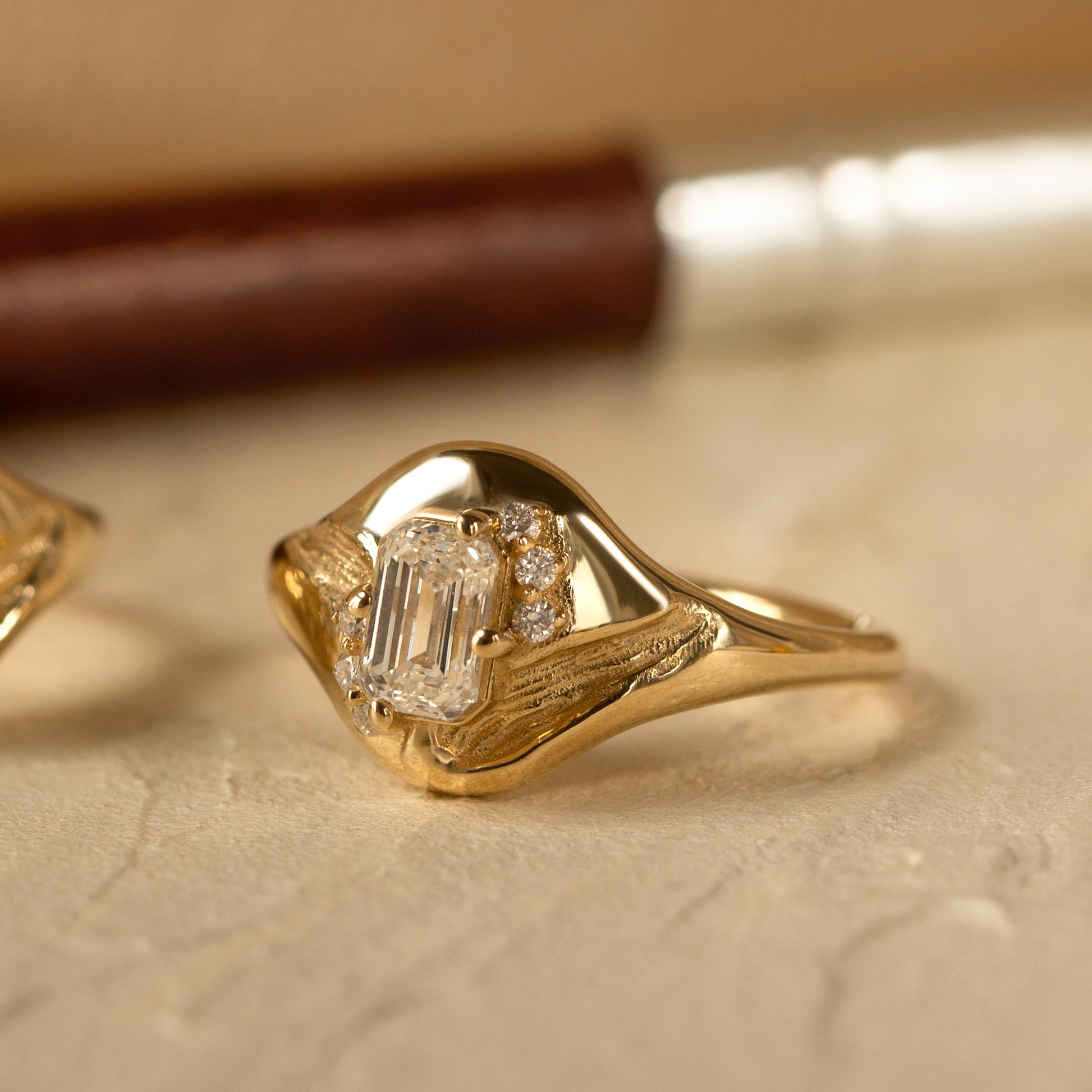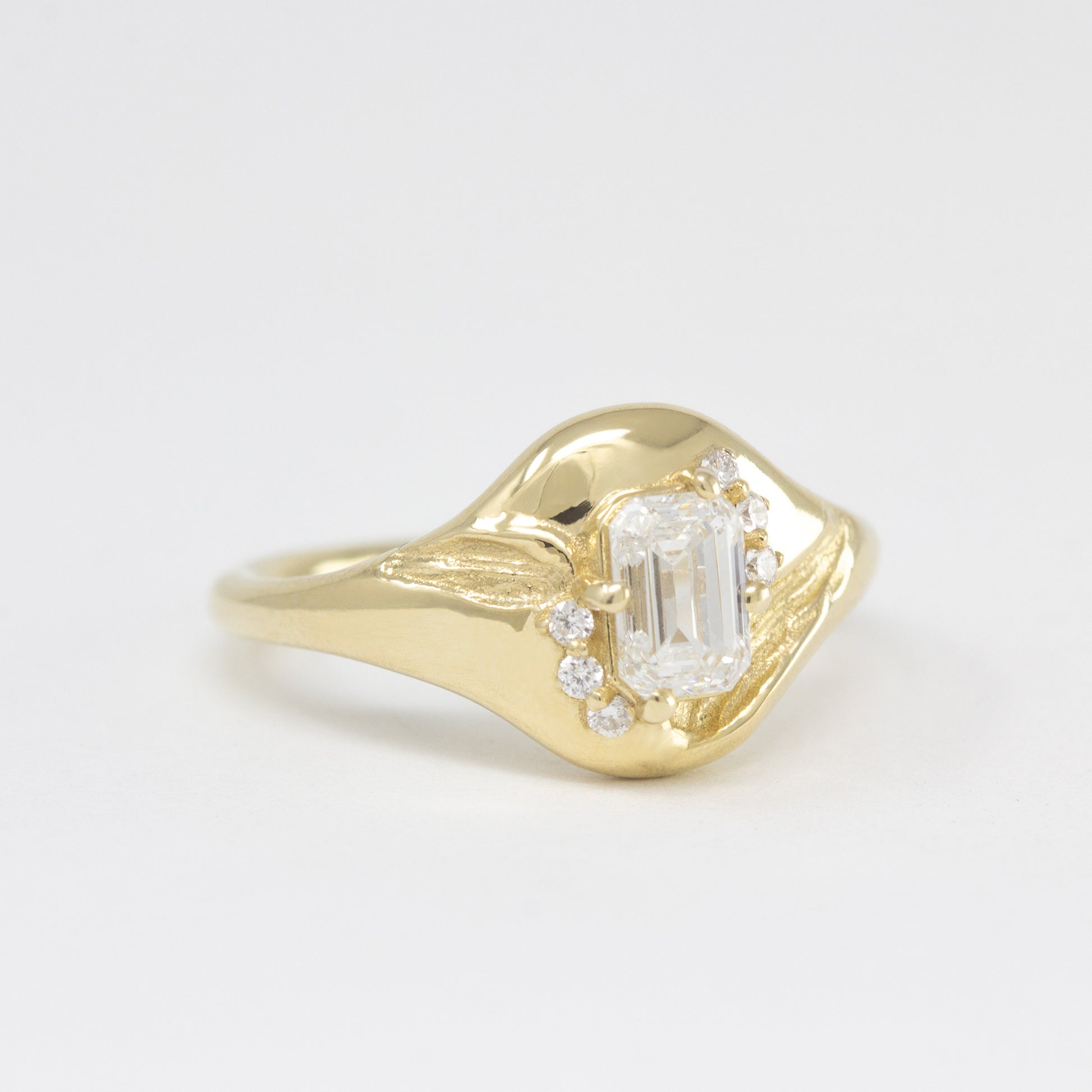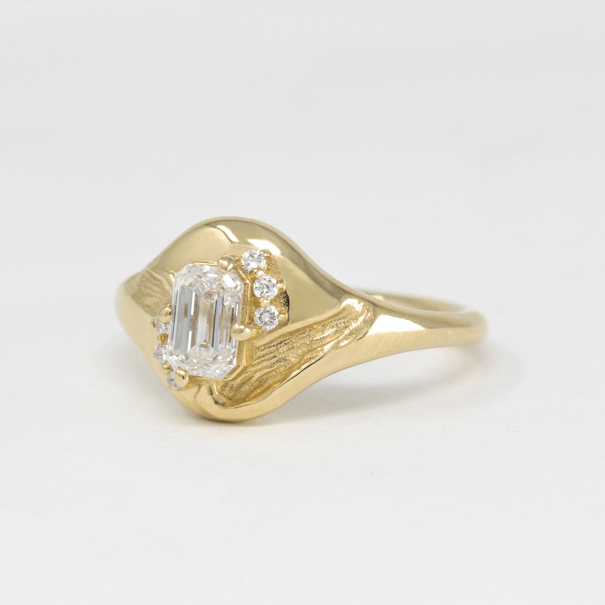 The Tales on Canvas is a buttery-smooth signet ring showcasing a radiant emerald-cut diamond at its center, framed by six sparkling round diamonds and two creamy, inverted brushstrokes along the sides. This bold and versatile design offers a unique choice for engagement or a meaningful gift for self-expression, blending comfort with timeless elegance.