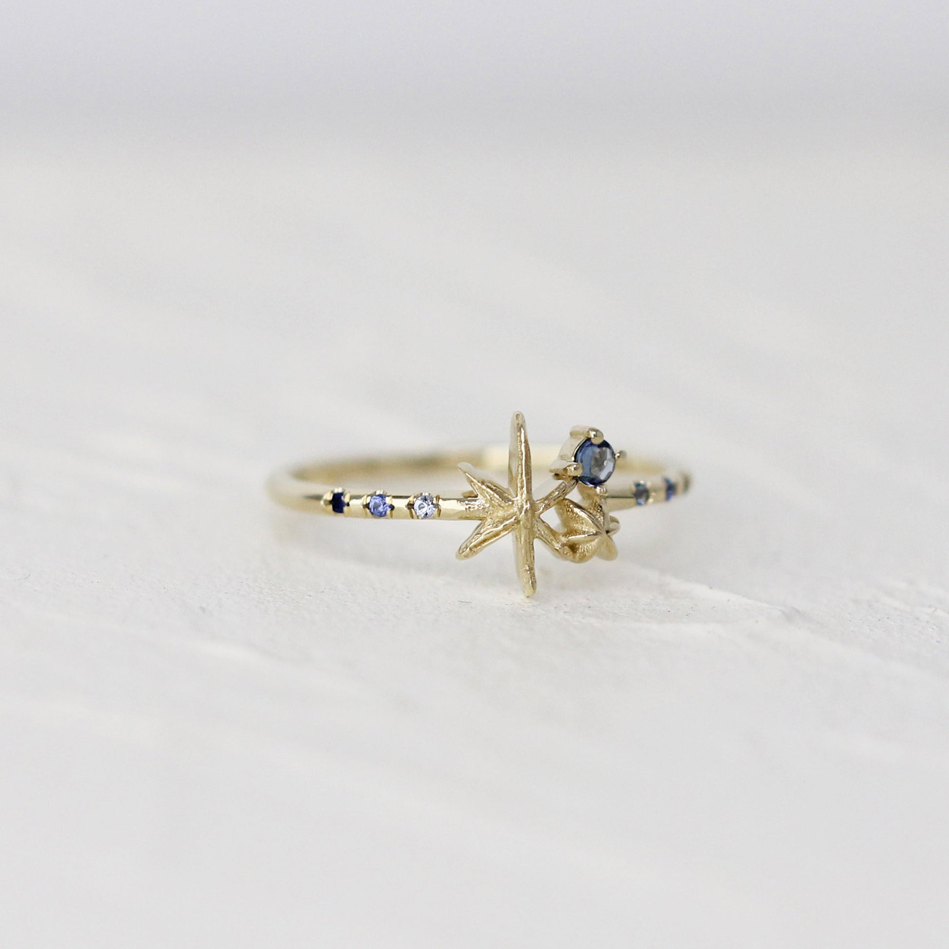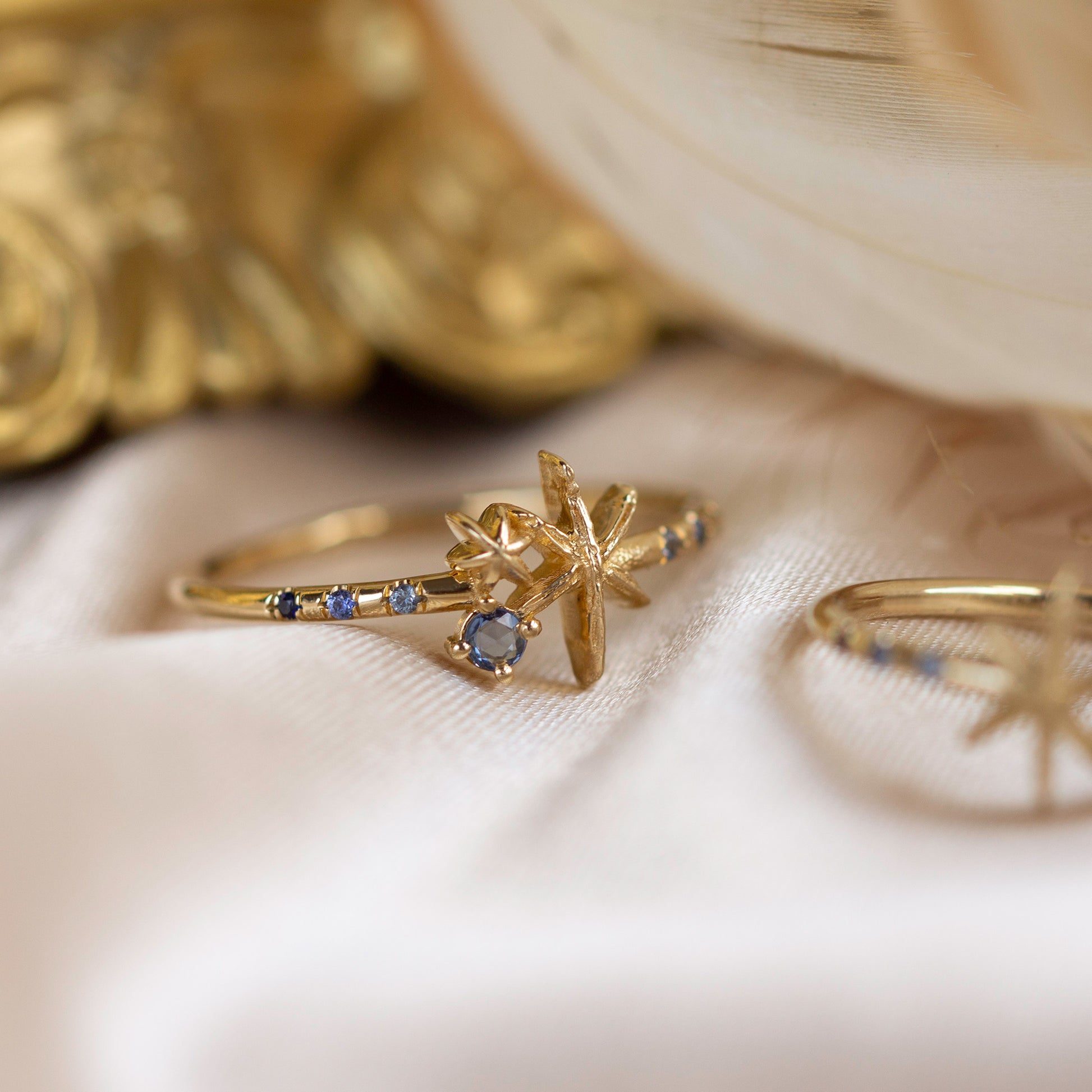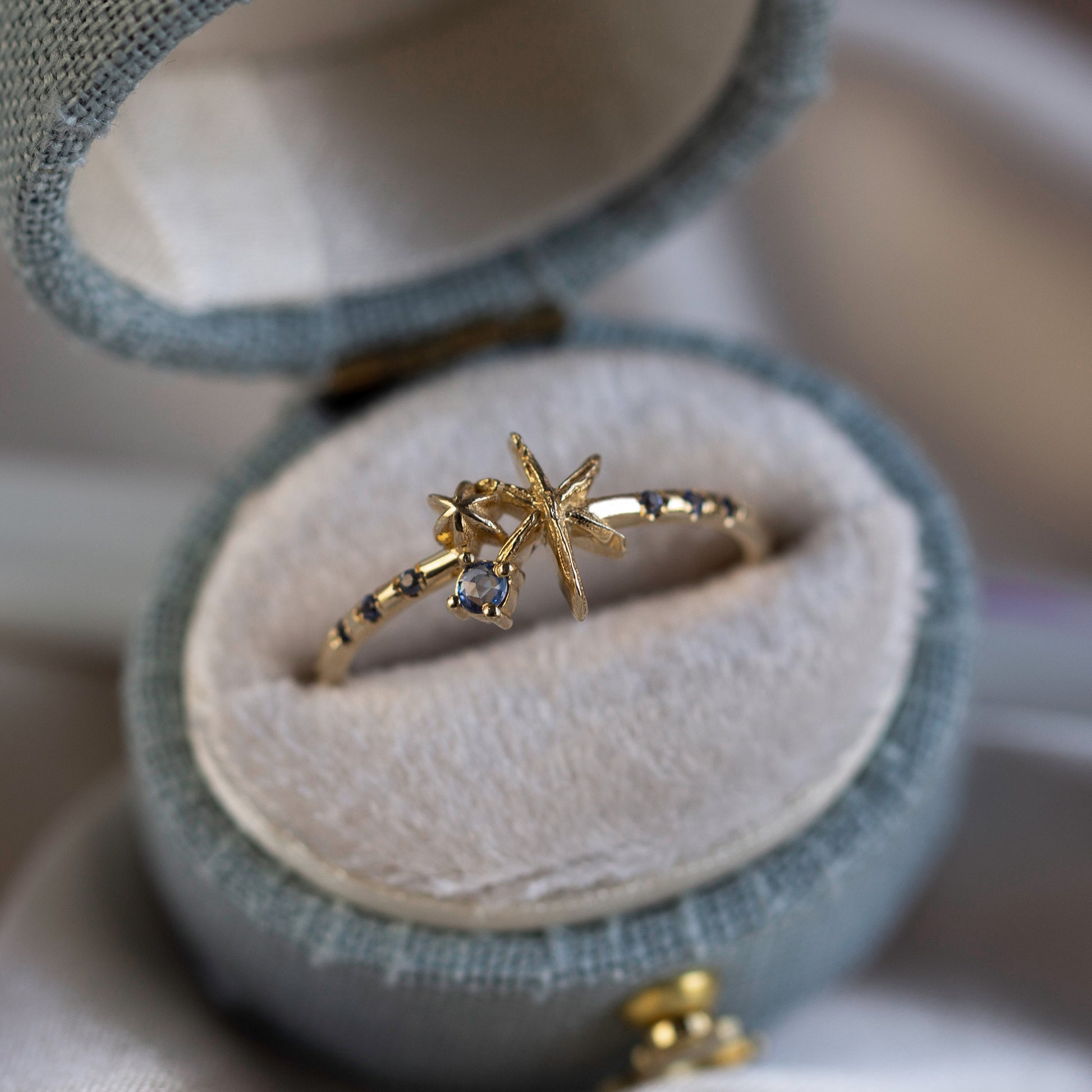 Inspired by the dreamy expanse of Van Gogh’s ethereal night skies, the Twilight Sky is a poetic tribute to celestial beauty. A smooth, plump star and a cobalt-blue sapphire sit next to a radiant, gold, brushstroke-textured star at its center. The shoulders glisten with a gradient of blue sapphires, creating a delicate and enchanting piece for nocturnal dreamers and artists alike.