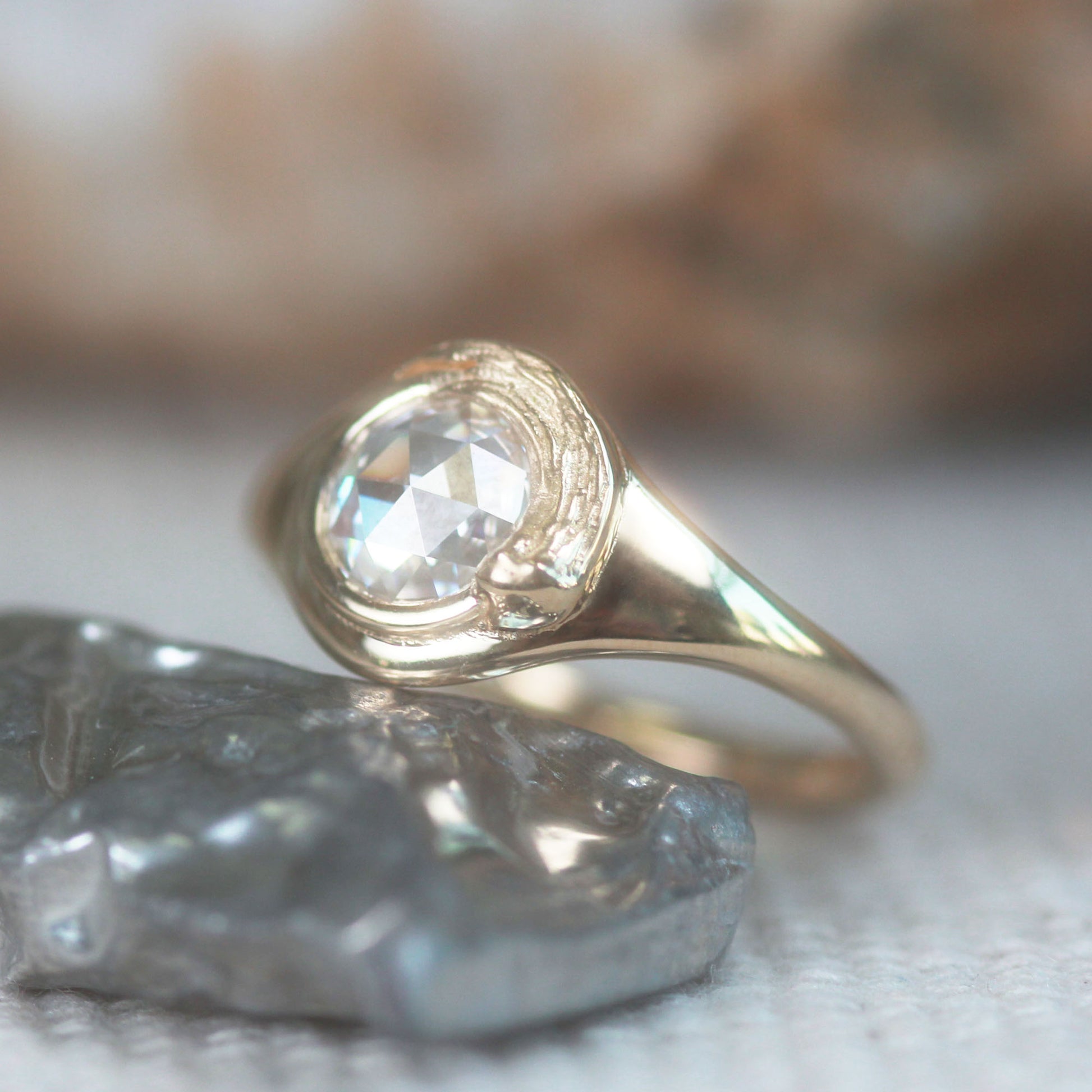 - Center Stone: G/H VS-SI White Rose Cut Round Diamond 6 mm 0.65 ctw