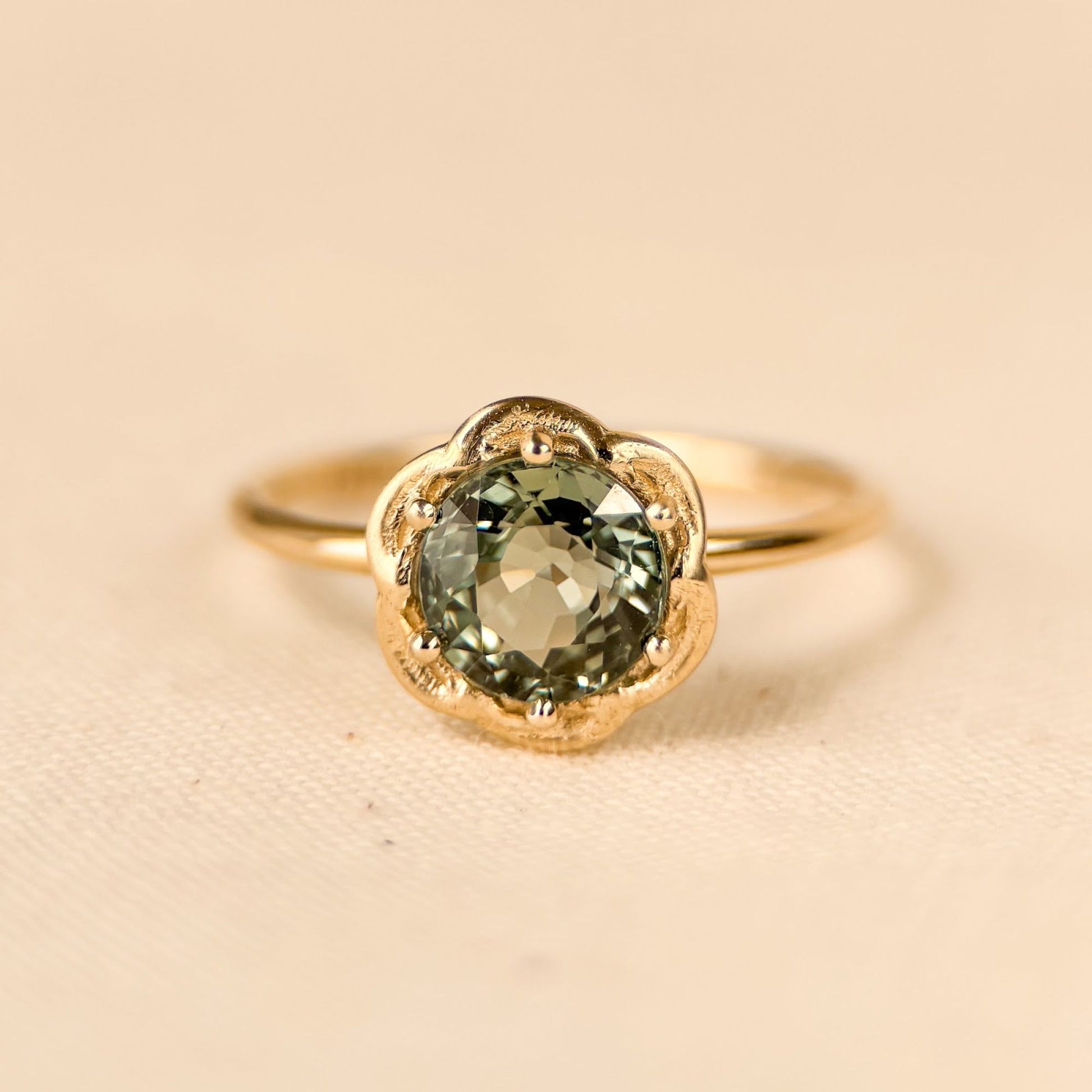 In the heart of a Parisian garden, where fresh blossoms emerge and greenery unfurls beneath a warming sun, the air stirs with the quiet promise of spring. The Verdant Bloom ring captures this awakening—a rich, round green sapphire, deep and radiant, set in glowing 14K gold. It reflects the lush textures of foliage in full flourish, embodying the beauty of renewal and the graceful poetry of new beginnings.